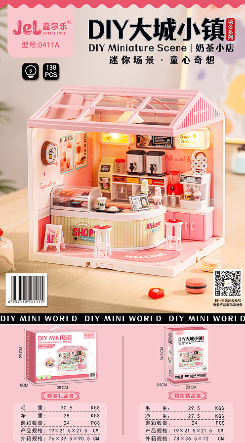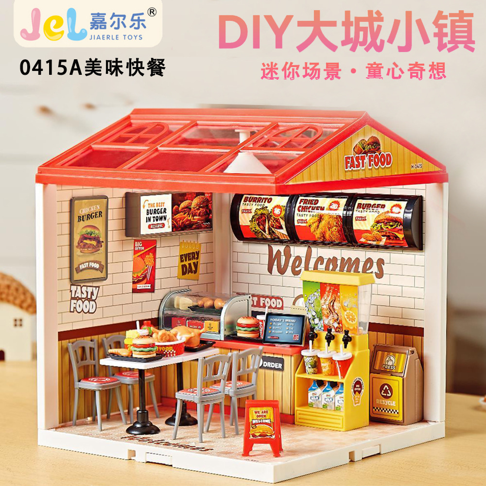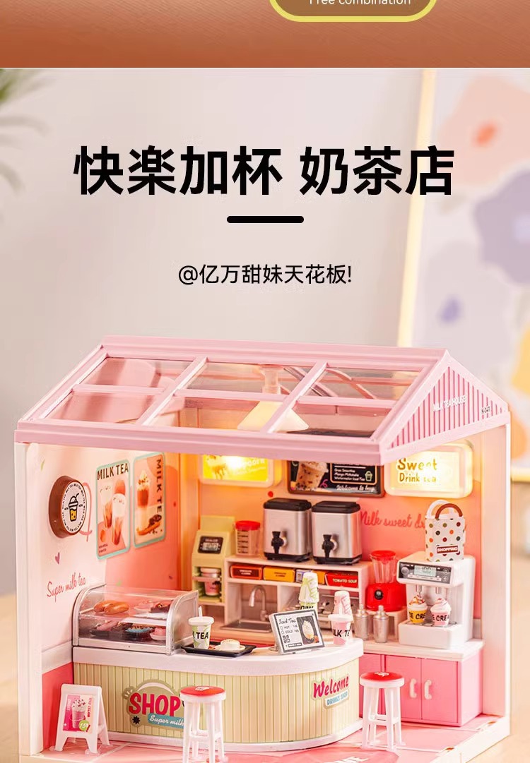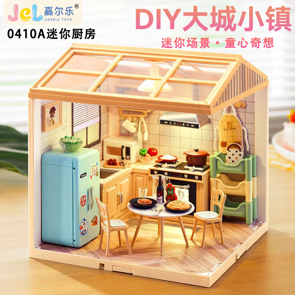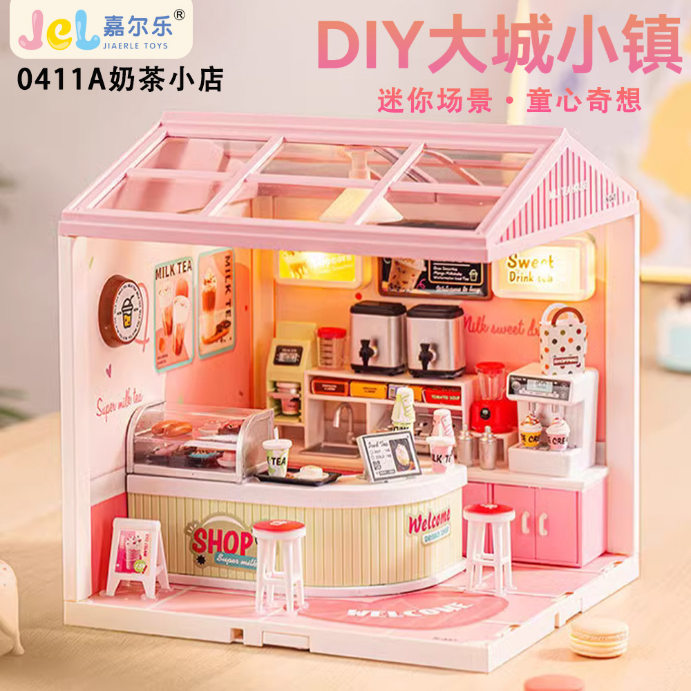 Jiaerle 도시 마을 미니 주방 밀크티 가게 diy 손으로 조립 된 오두막 장면 장난감 소녀