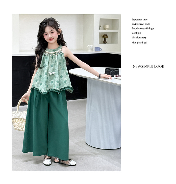 여자 여름 세트 2025 새로운 cuhk 어린이 달콤한 캐주얼 웨이브 포인트 교수형 목면 넓은 다리 바지 투피스 세트
