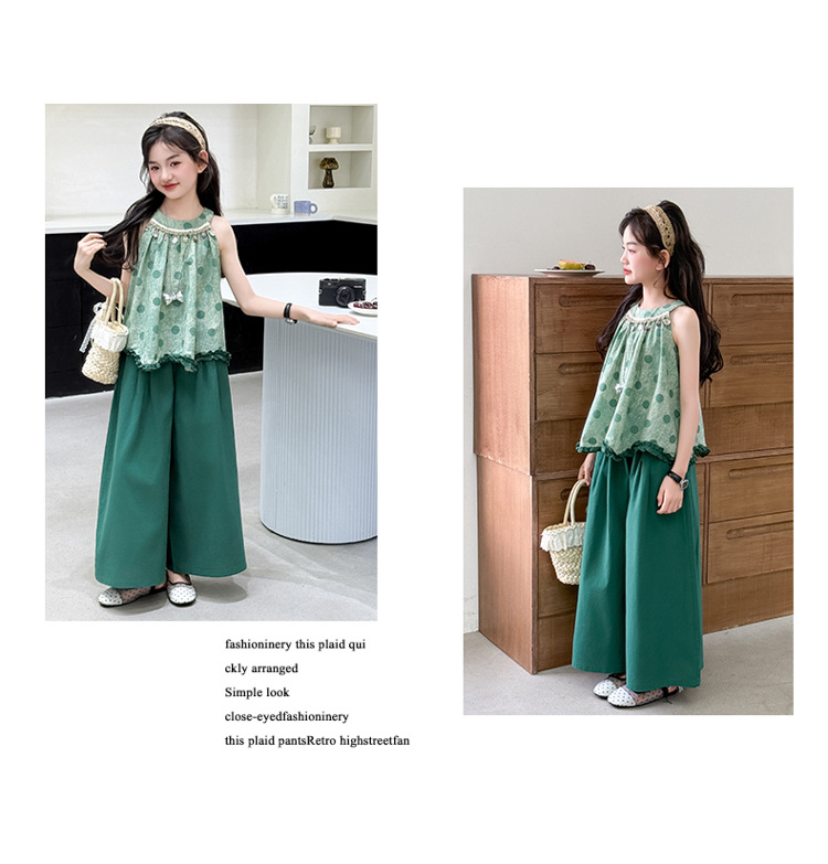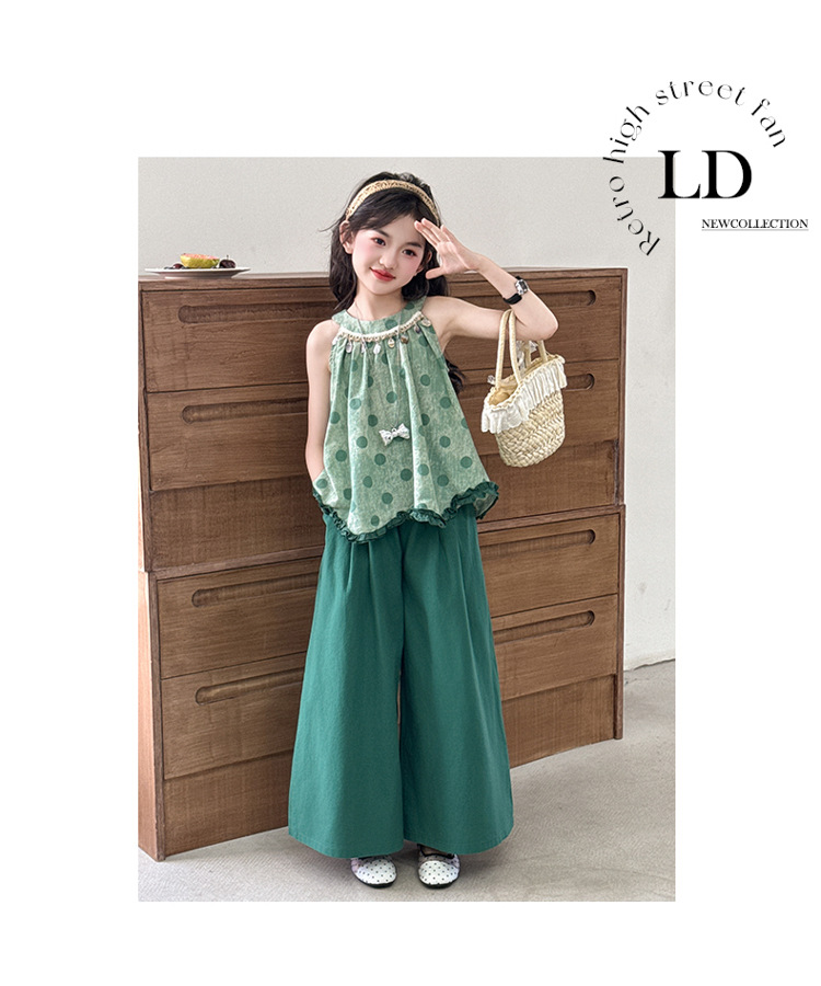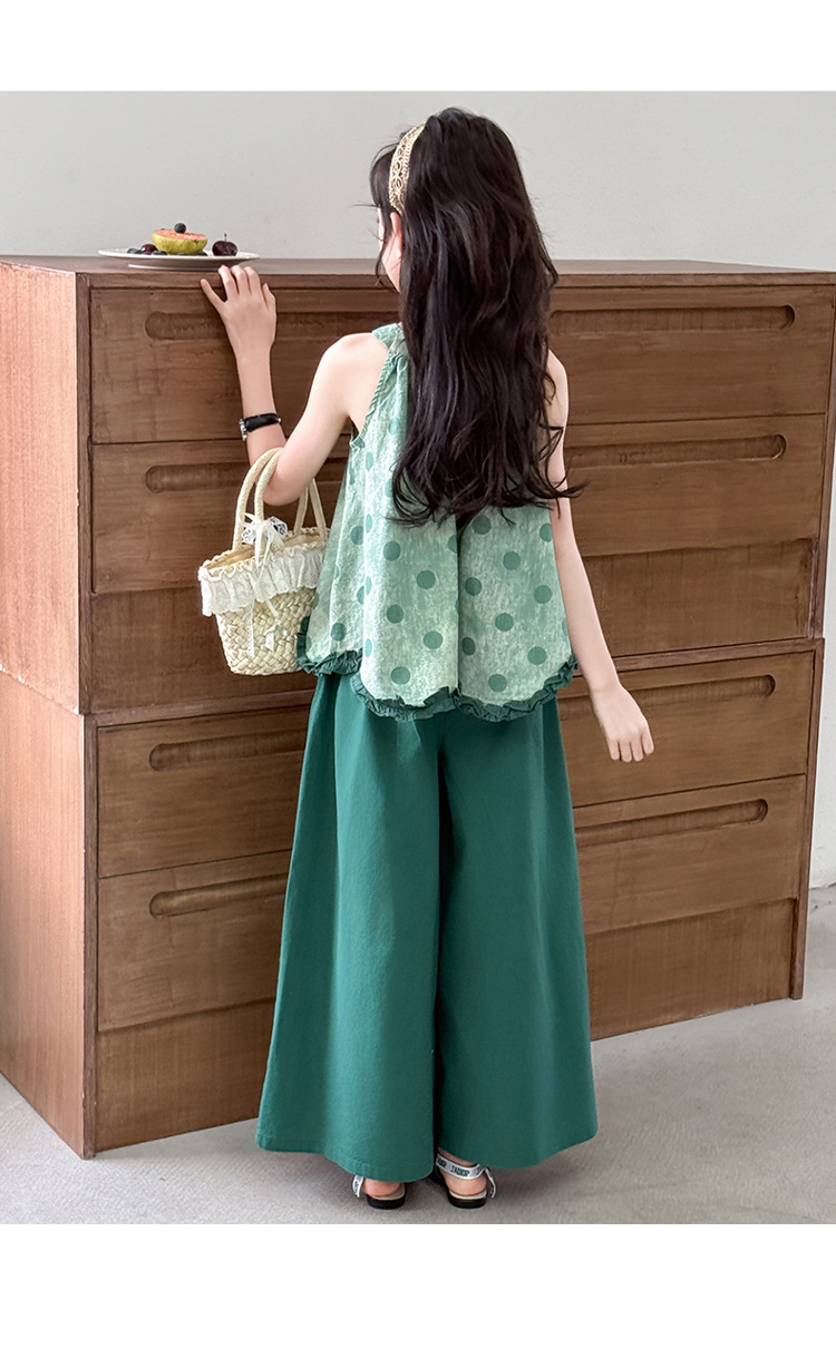여자 여름 세트 2025 새로운 cuhk 어린이 달콤한 캐주얼 웨이브 포인트 교수형 목면 넓은 다리 바지 투피스 세트스토어 가기
