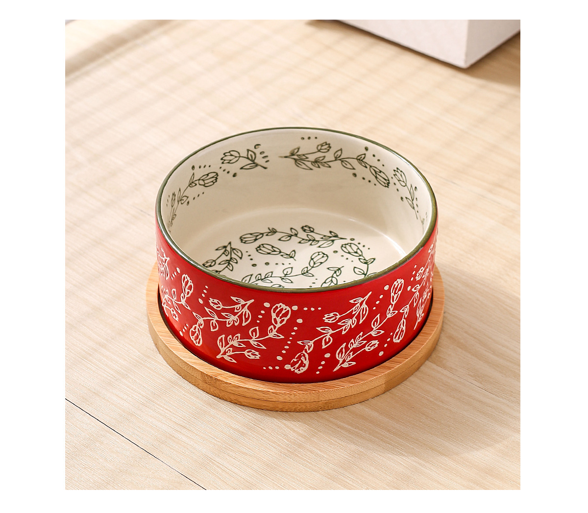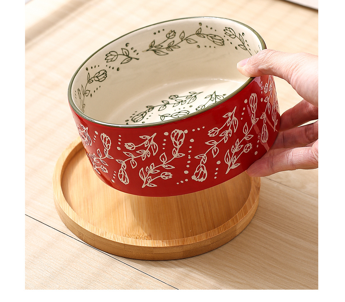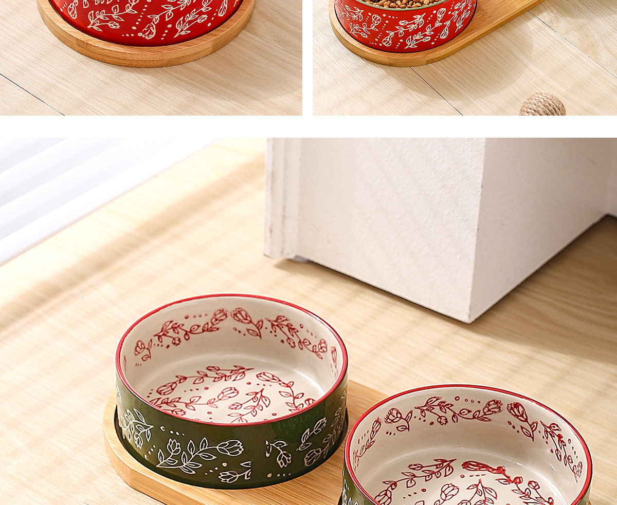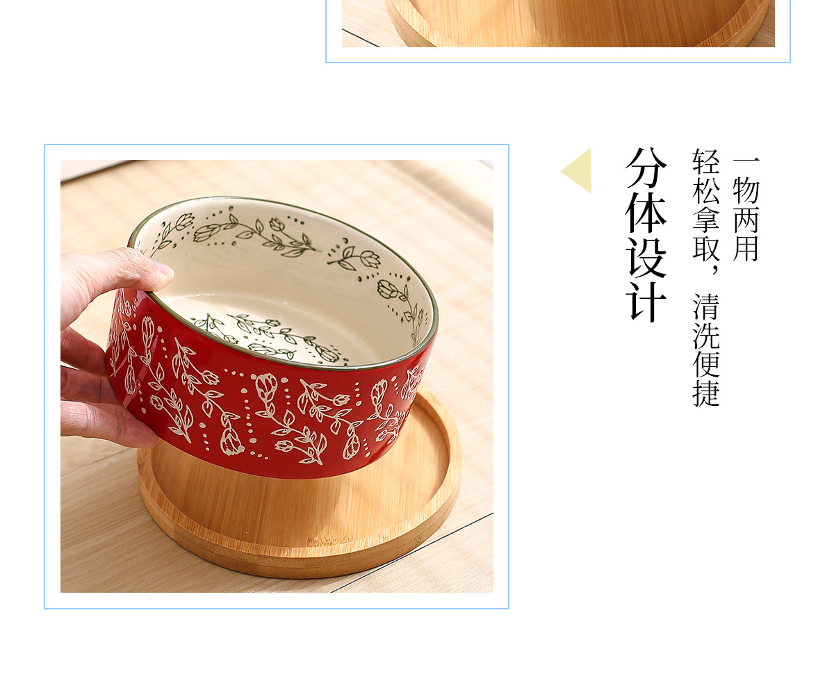 대나무와 나무 쟁반이있는 민족 스타일 꽃 스트레이트 그릇 세라믹 애완 동물 그릇 국경 고양이 그릇 개 그릇 안티 노크 마시는 분지