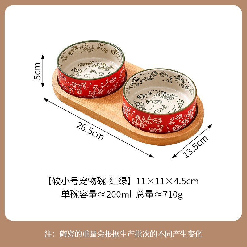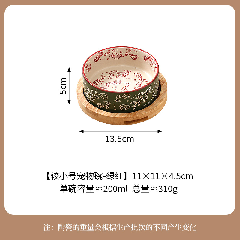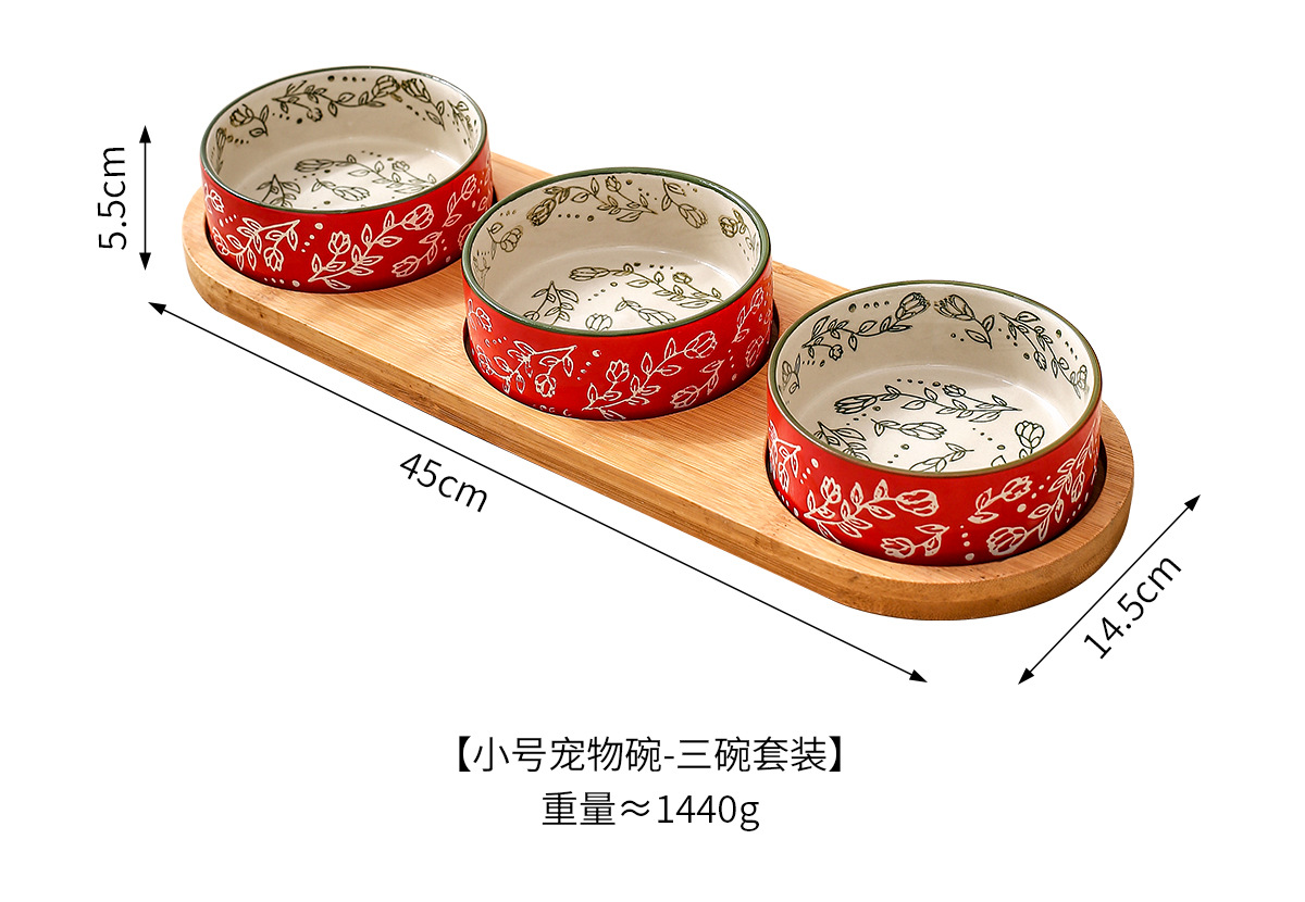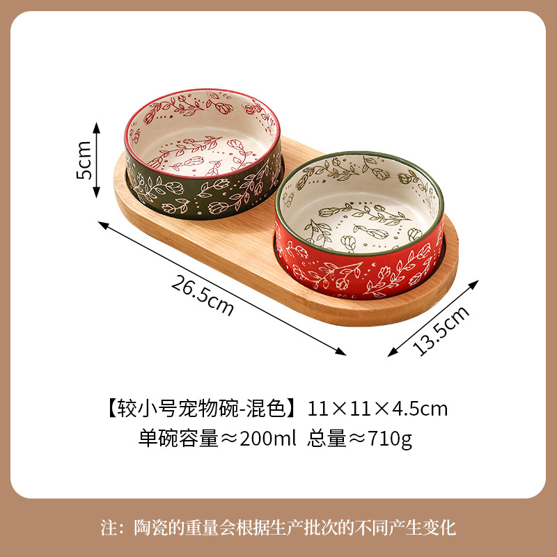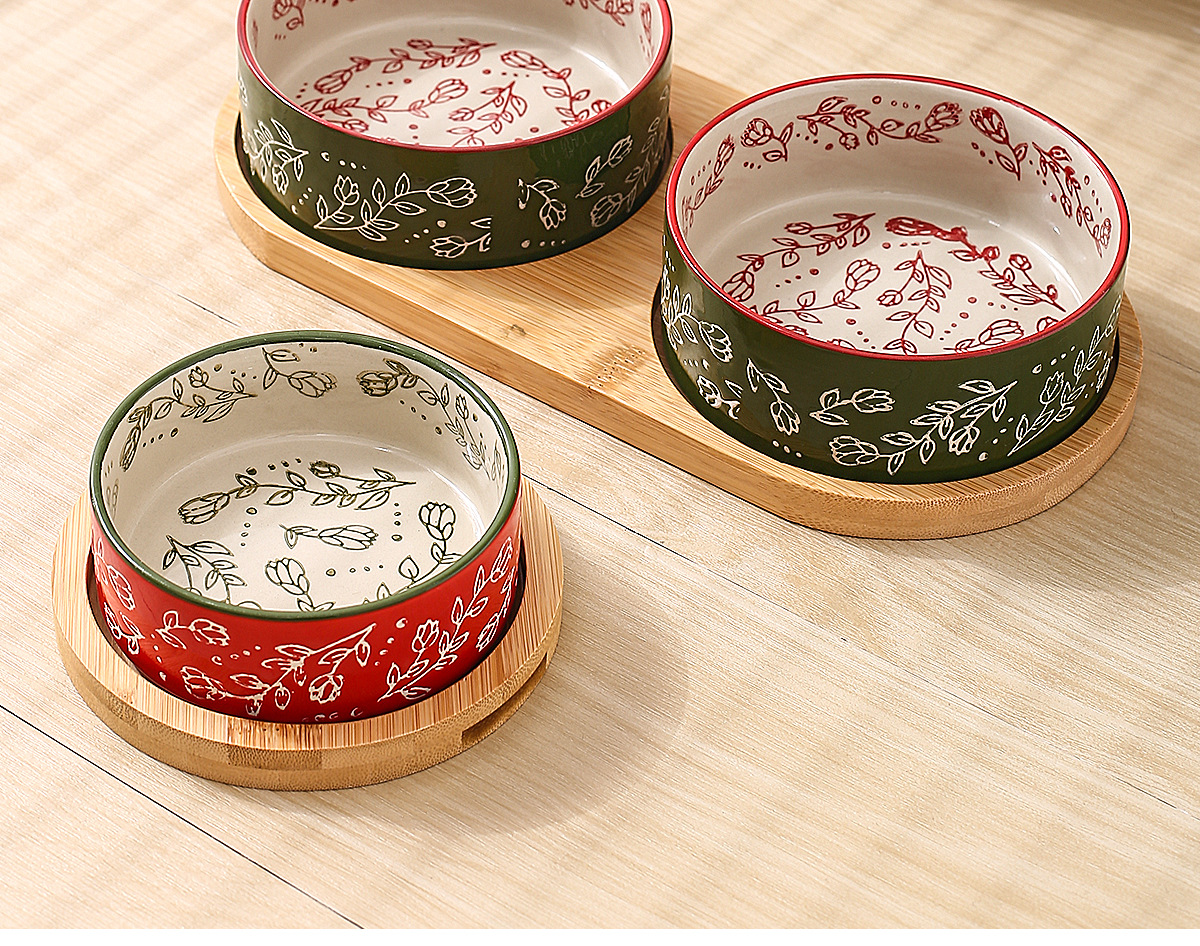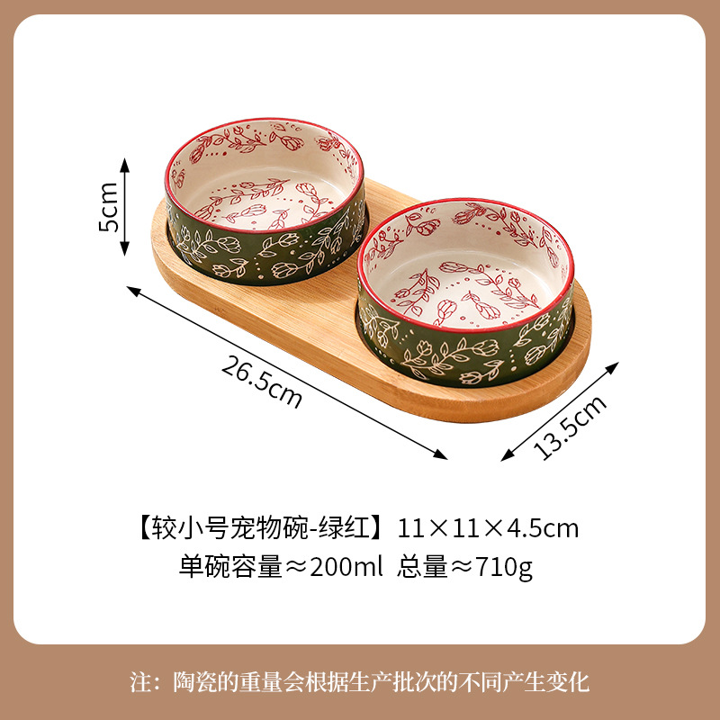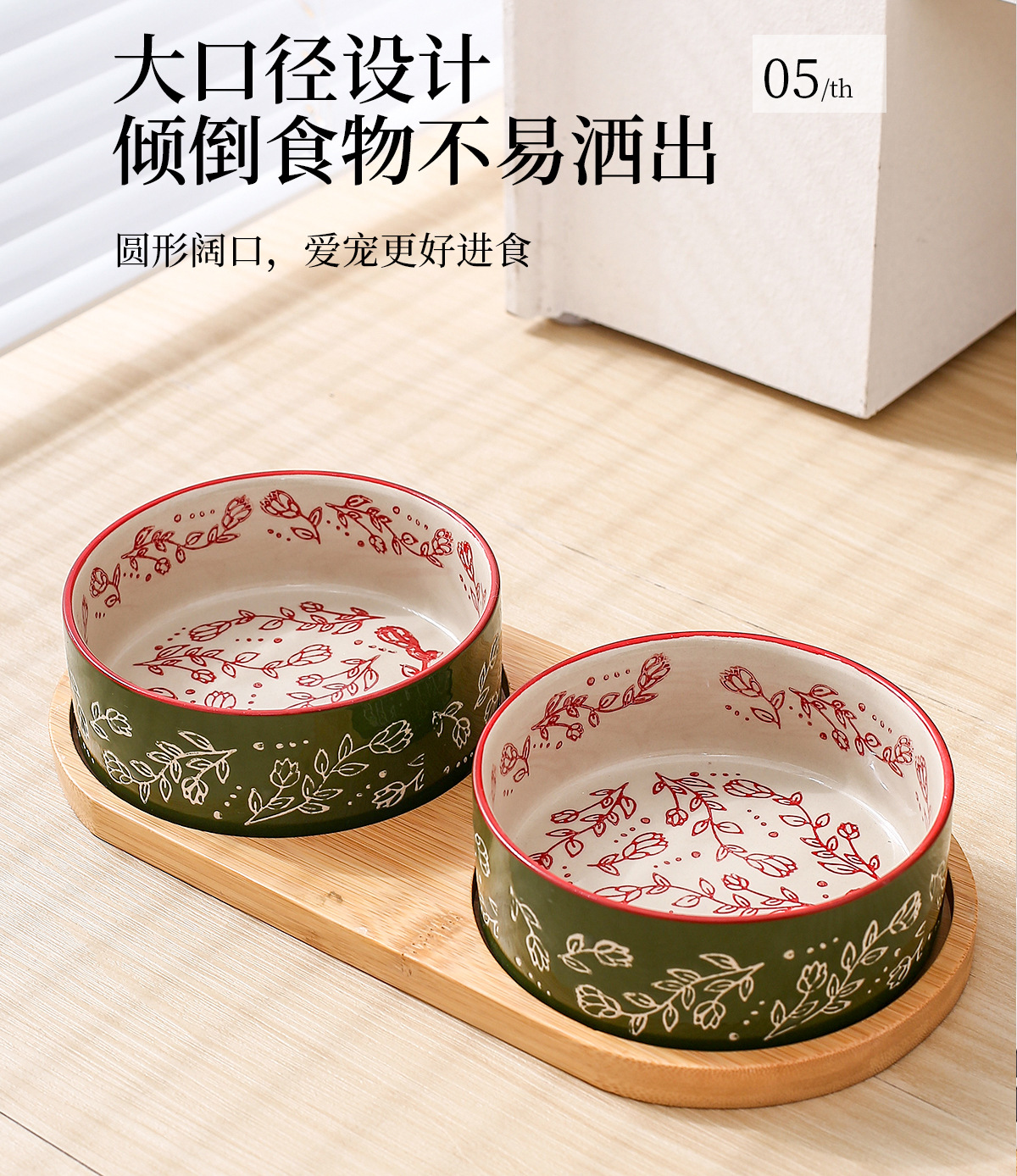 대나무와 나무 쟁반이있는 민족 스타일 꽃 스트레이트 그릇 세라믹 애완 동물 그릇 국경 고양이 그릇 개 그릇 안티 노크 마시는 분지