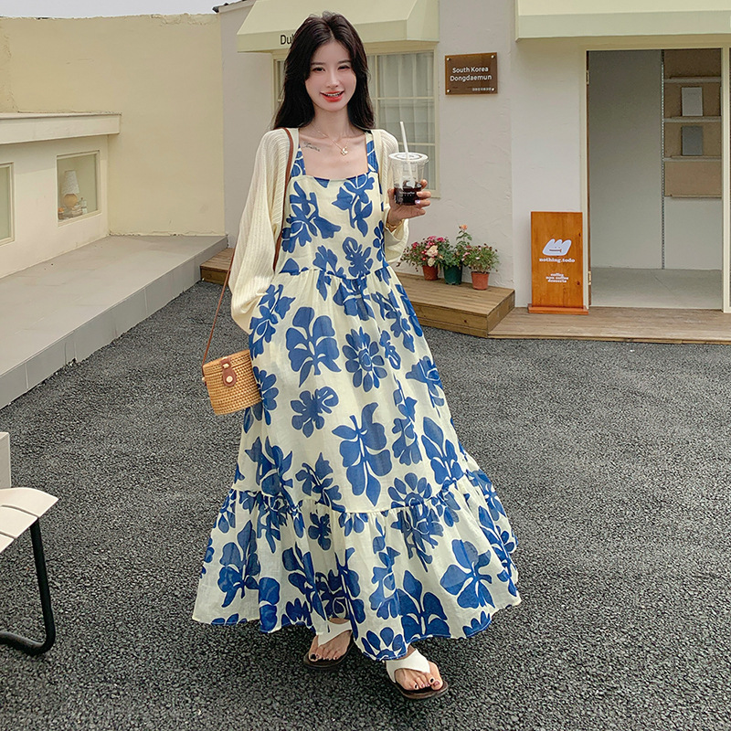 진짜 샷 기질 부드러운 바람 자외선 차단제 블라우스 원피스 세트 2025 새로운 인쇄 된 서스펜더 긴 스커트 투피스 세트스토어 가기