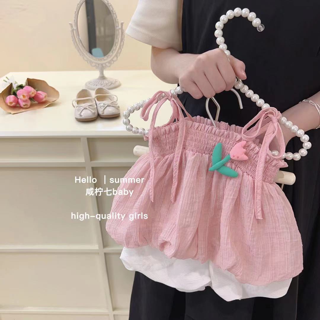 여아 여름 투피스 세트 2023 새로운 스타일의 어린이 서스펜더 탑, 세련된 쉬폰 셔츠, 여아 반바지 정장스토어 가기