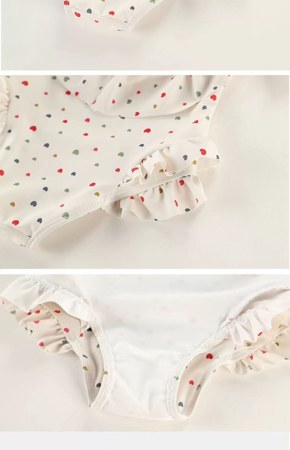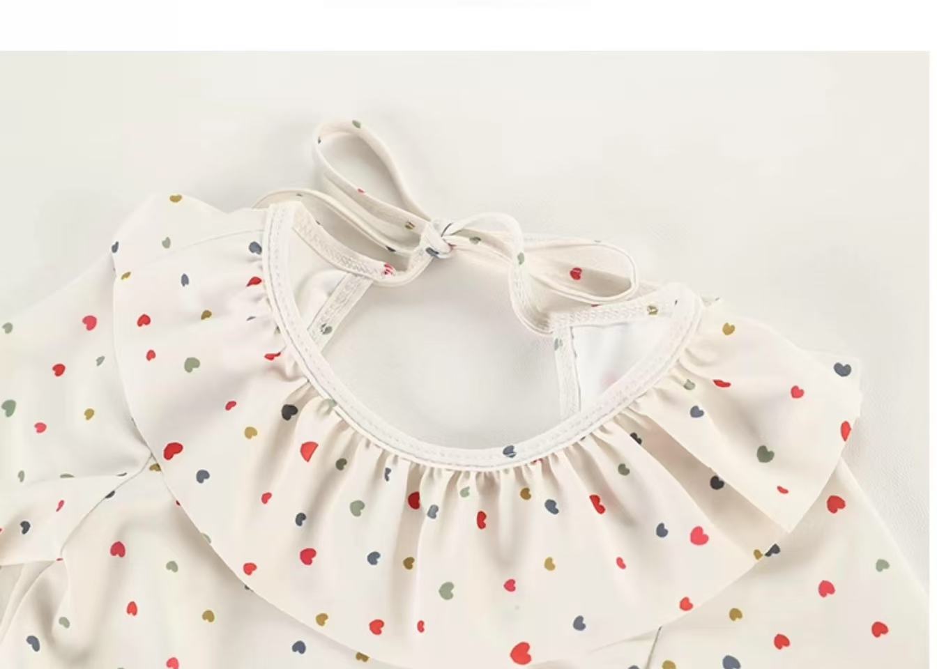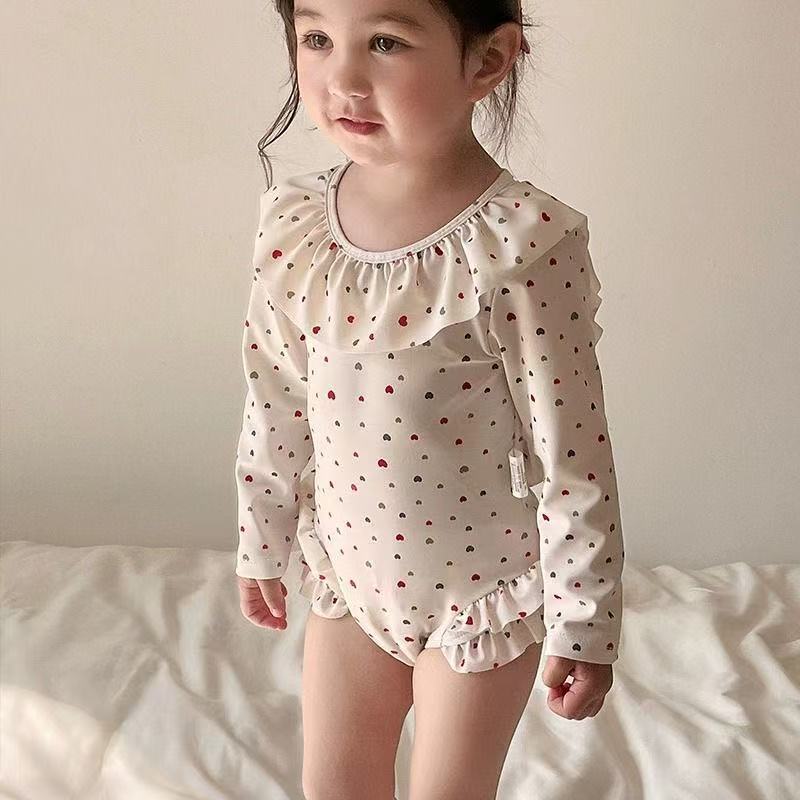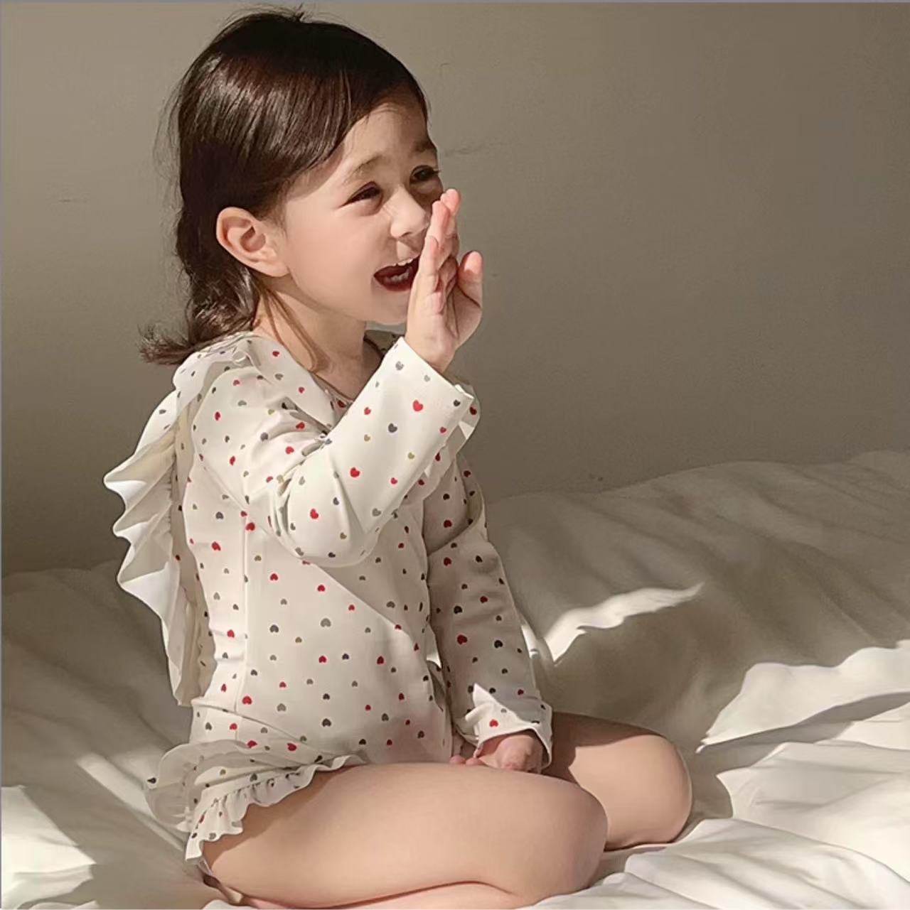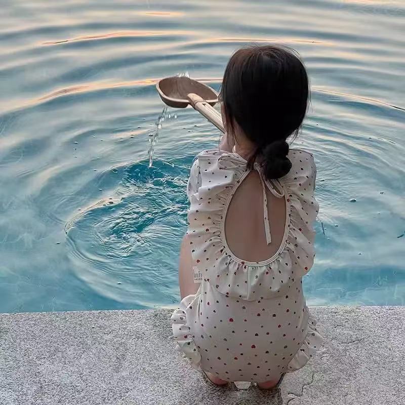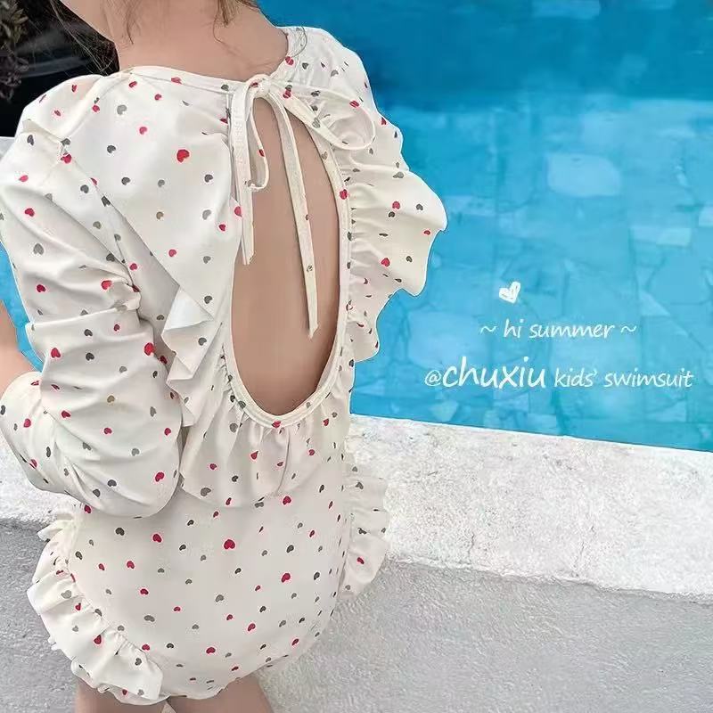 2025 새로운 어린이 원피스 수영복 소녀 긴팔 원피스 레이스 소형, 중형 및 대형 어린이 작은 사랑 오픈 백 수영복