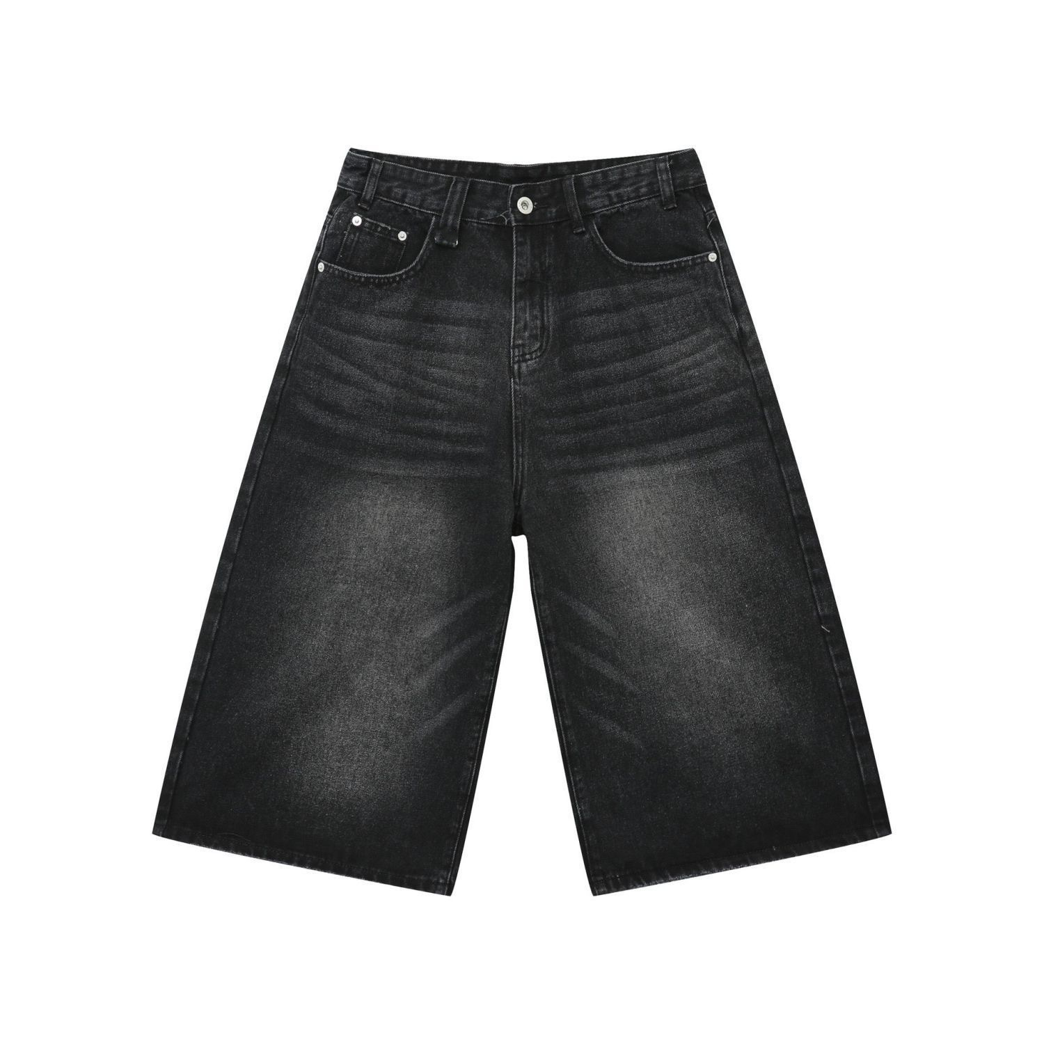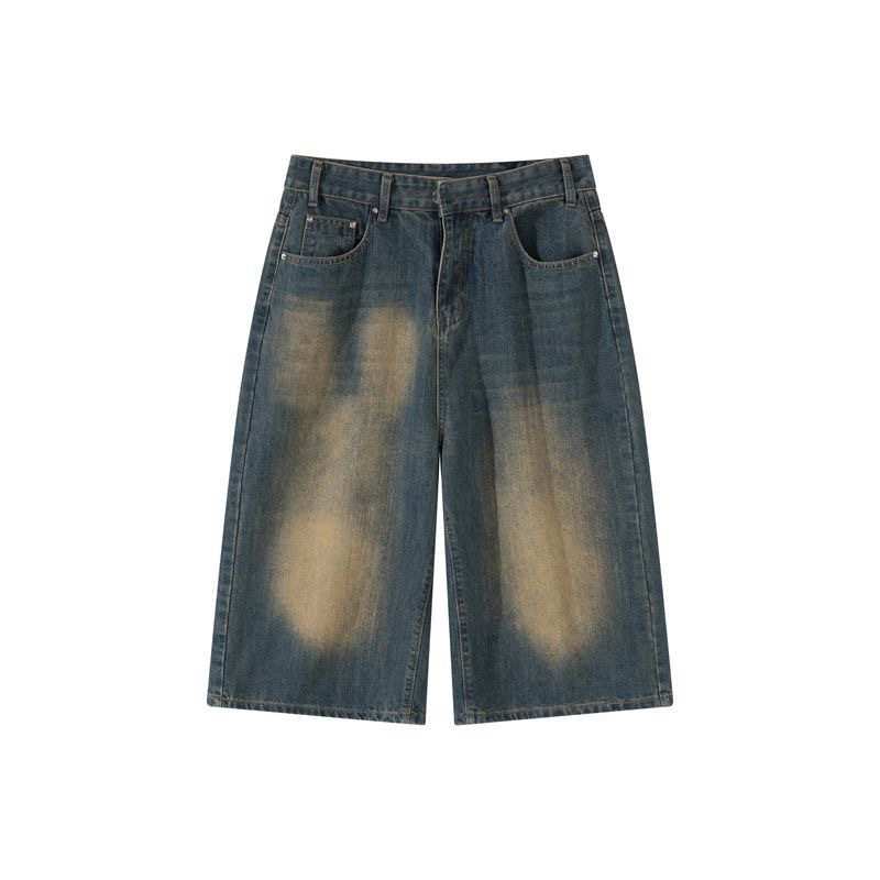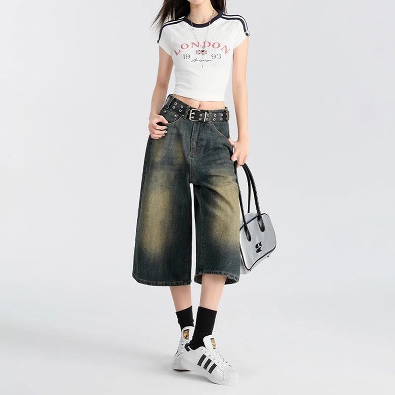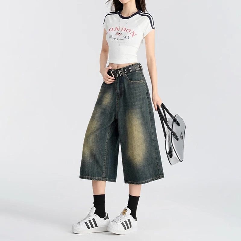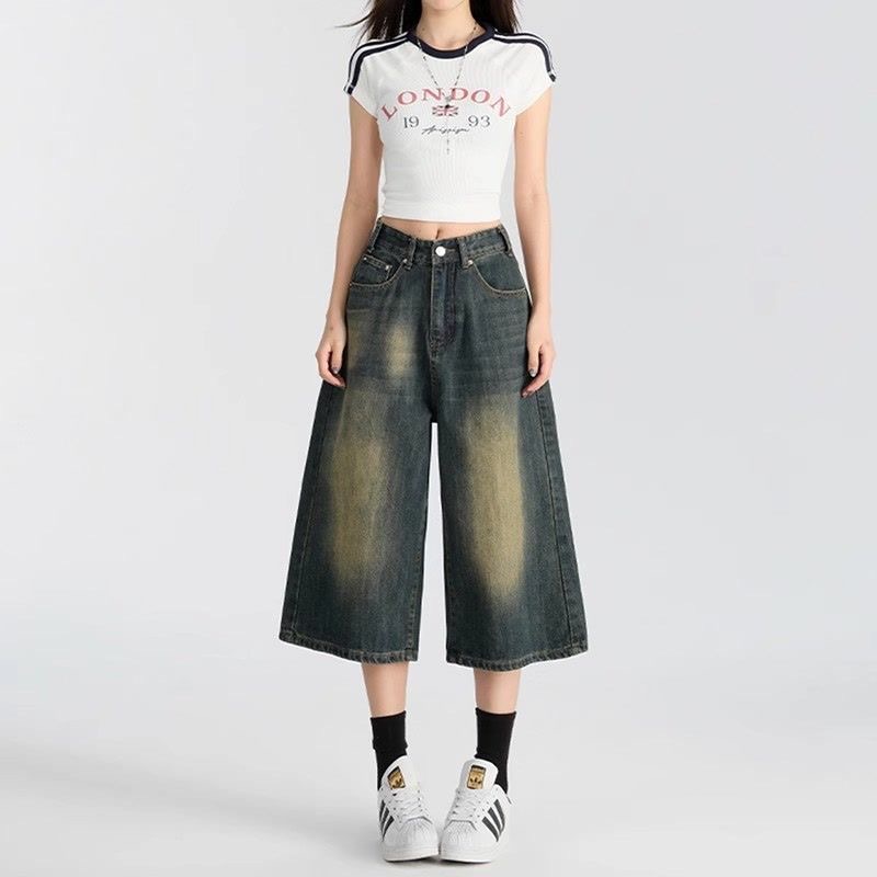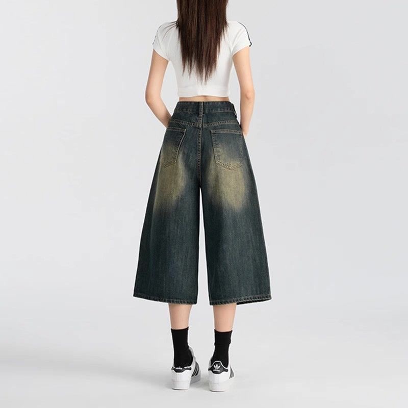 아메리칸 스타일 레트로 올드 블루 크롭 청바지 여성 여름 얇은 느슨한 자른 바지 위에 무릎 넓은 다리 짧은 바지스토어 가기