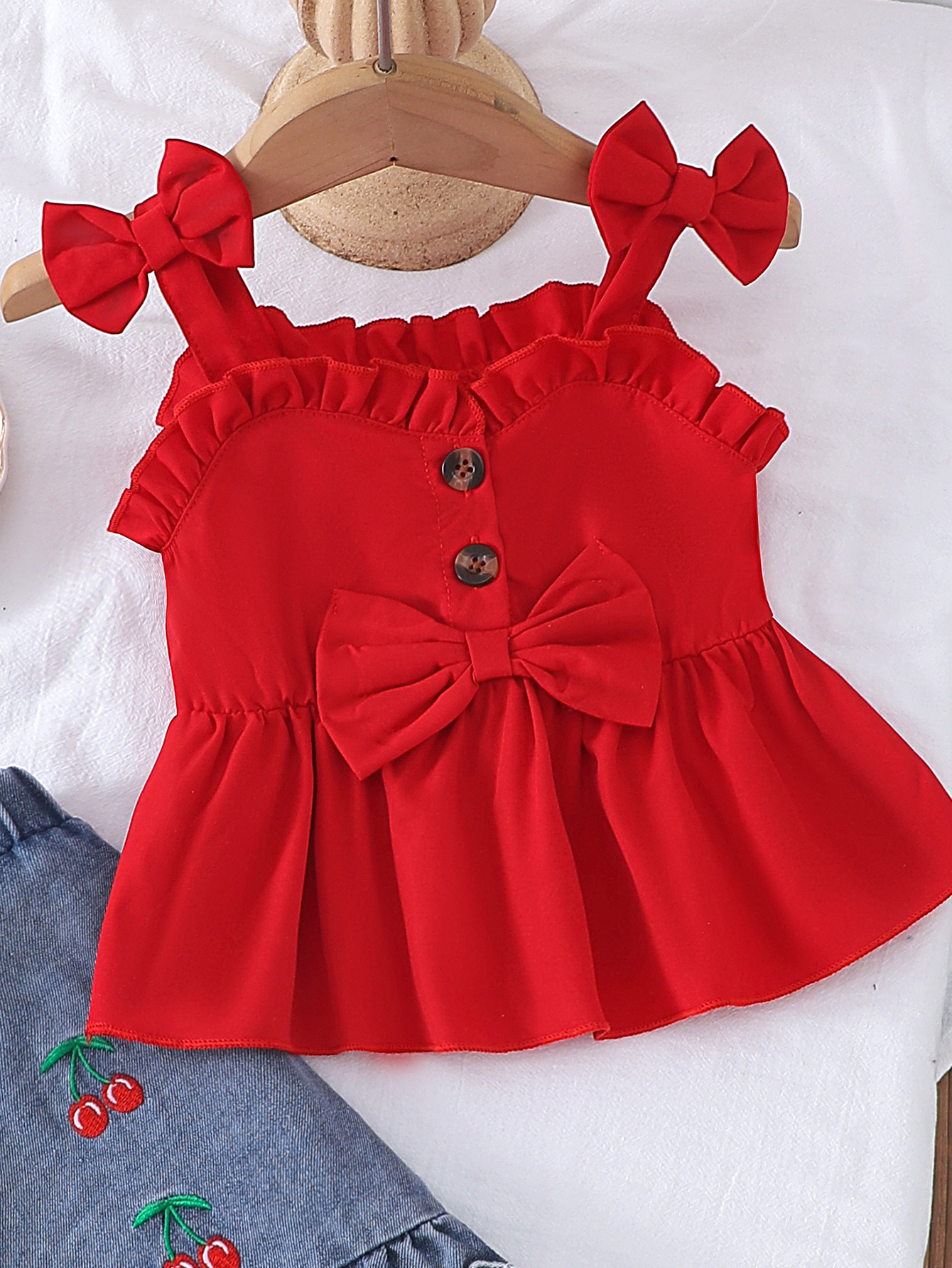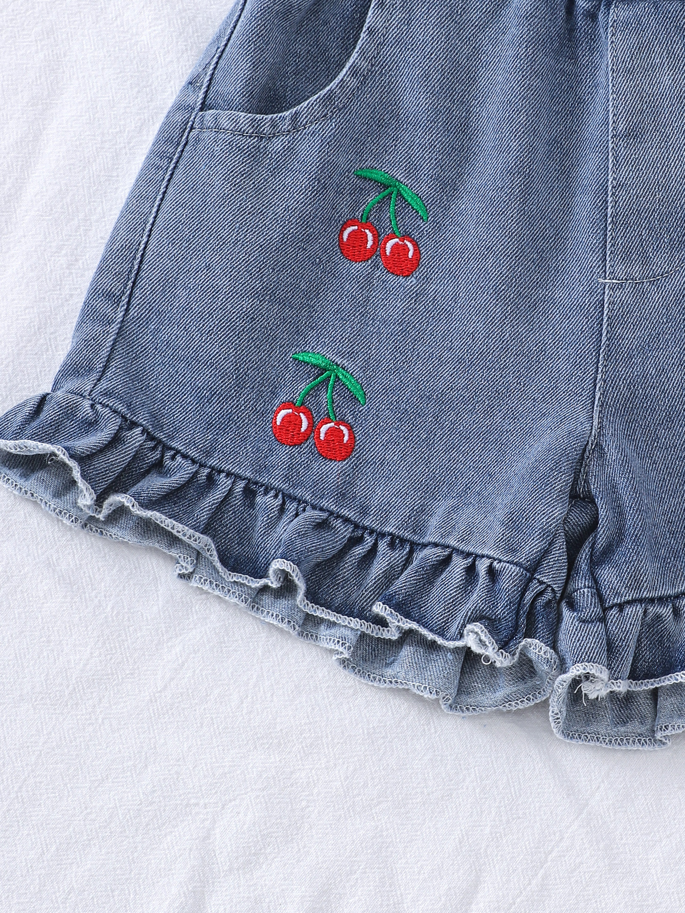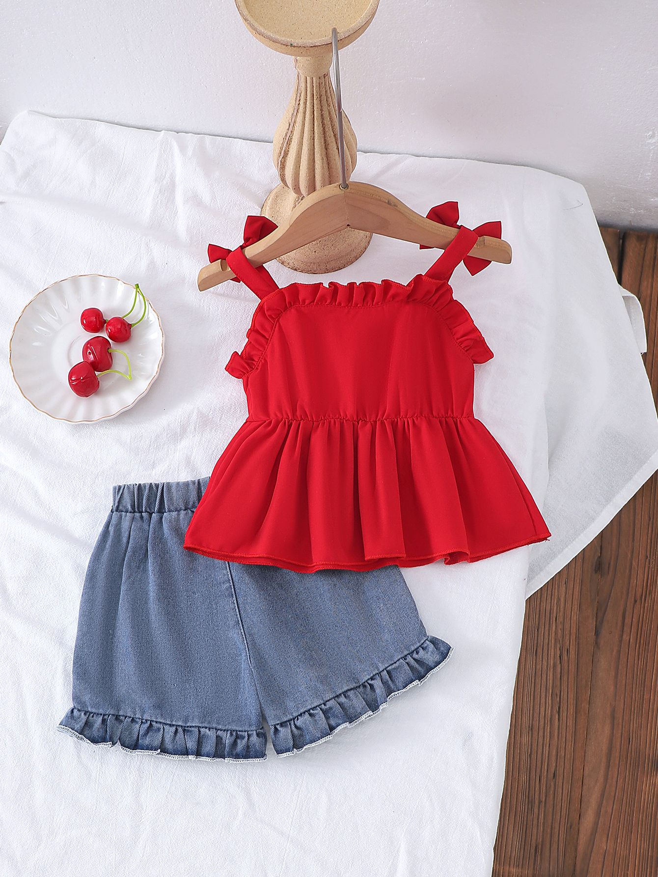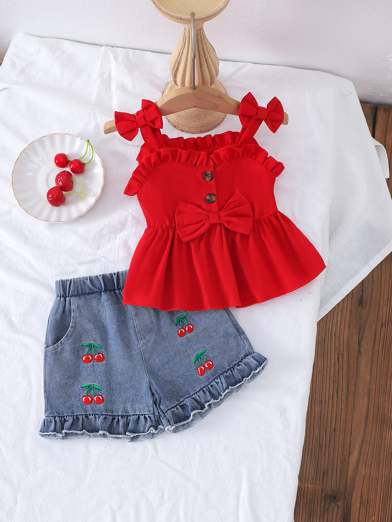 해외 무역 국경 유럽 및 미국 여름 베스트셀러 새로운 소녀 세트 중소 어린이 빨간 활 서스펜더 데님 반바지스토어 가기