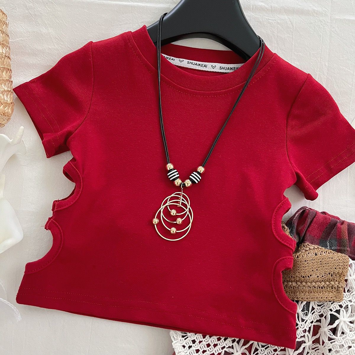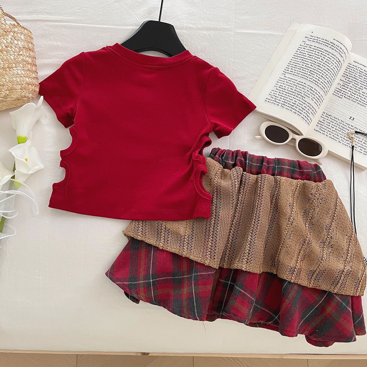 2025 년 여름 소녀 세트 리키 허리 반팔 티셔츠 레이스 격자 무늬 스커트 아기 소녀 민족 스타일 투피스 세트