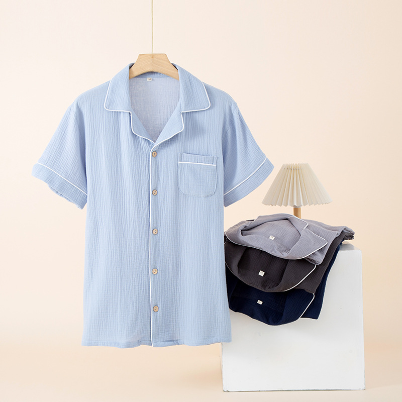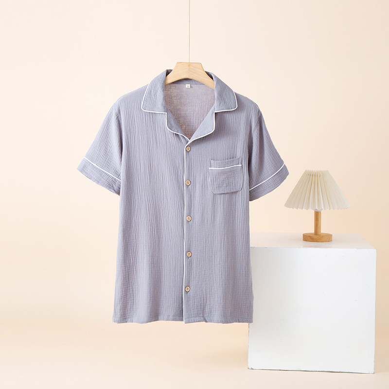 여름 남성 순면 거즈 원피스 잠옷 얇은 반팔 탑 일본식 심플 홈웨어 탑은 밖에서 착용 가능스토어 가기