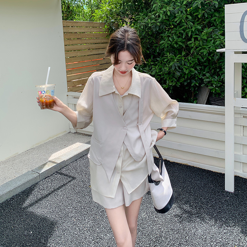 리얼 샷 가짜 투피스 셔츠 탑 우아한 세트 2025 새로운 캐주얼 슬리밍 반바지 투피스 세트