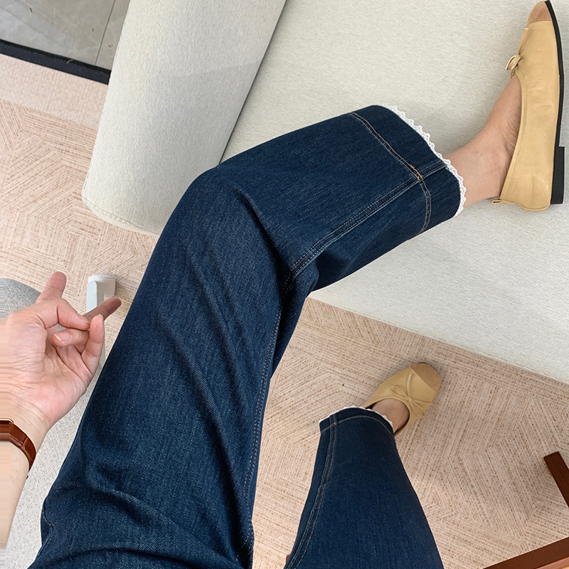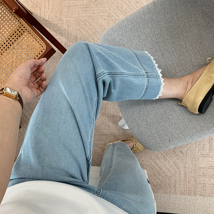 얇은 4 면 레이스 테두리 자른 와이드 레그 팬츠 여성용 여름 느슨한 높은 허리 슬리밍 쇼트 스트레이트 청바지