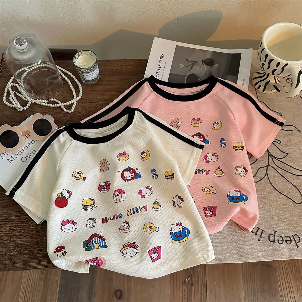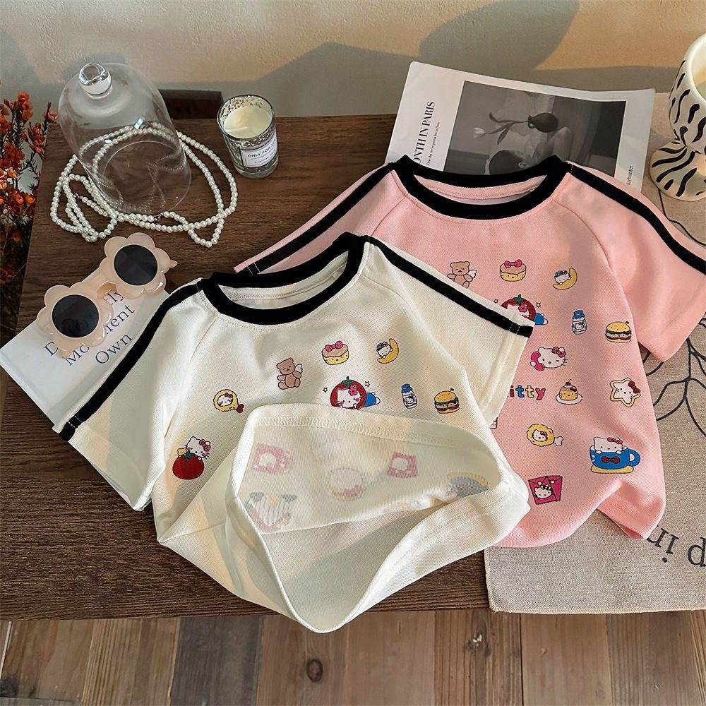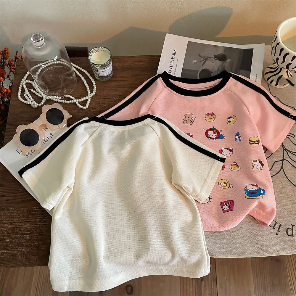 2025 소년과 소녀 만화 둥근 목 짧은 소매 탑 여름 유행 짧은 소매 핑크 하우스 새로운 어린이 라글란 소매 티셔츠