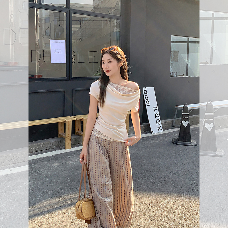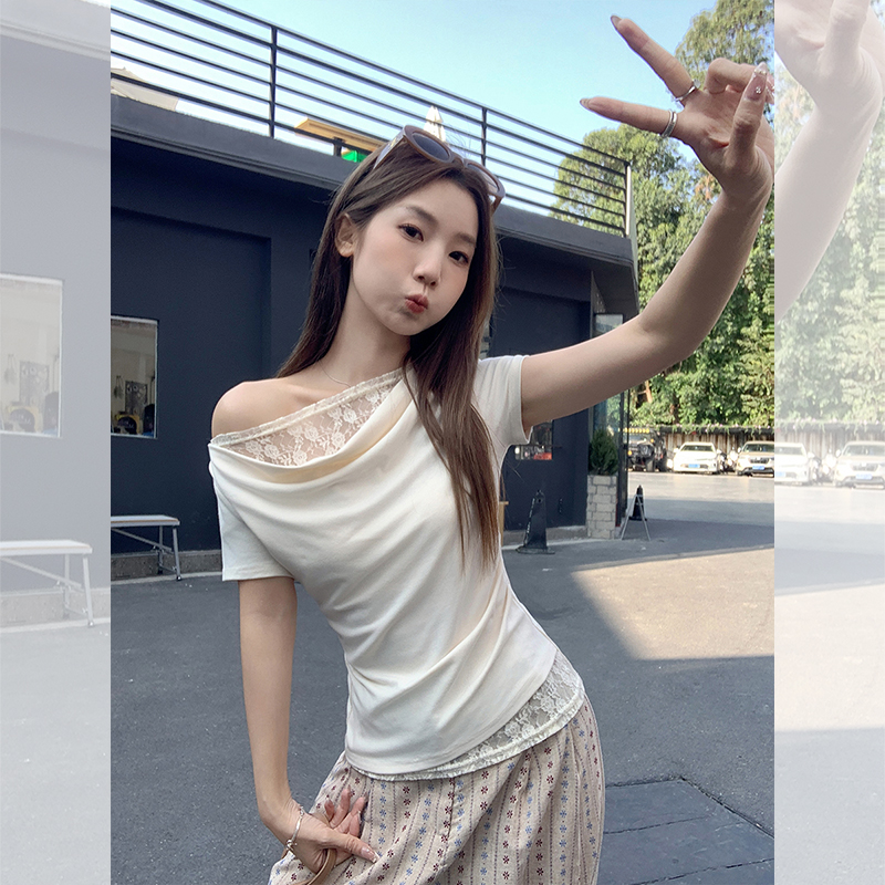 레이스 바느질 가짜 투피스 반팔 티셔츠 여성용 여름 새로운 슬림핏 슬리밍 허리 쇄골 노출 디자인 탑스토어 가기