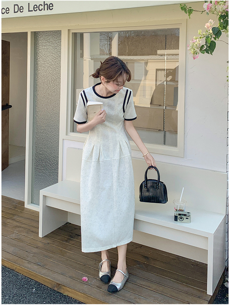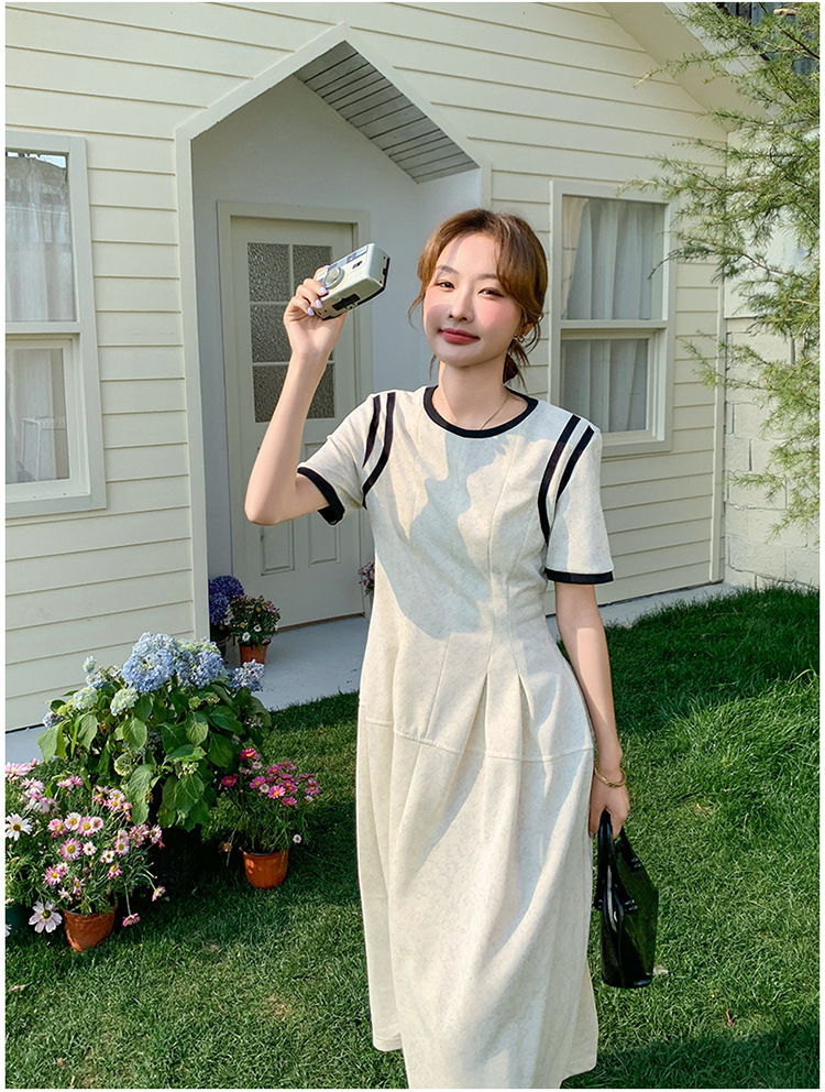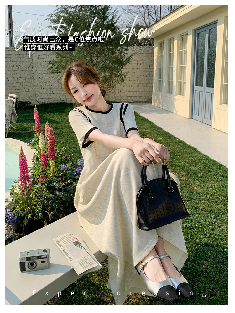 리얼 샷 콘트라스트 컬러 스티칭 원피스 여성 2025 년 여름 새로운 프랑스 스타일 멋진 멋진 디자인 센스 슬림 우아한 긴 원피스