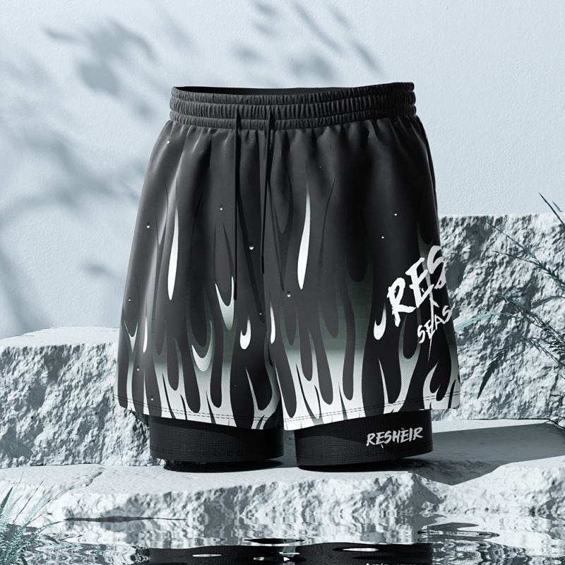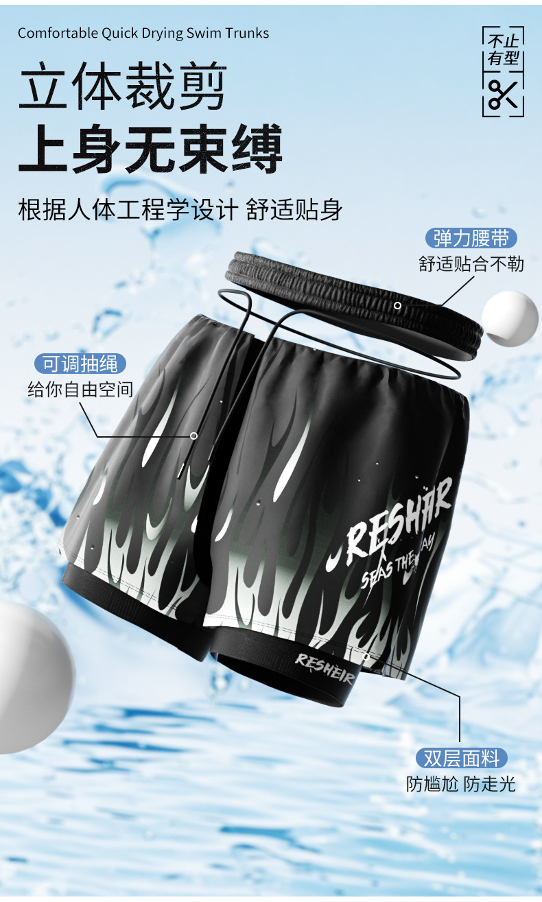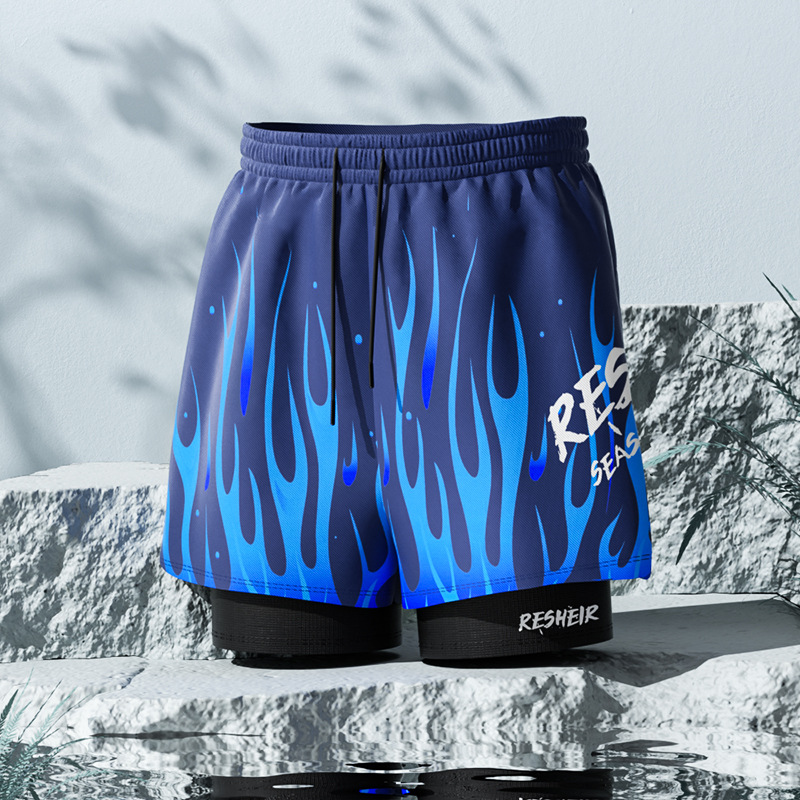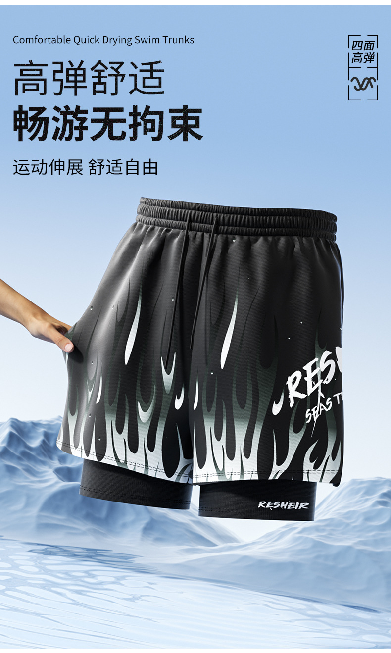 남성용 크로스보더 수영 팬티 더블 레이어 프린트 패션 캐주얼 얇은 대형 통기성 야외 장비 제조 업체 도매스토어 가기