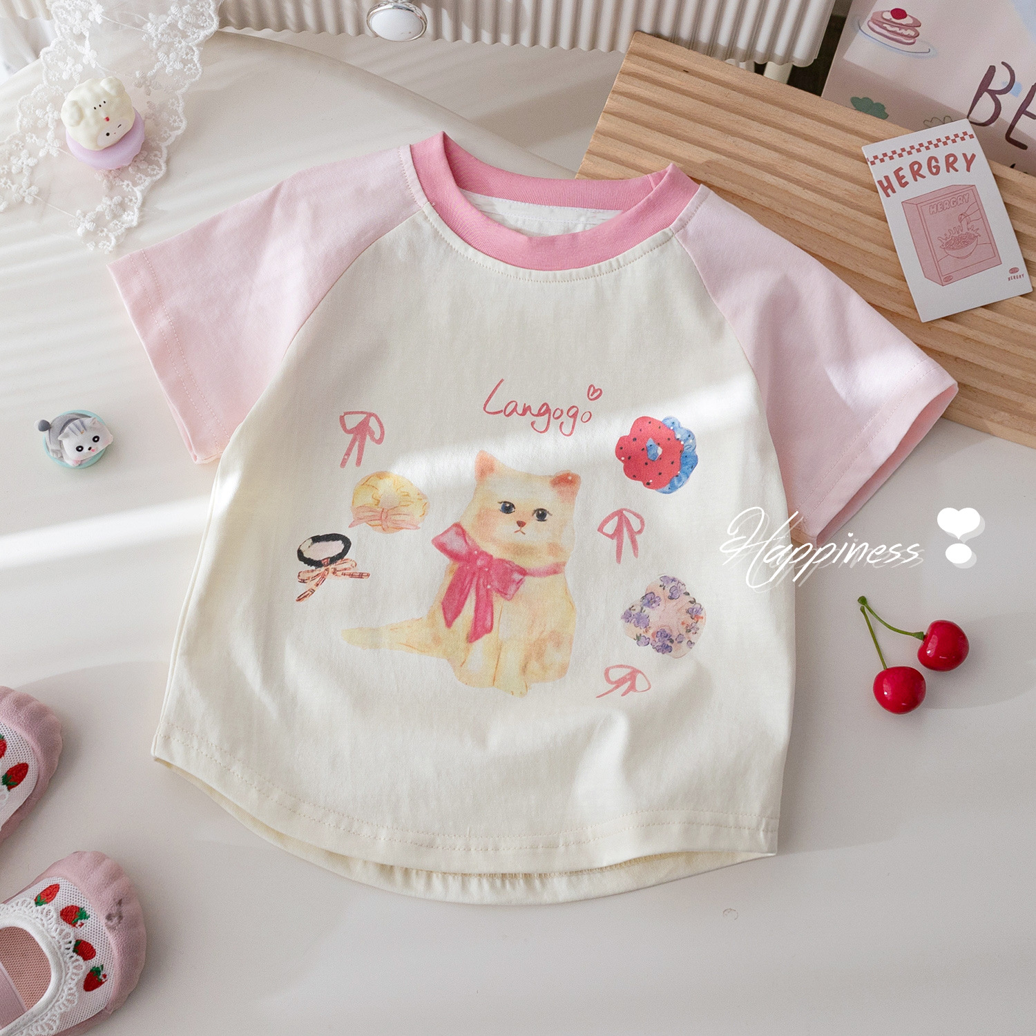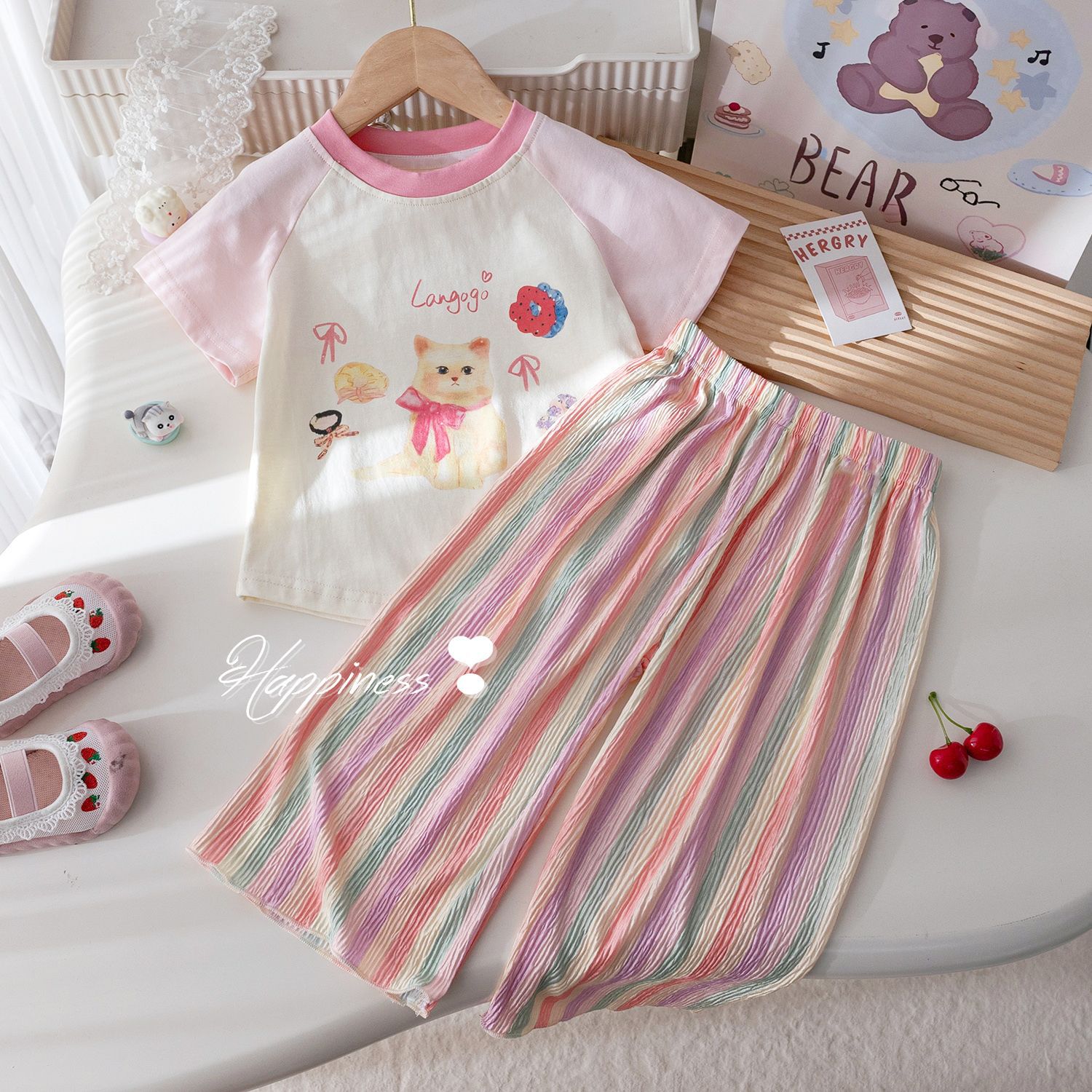 어린이 여름 새 세트 만화 인쇄 반팔 티셔츠 레인보우 아이스 실크 여름 스트레이트 안티 모기 바지 투피스 세트