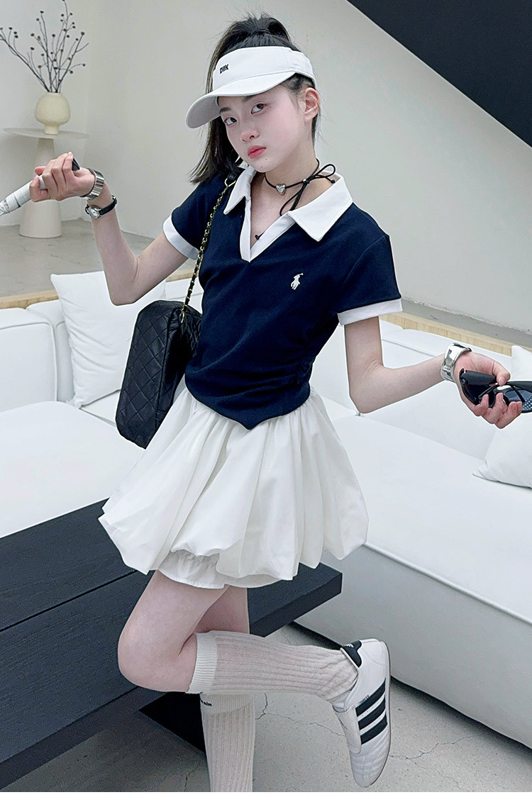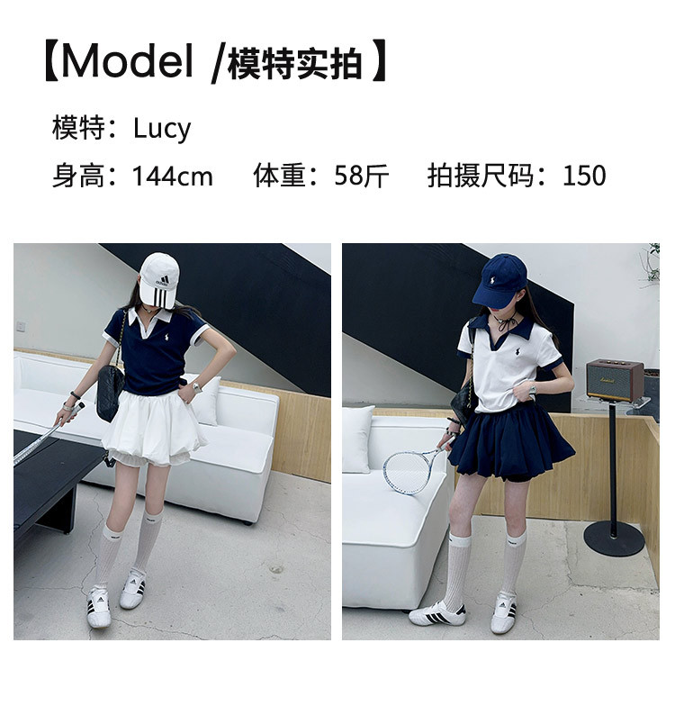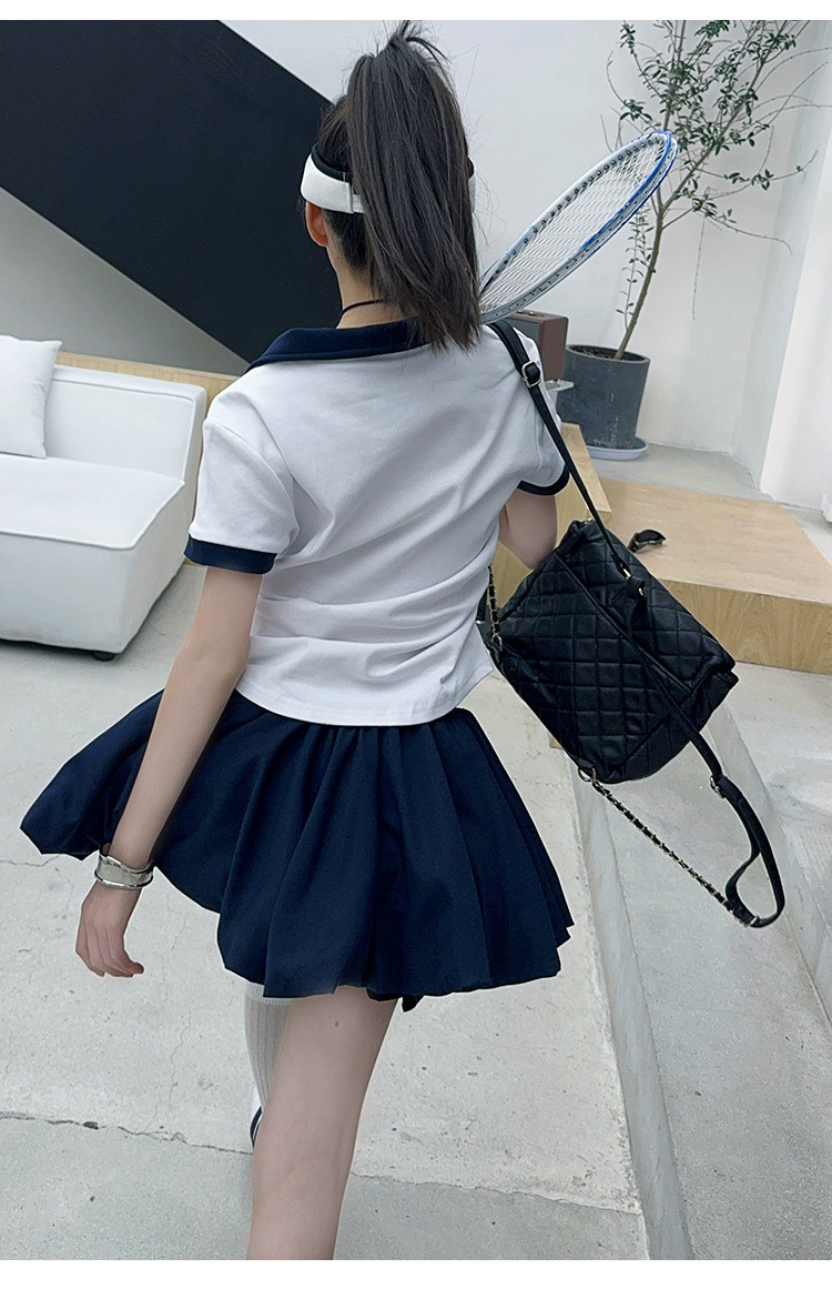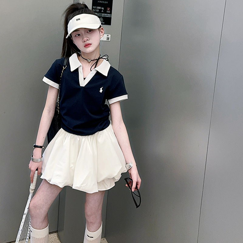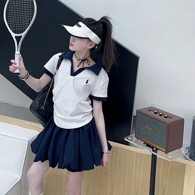 여자 세트 2025 새로운 여름 어린이 옷깃 아카데미 스타일 티셔츠 테니스 여자 여름 꽃 배 바지 치마