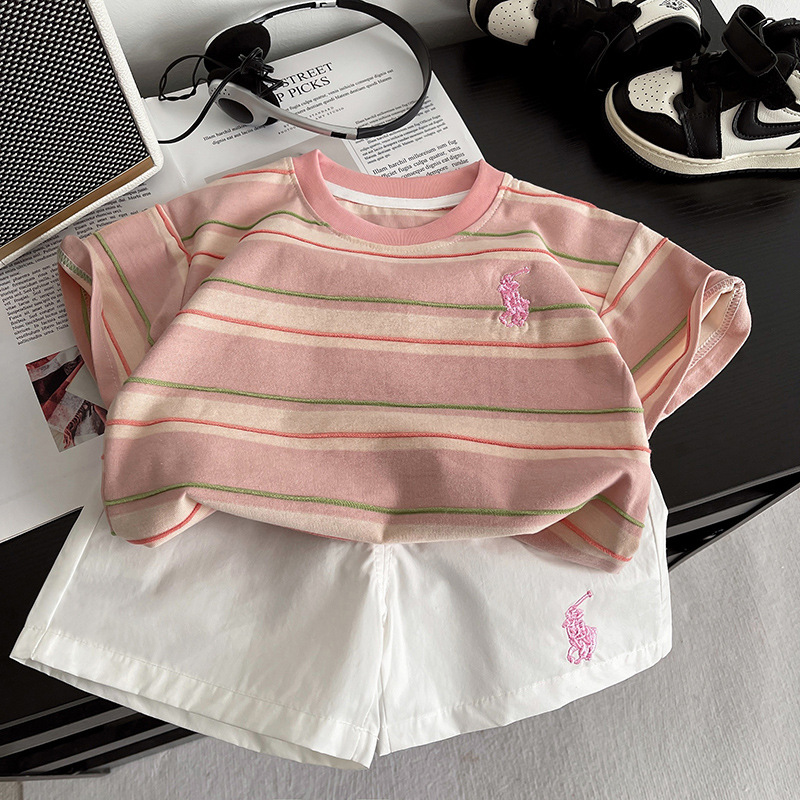 2025 어린 소년 여름 새 정장 아기 한국어 버전 자수 자카드 스트라이프 탑 아기 패션 정장 유행스토어 가기