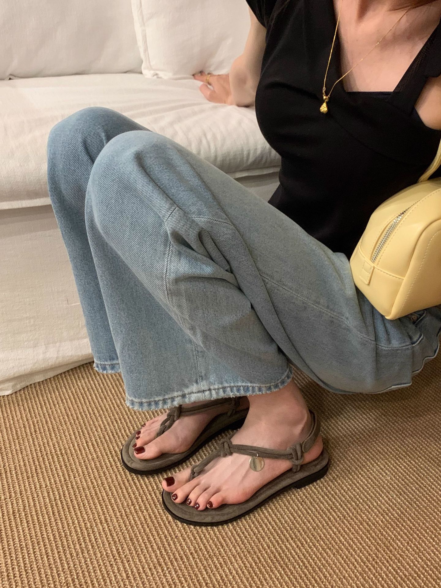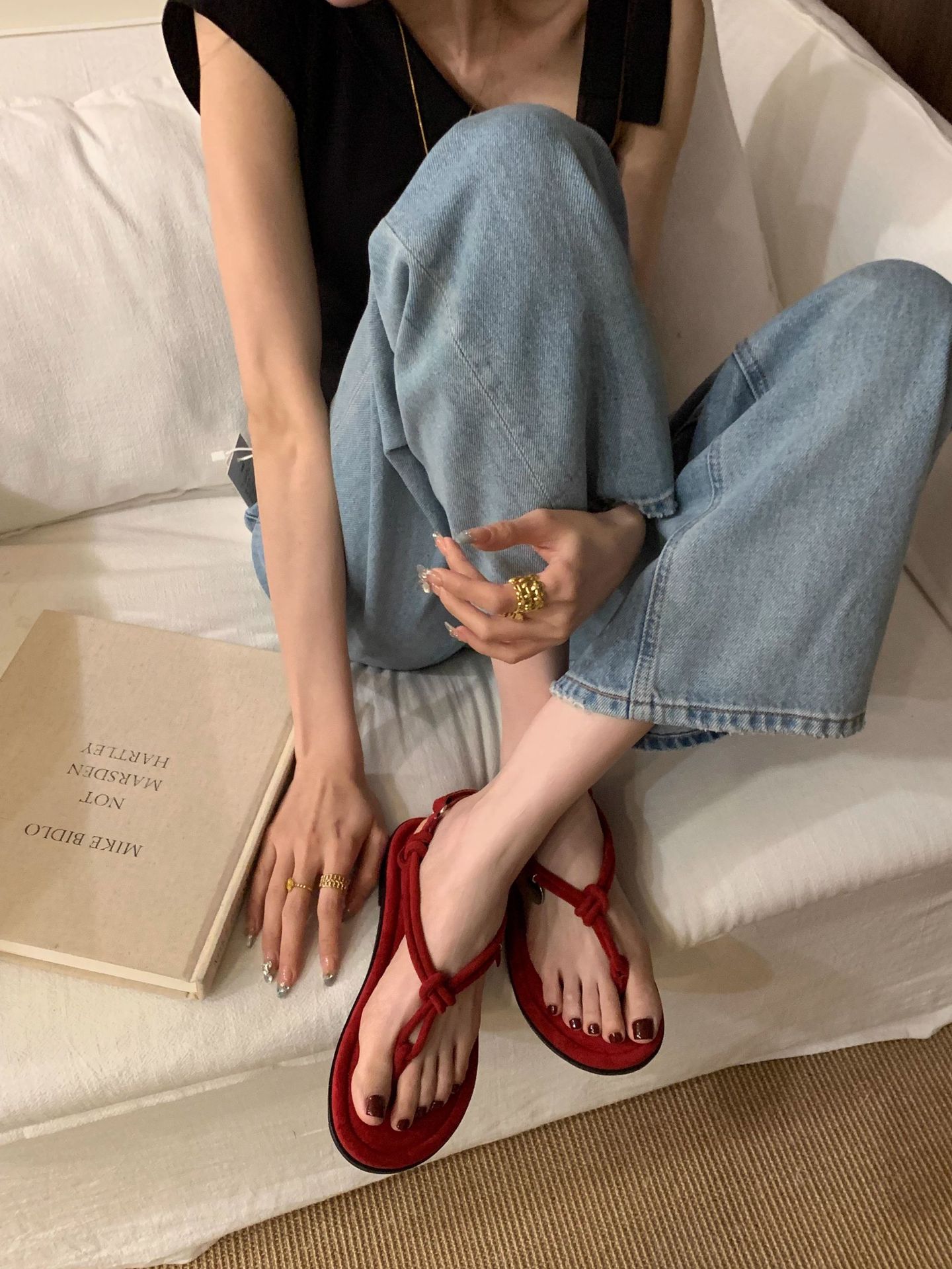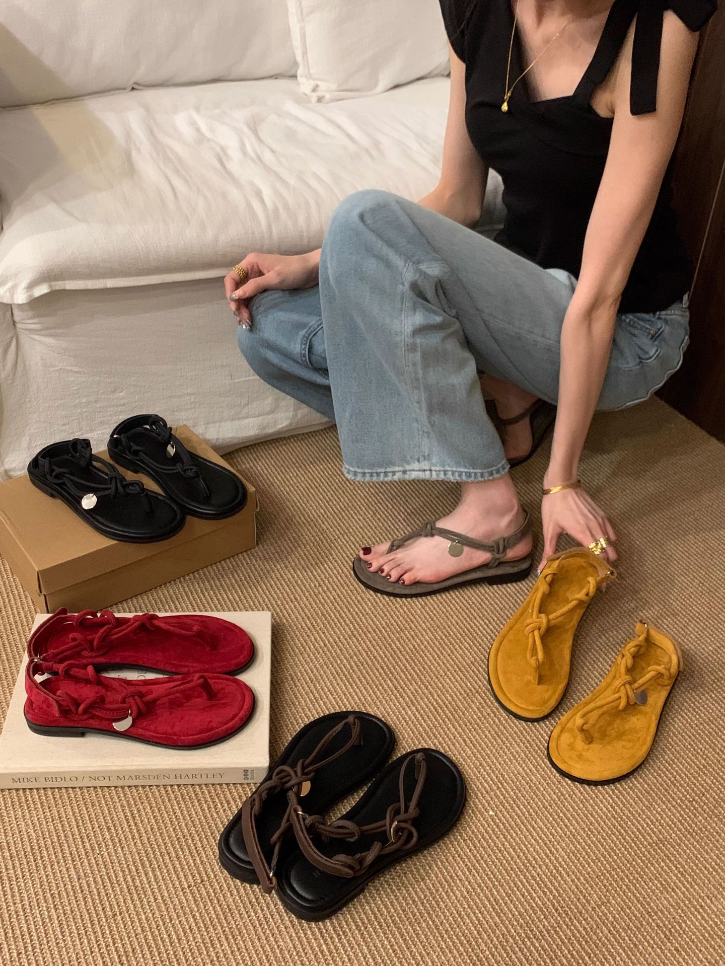 손으로 짠 레트로 매듭 샌들 여자 2025 년 여름 새로운 한국식 올매치 홀리데이 스타일 비치 슬리퍼