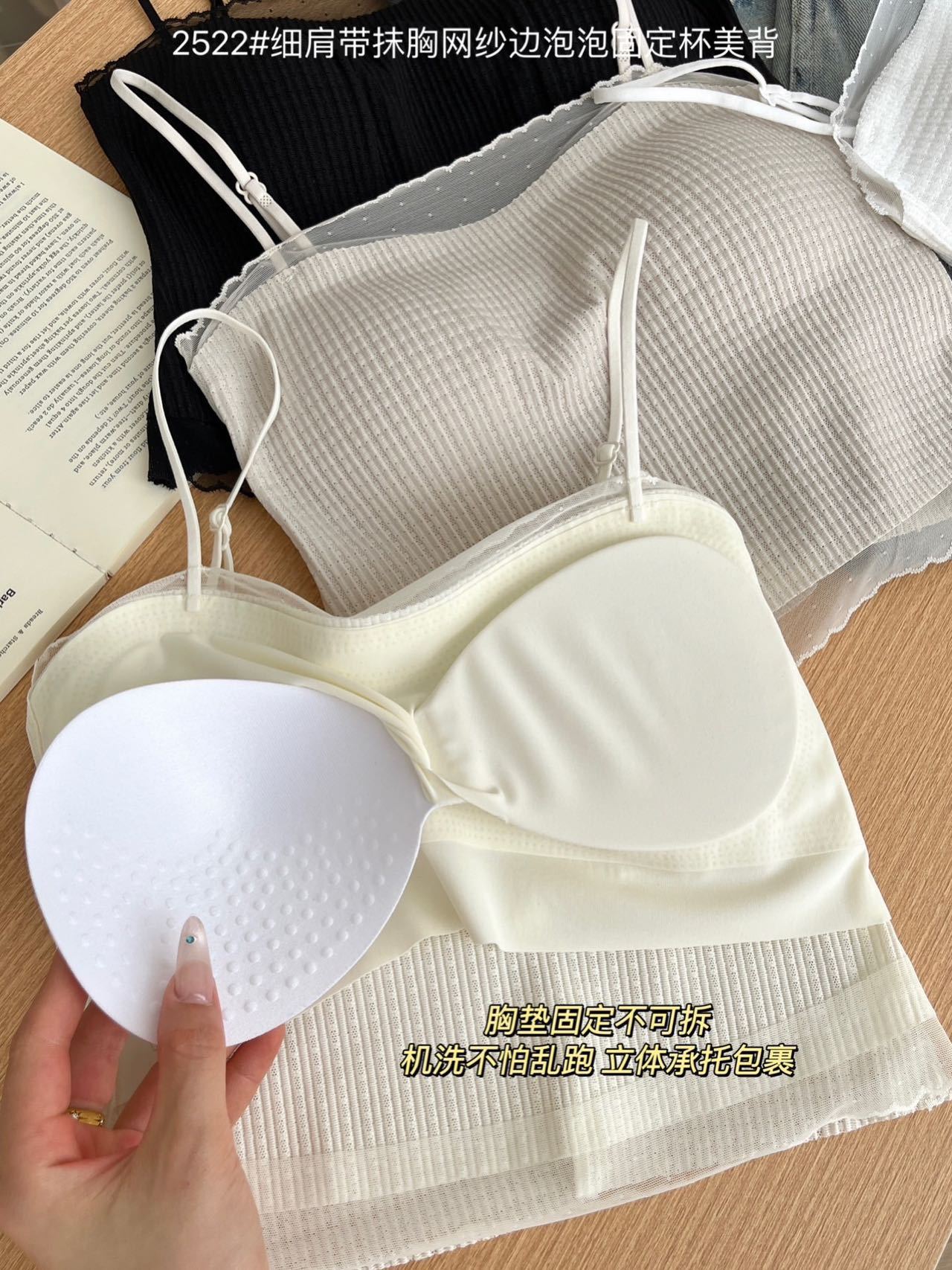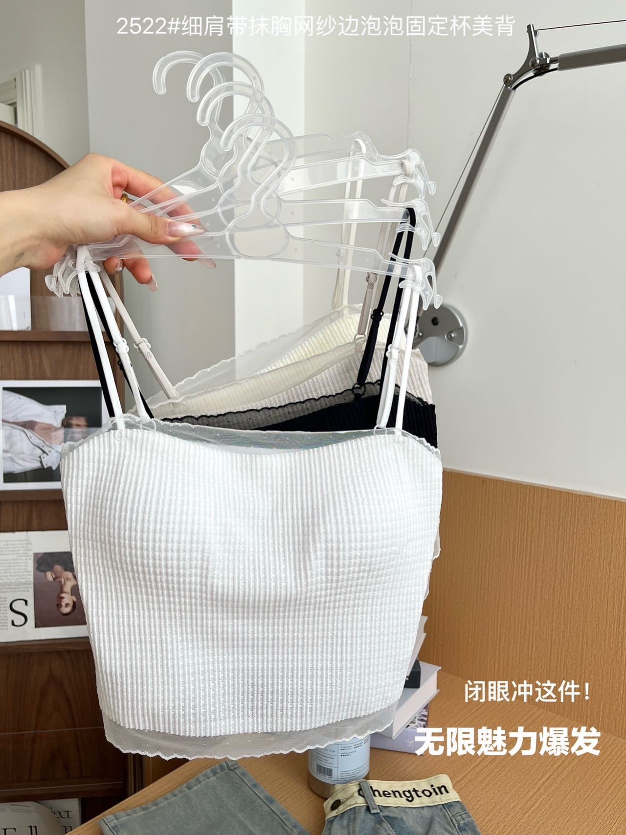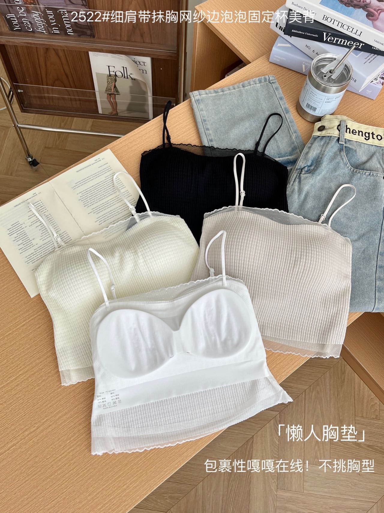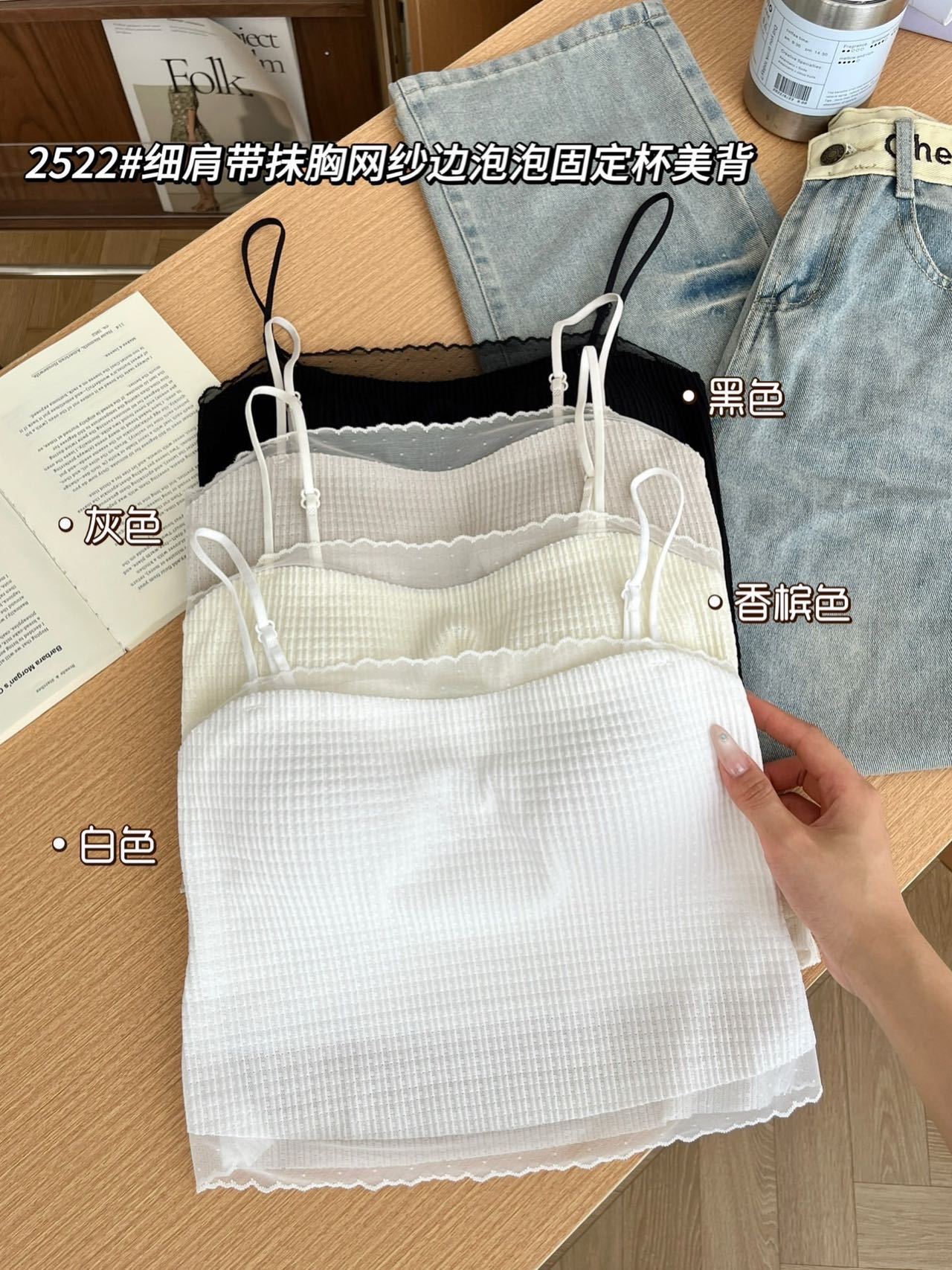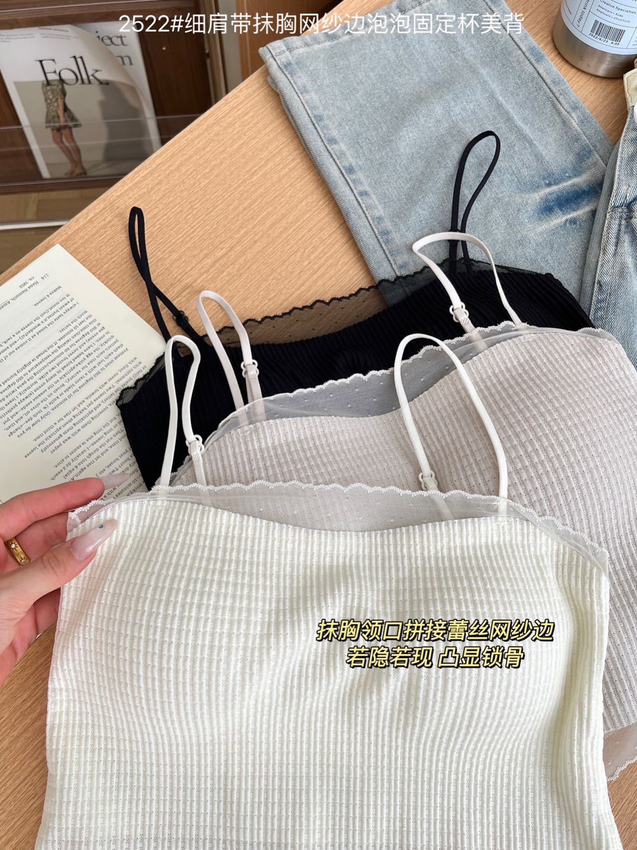 봄과 여름 안티 라이트 튜브 탑 얇은 벨트 스퀘어 설탕 그리드 간단한 가슴 패드 순수한 바람 외부 착용 캐미솔 아름다운 등