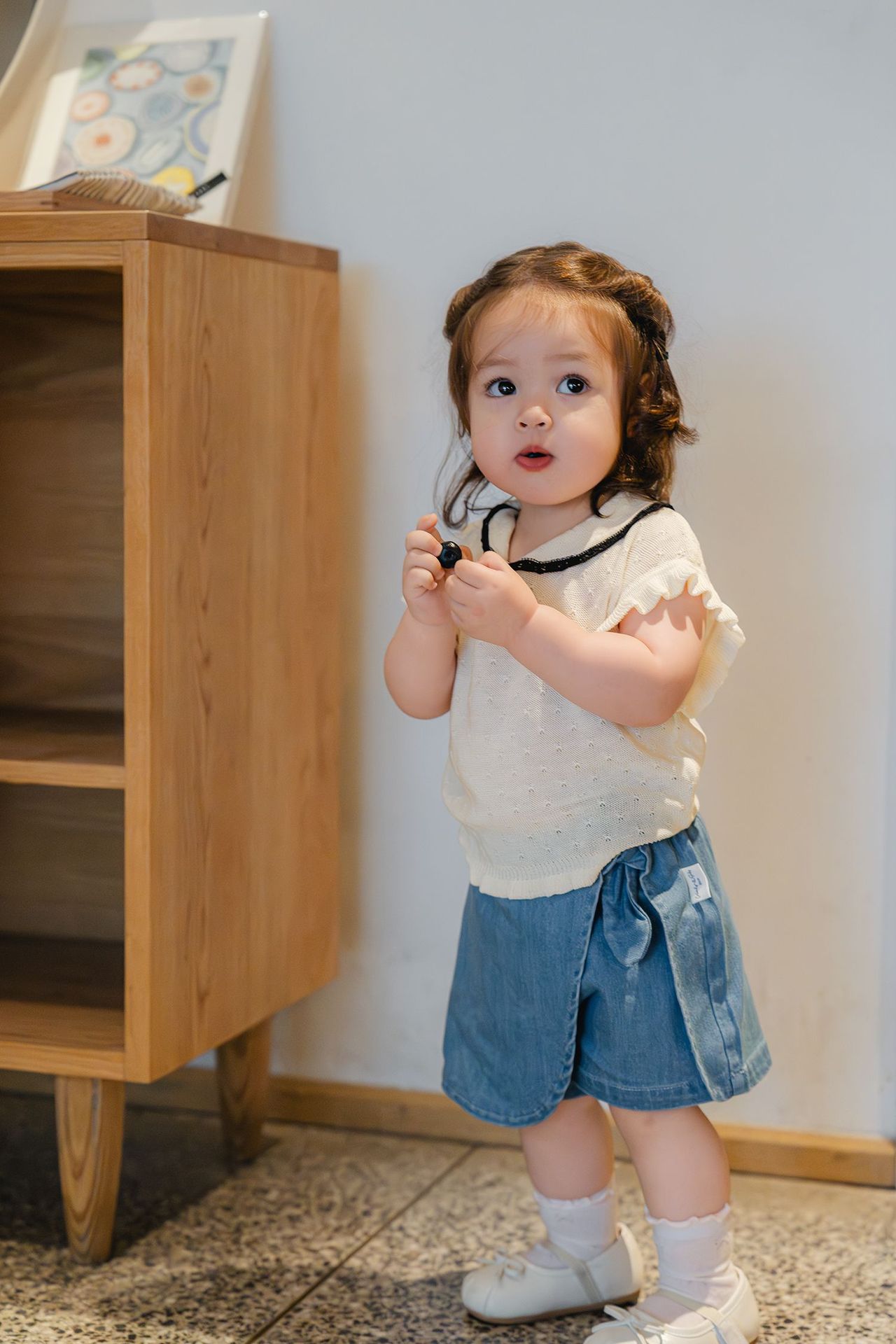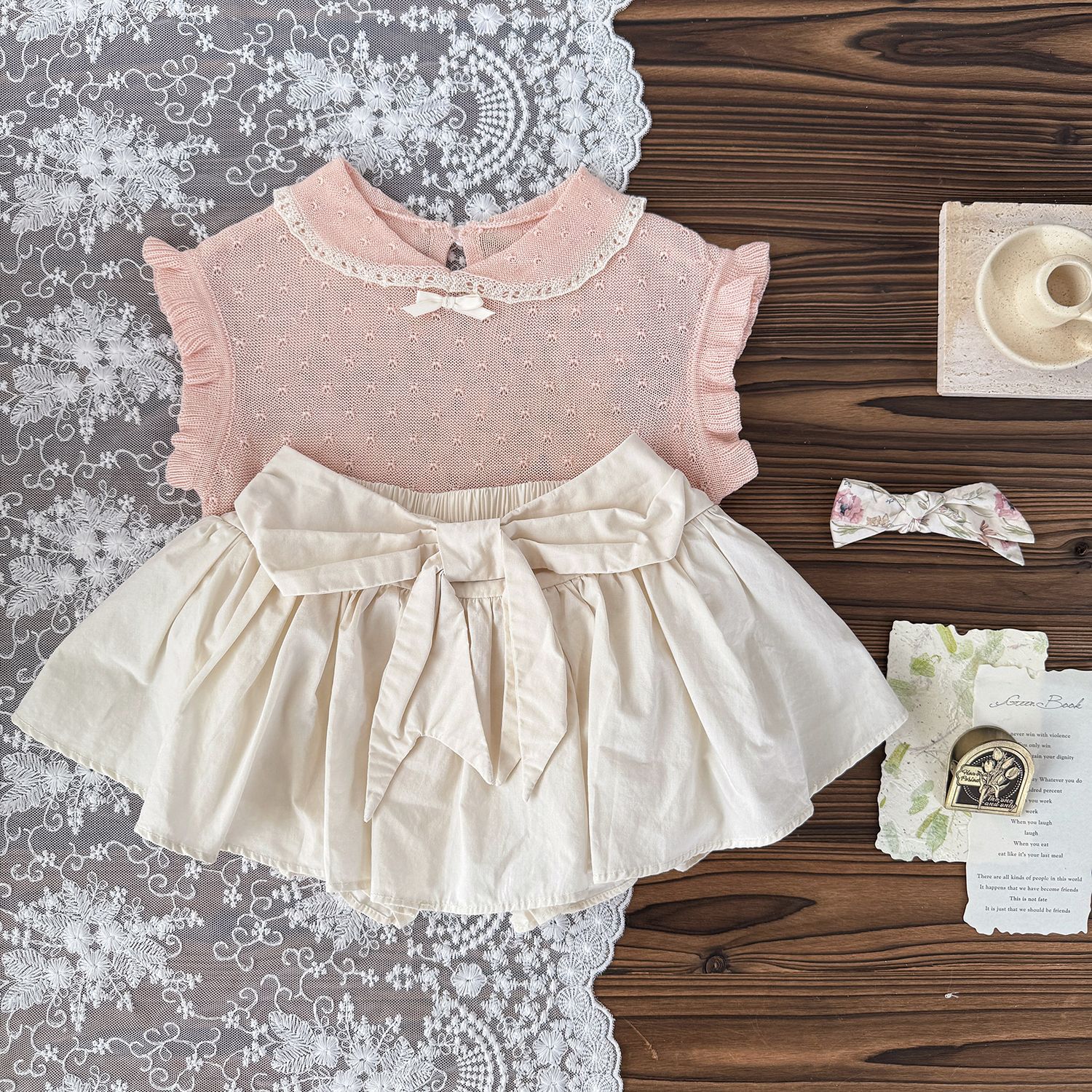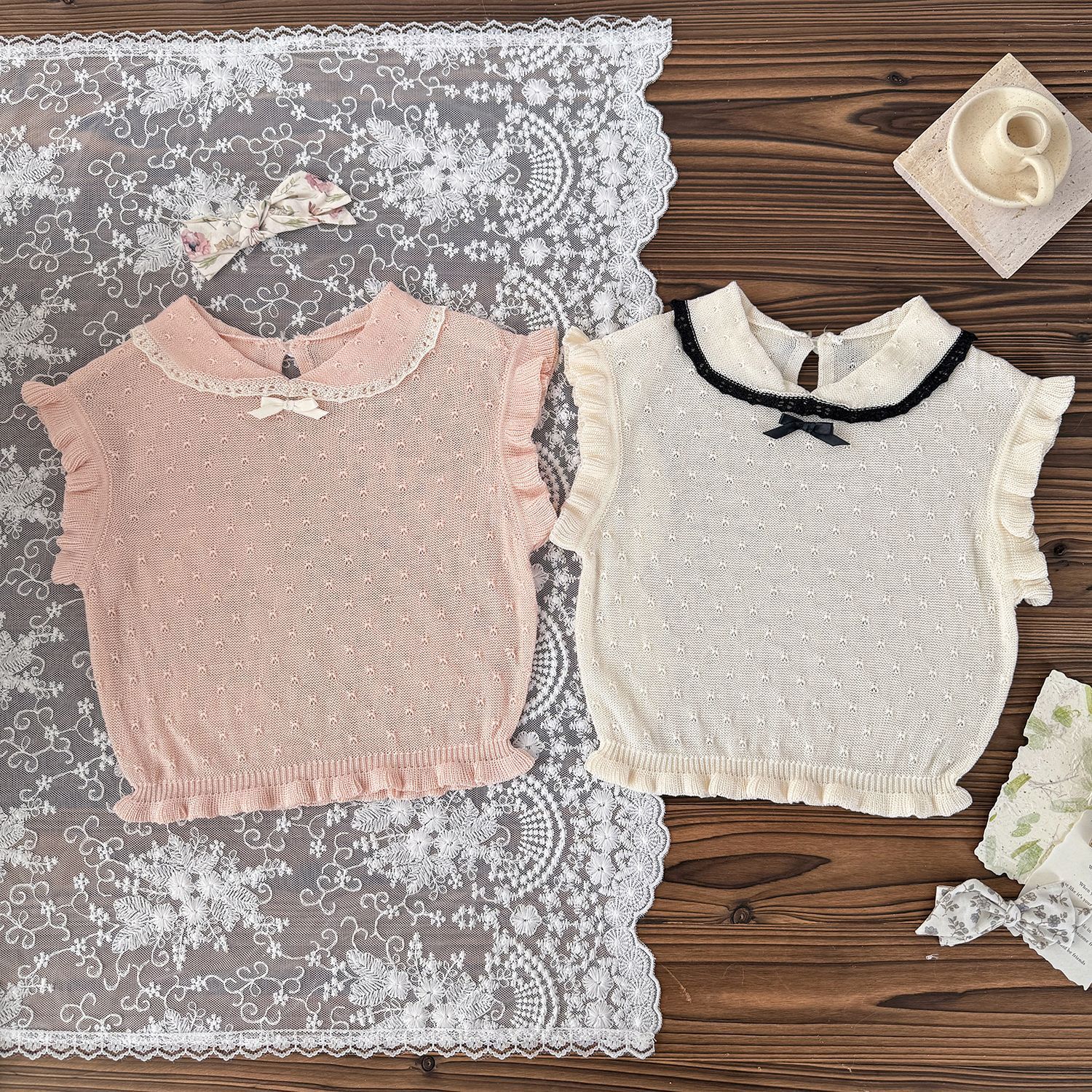 Cutemily 여름 아기 소녀 인형 칼라 니트 탑 아기 소녀 텐셀 중공 플라잉 슬리브 연꽃 잎 얇은 조끼