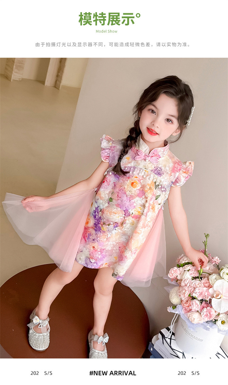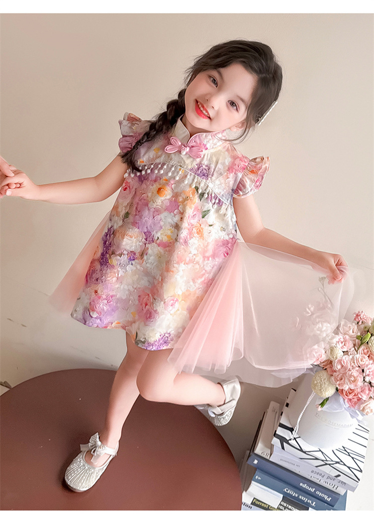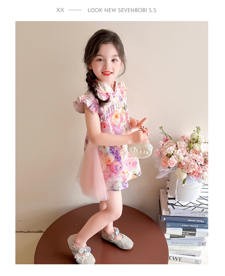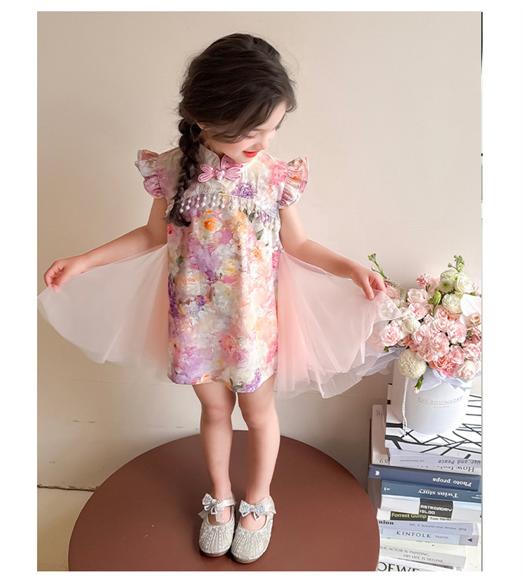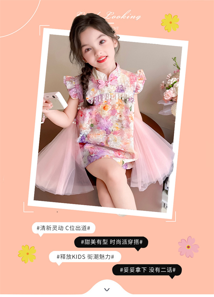 여자 구펑 플라잉 슬리브 청삼 스커트 2025 여름 새로운 패션 어린 소녀 세련된 원피스 어린이 치마