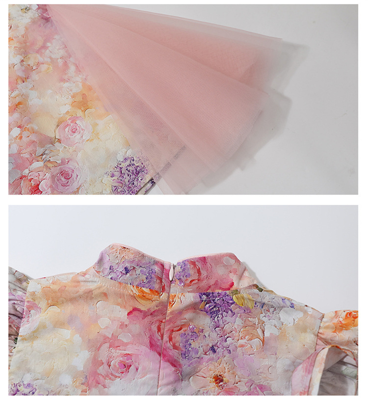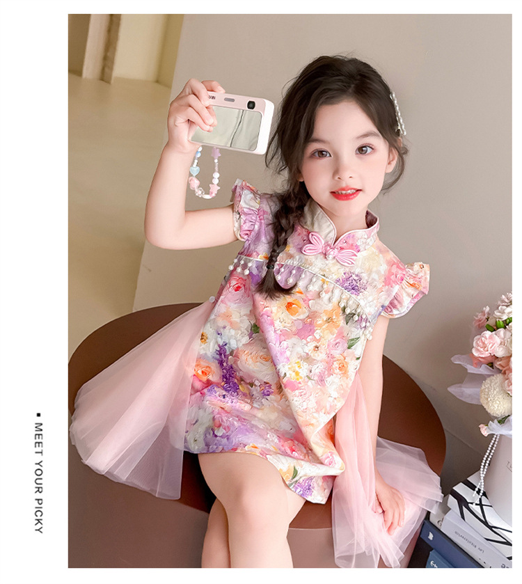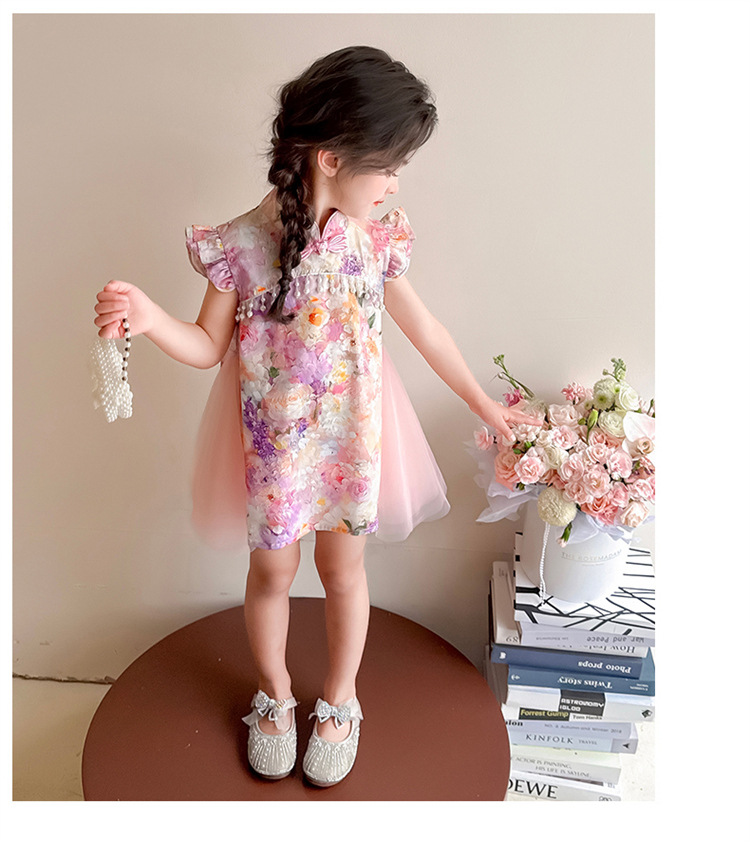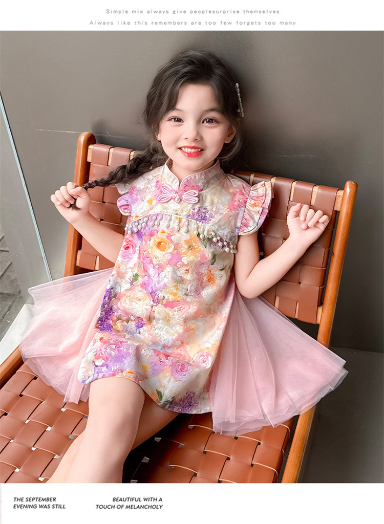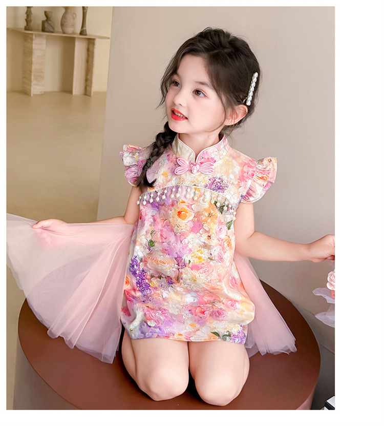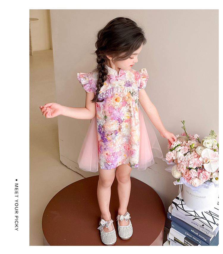 여자 구펑 플라잉 슬리브 청삼 스커트 2025 여름 새로운 패션 어린 소녀 세련된 원피스 어린이 치마