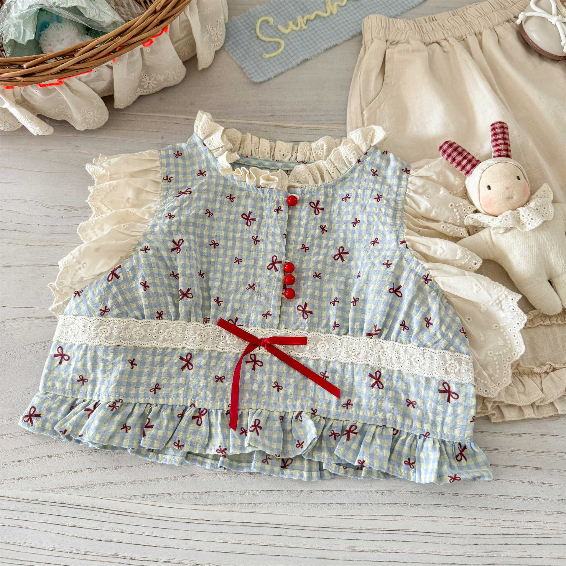 어린이 스타 라운드 스타일 소녀 여름 원피스 세트 어린이 격자 무늬 새로운 2 피스 세트 달콤한 아기 활 어린이 원피스 서양식
