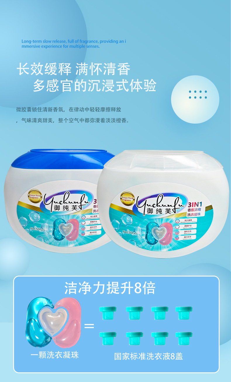 클렌징 및 향기로운 향을 지닌 Yuchunfu 농축 3 챔버 세탁 비즈 3-in-1 세탁 비즈 제조업체의 국경 간 영어 버전