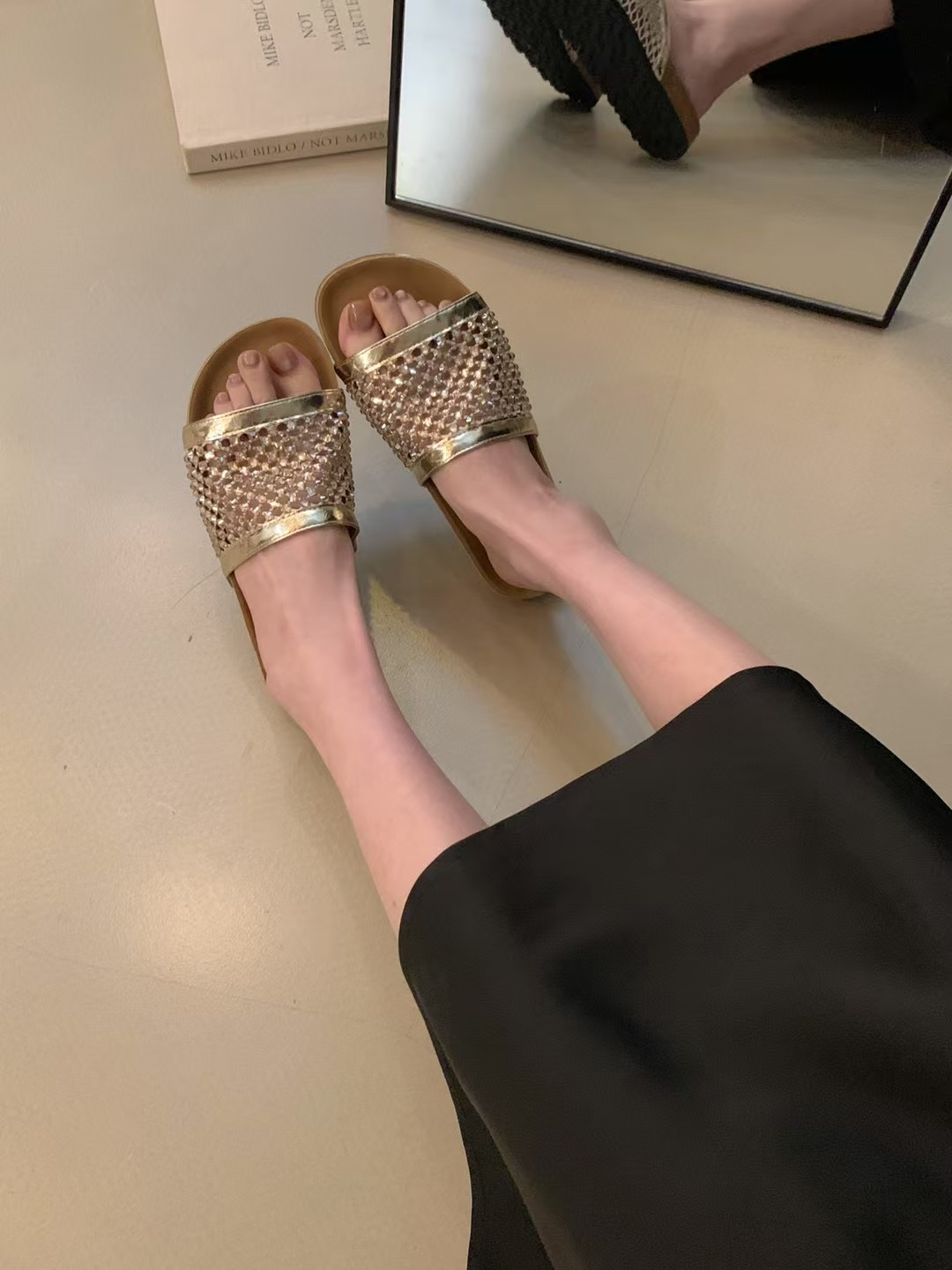 라인스톤 빈티지 메쉬 두꺼운 바닥 샌들과 슬리퍼 여성 2025 년 여름 유행 외출 해변 홀리데이 샌들 두꺼운 바닥