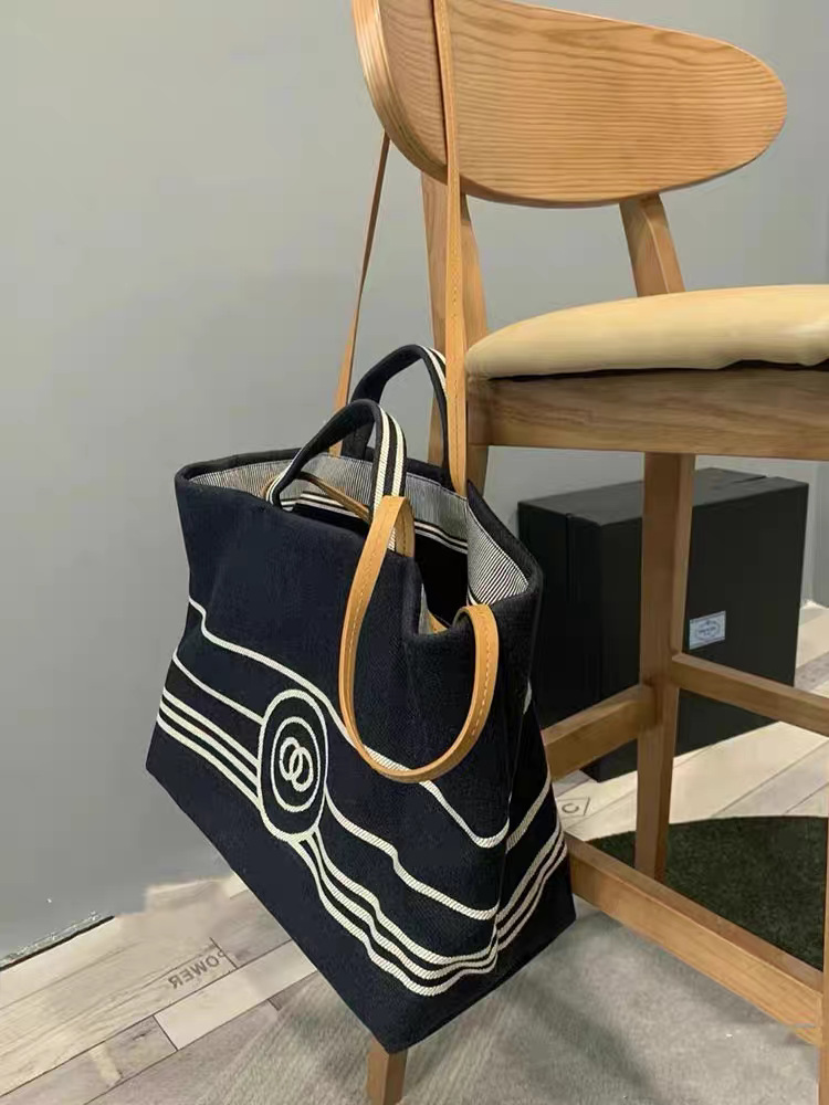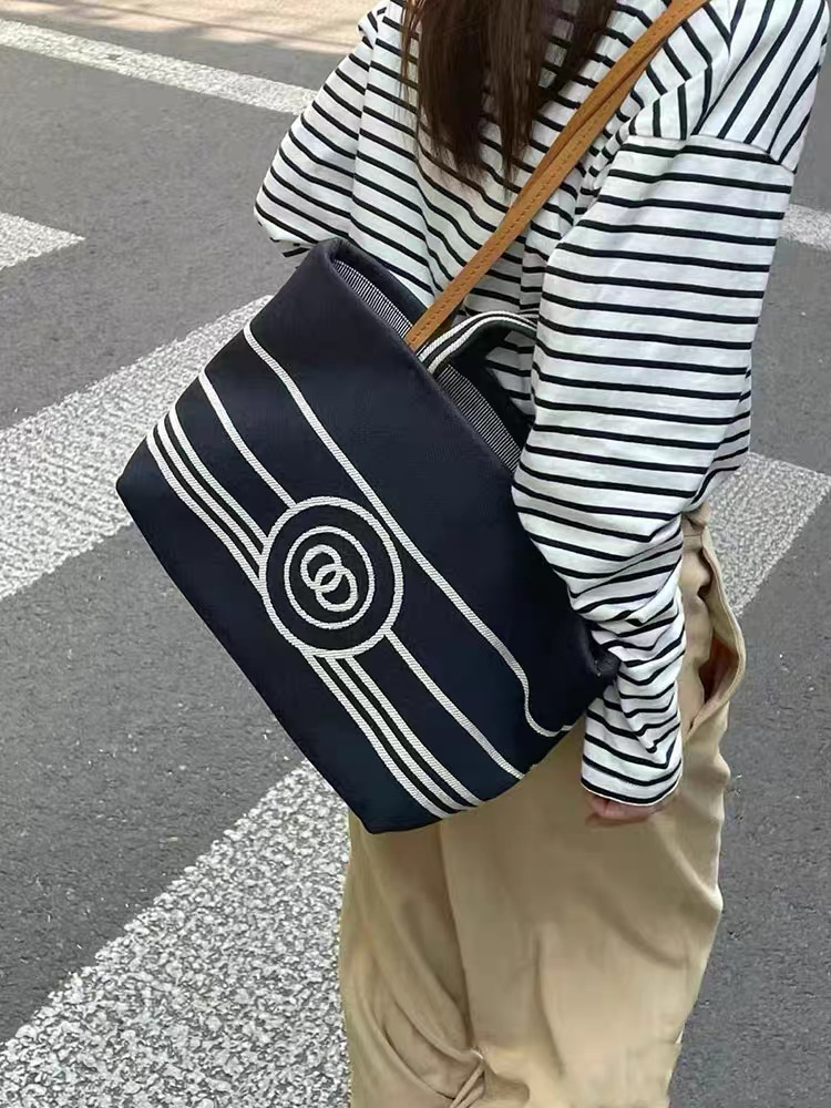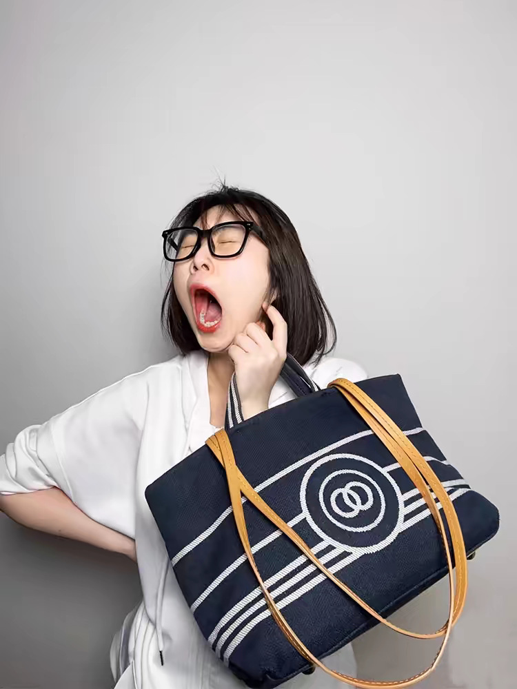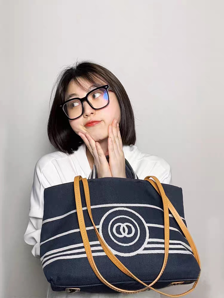 Xiaoxiangfeng 데님 토트 백 여성용 어깨 대용량 캔버스 통근 가방 고품질 네이비 스트라이프 비치 백