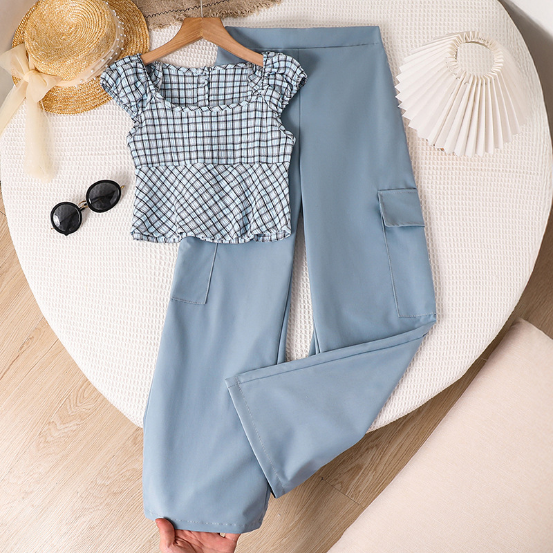 소녀의 세트 국경 아동복 2025 여름 새로운 달콤한 신선한 스타일 체크 무늬 반팔 인형 셔츠 넓은 다리 바지스토어 가기