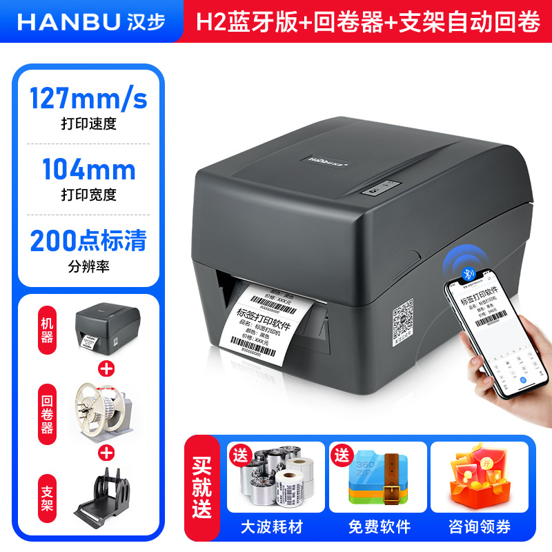 Hanbu Hanbu H2 블루투스 라벨 프린터 데스크탑 바코드 프린터 203dpi 열전사 구리 코팅 자체 접착