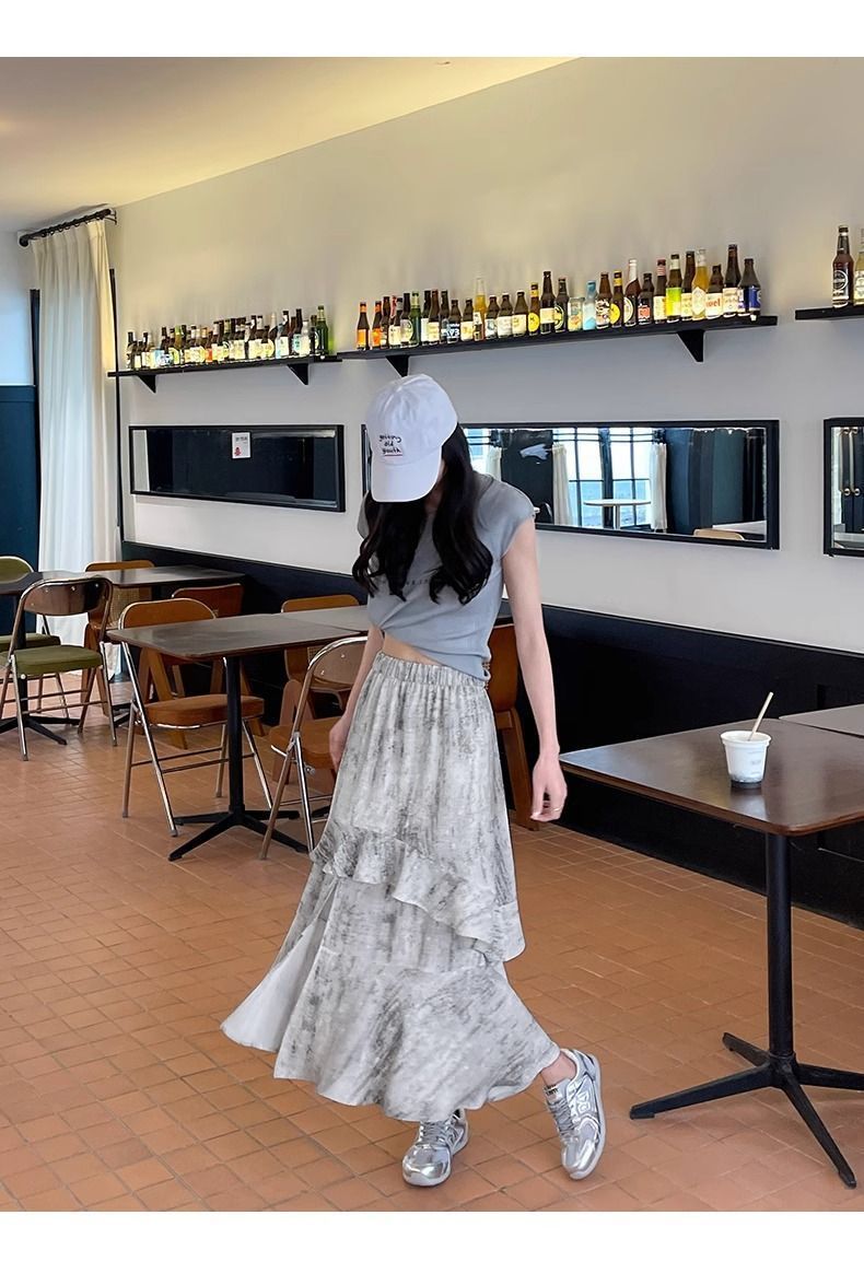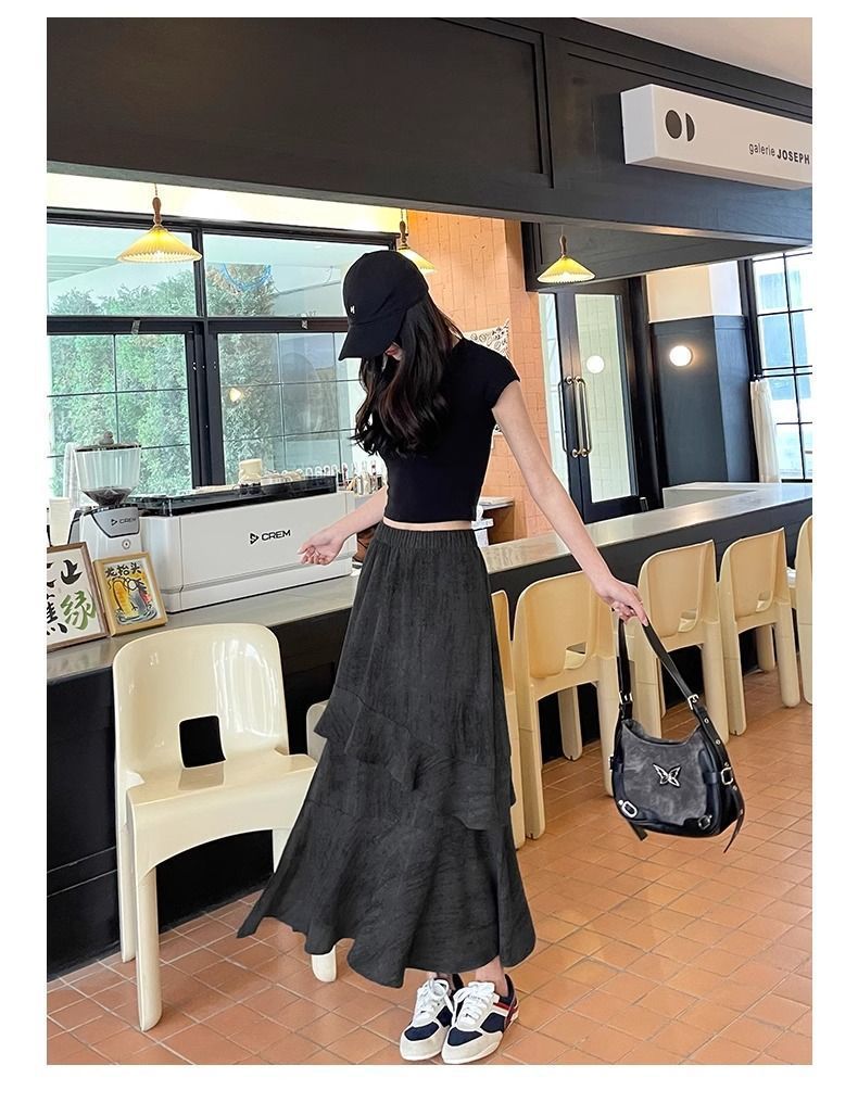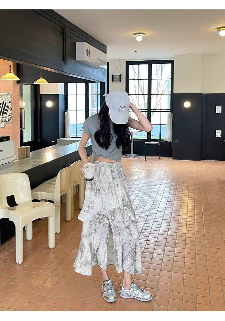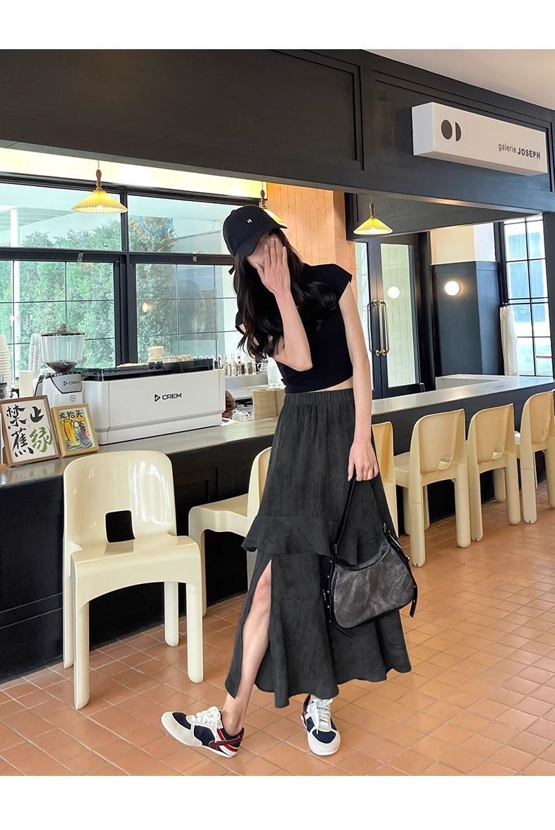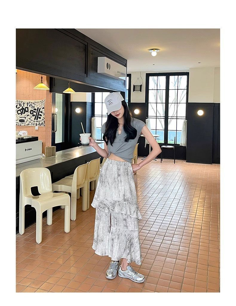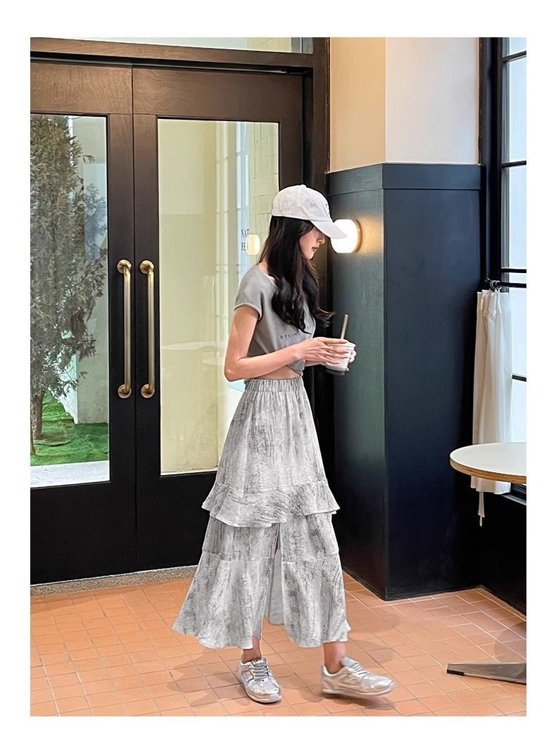 2025 년 여름 새로운 스타일 스플릿 펄럭이는 치마 여성의 높은 허리 주름 불규칙한 치마 우산 치마스토어 가기