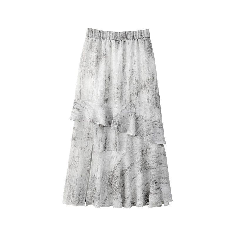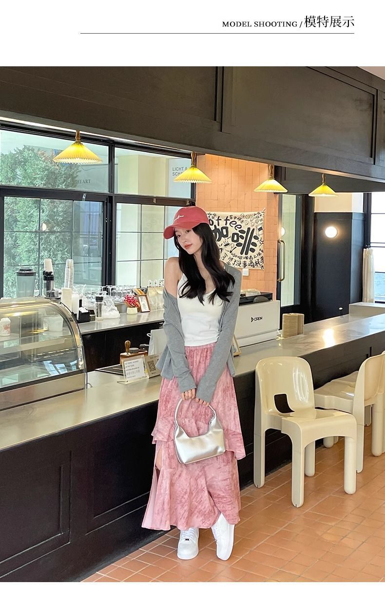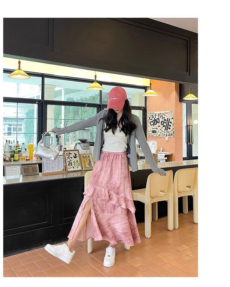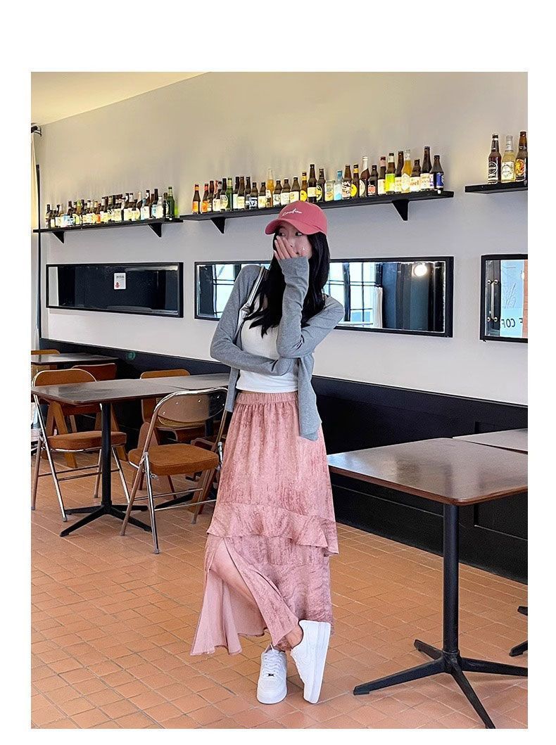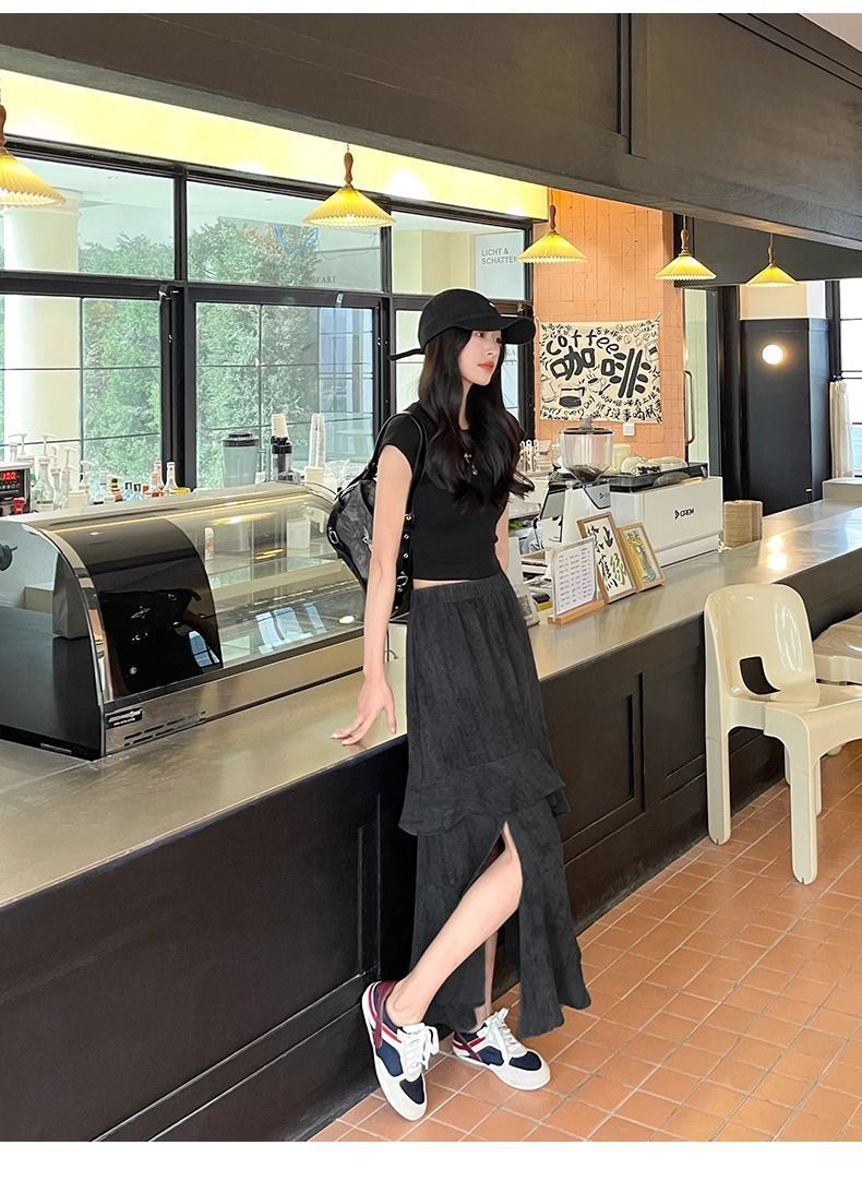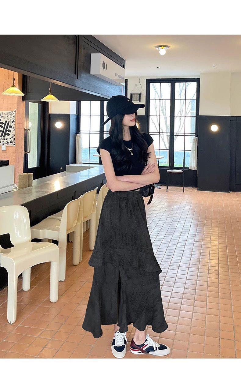 2025 년 여름 새로운 스타일 스플릿 펄럭이는 치마 여성의 높은 허리 주름 불규칙한 치마 우산 치마스토어 가기