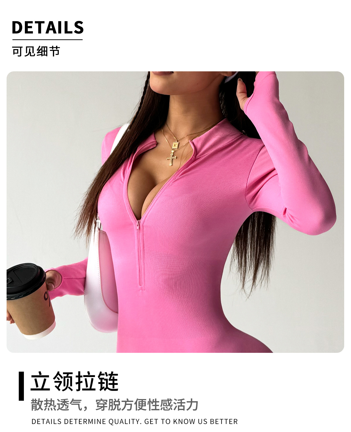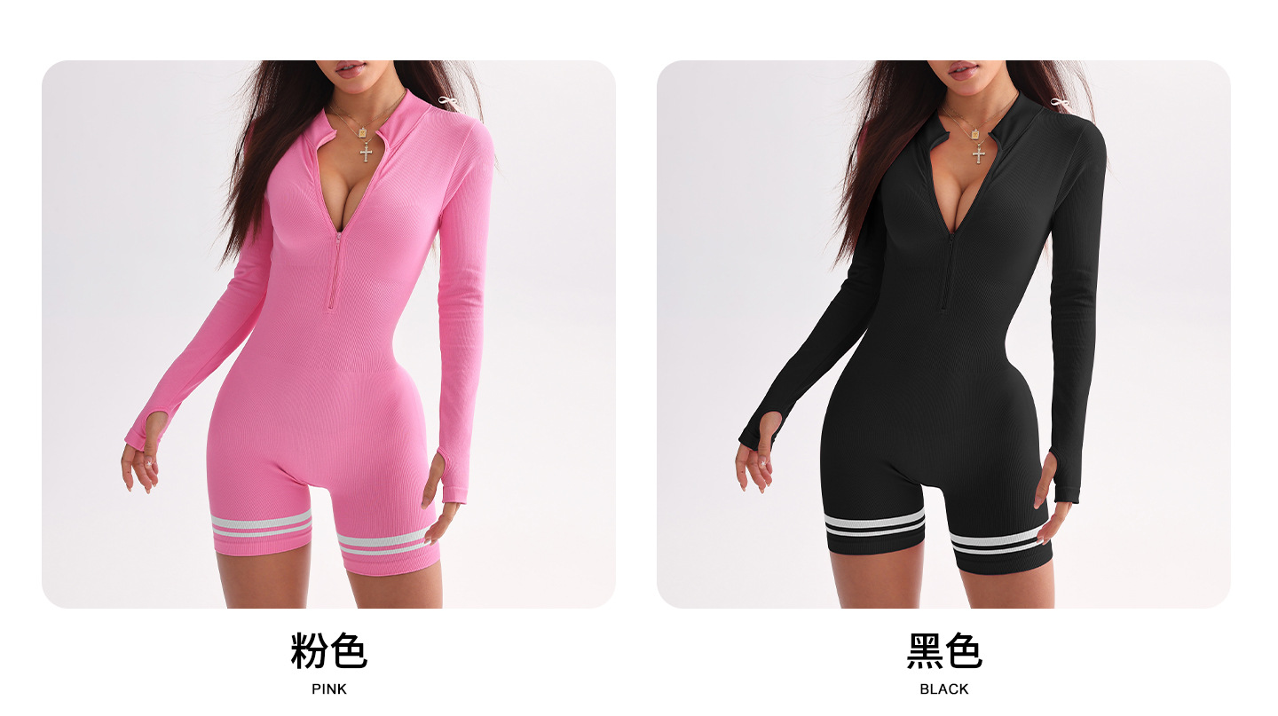 希音爆款圆领拉链长袖连体服短裤学院风瑜伽连体衣紧身瑜伽服女