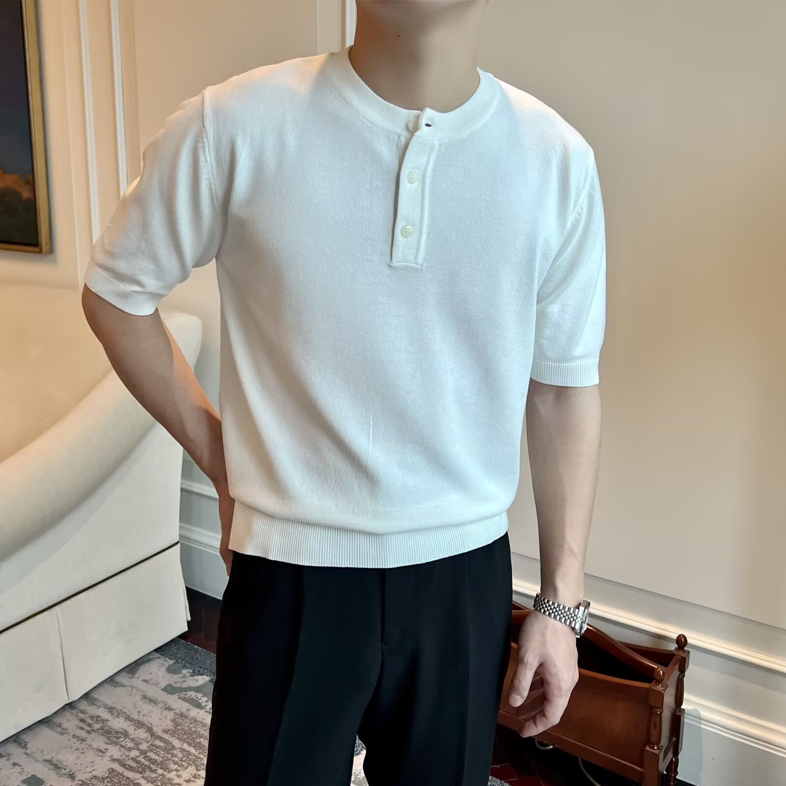 헨리 칼라 반팔 스웨터 남성 영국 비즈니스 슬림 여름 아이스 실크 통기성 티셔츠 조수 대외 무역 국경 도매스토어 가기