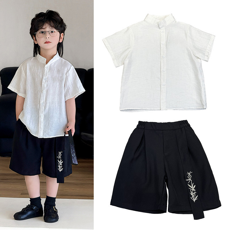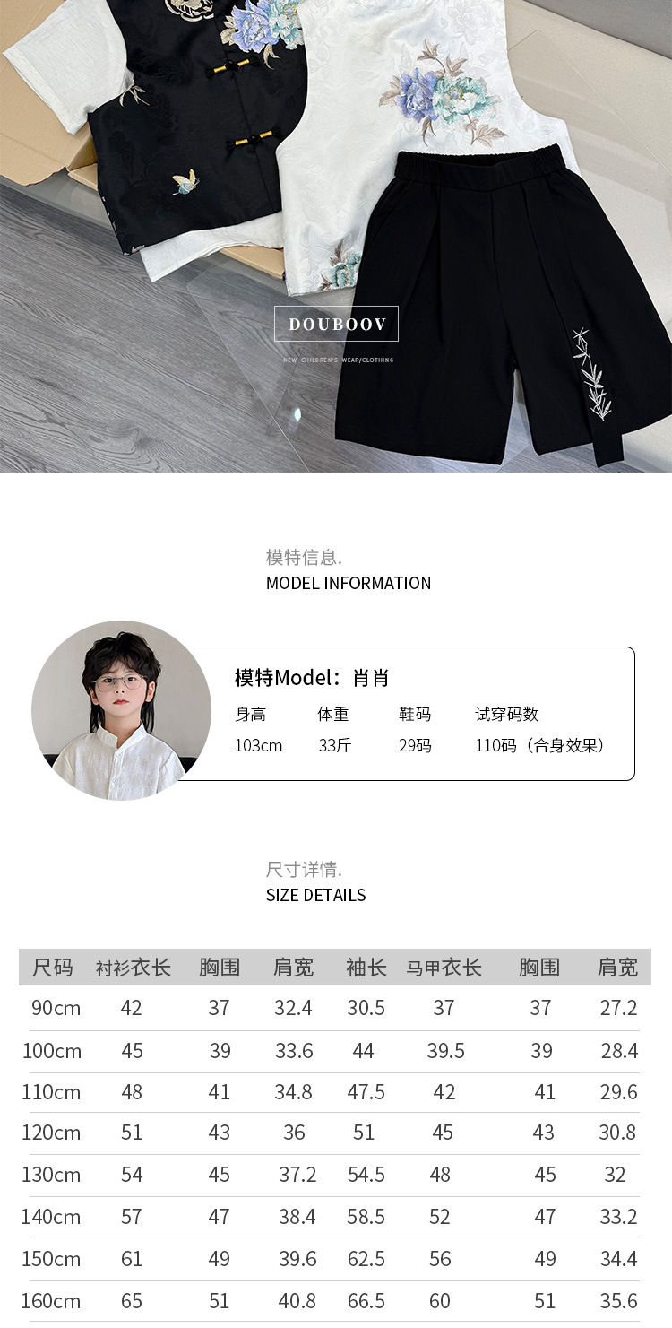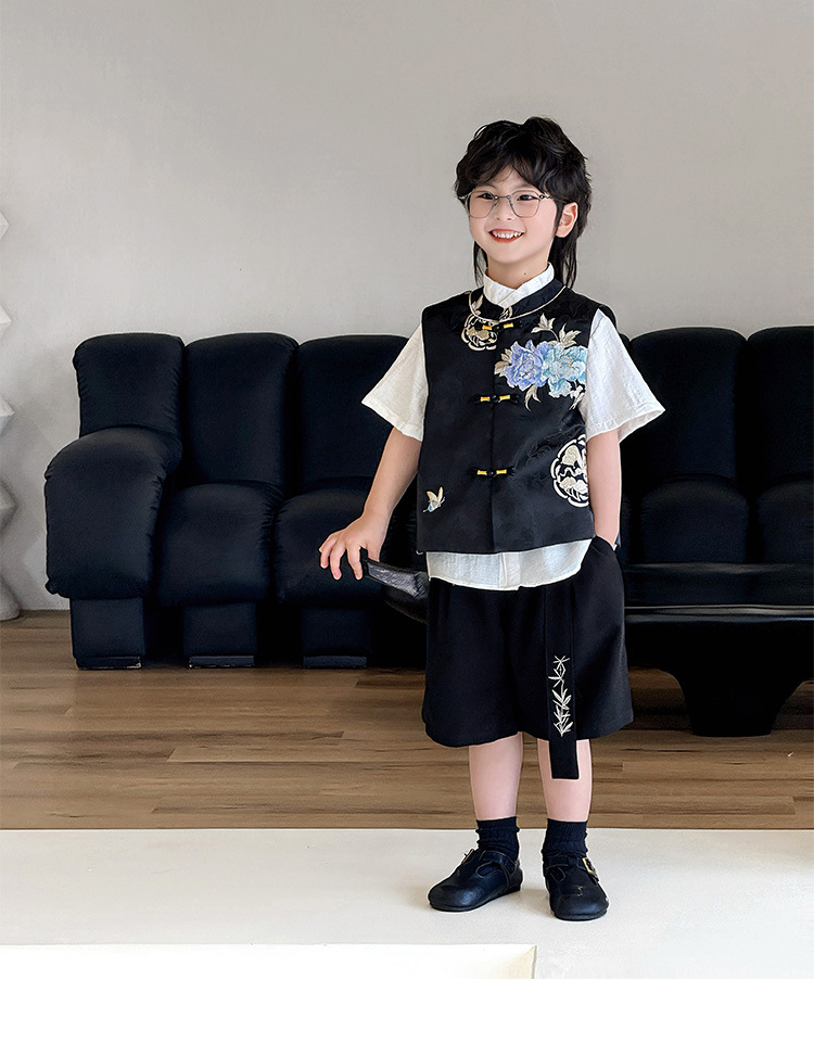 • 블랙 조끼 + 면 및 린넨 짧은 안감 + 블랙 자수 리본 반바지