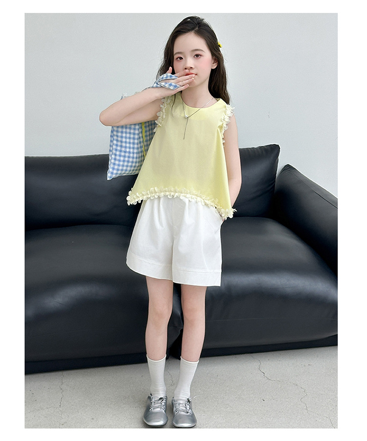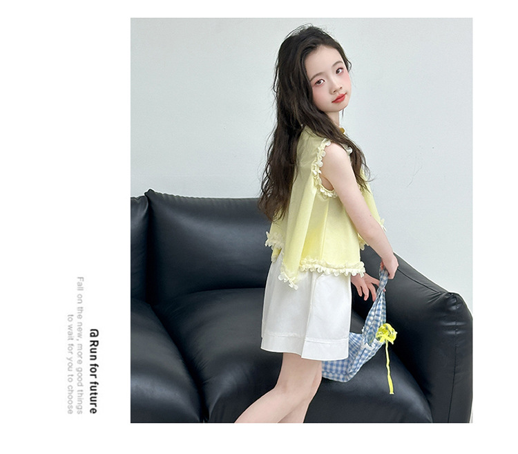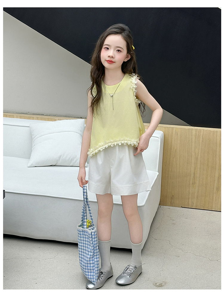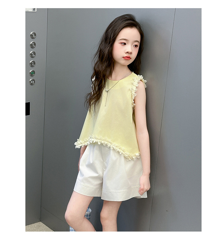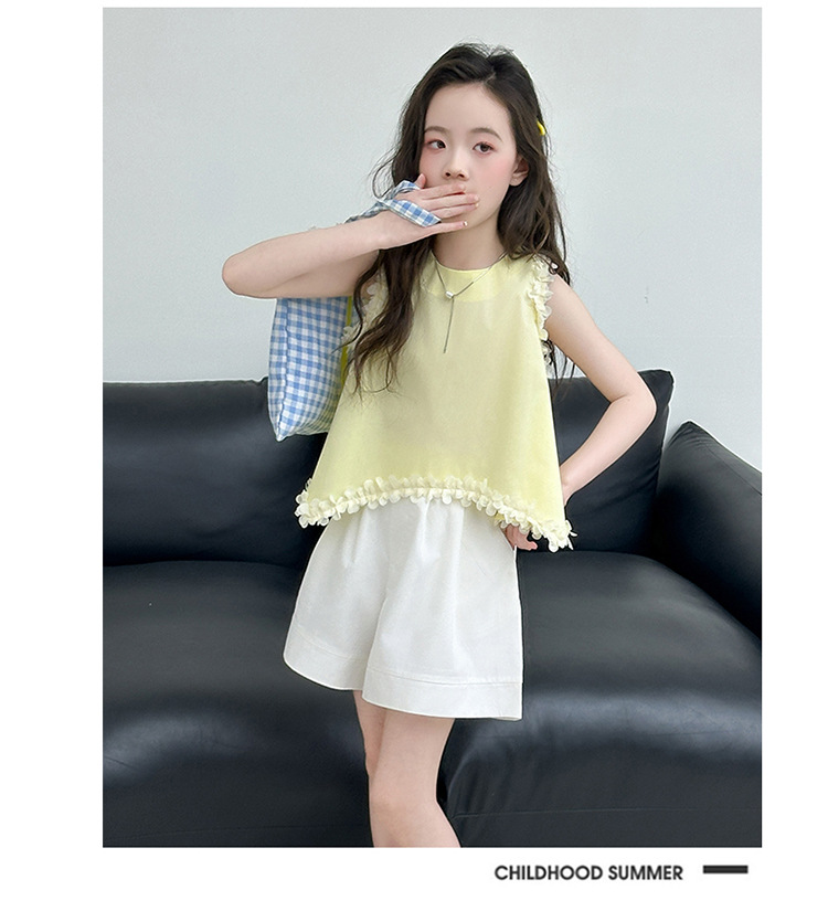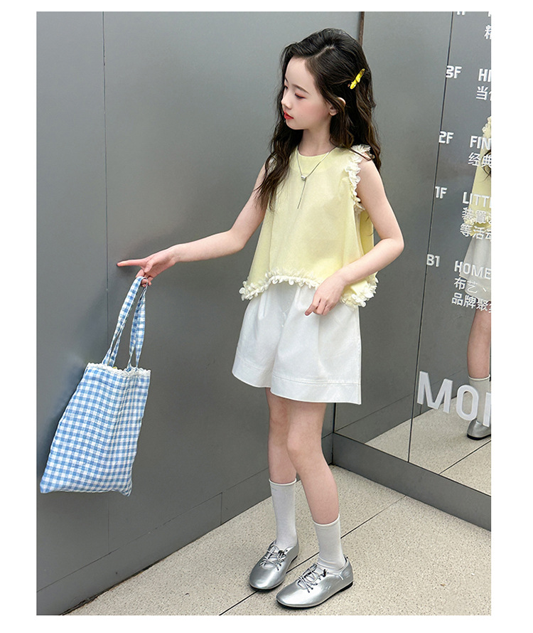 여자 여름 세트 2025 새로운 어린이 패션 우아한 불규칙한 레이스 민소매 인형 셔츠 반바지 세트스토어 가기