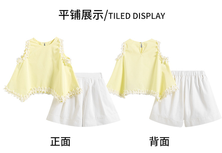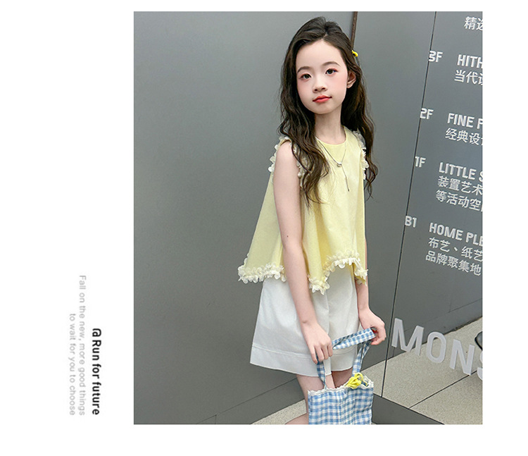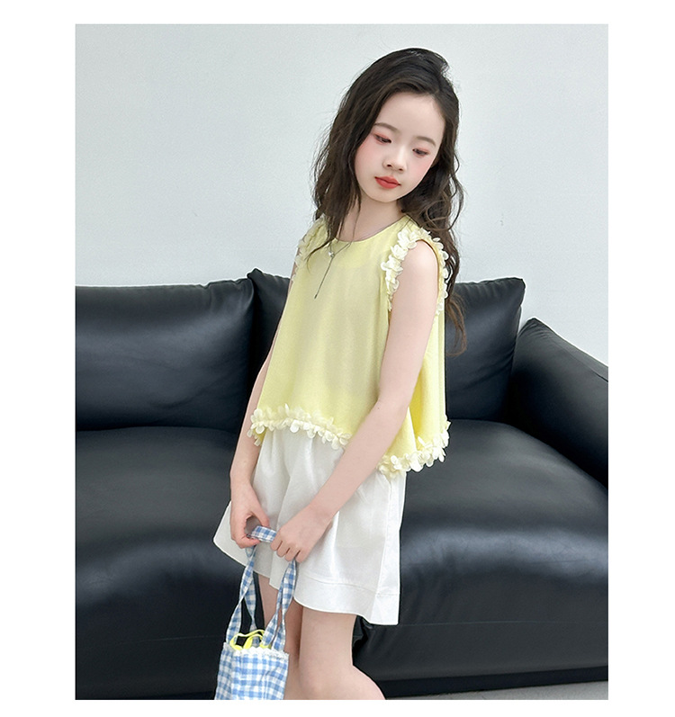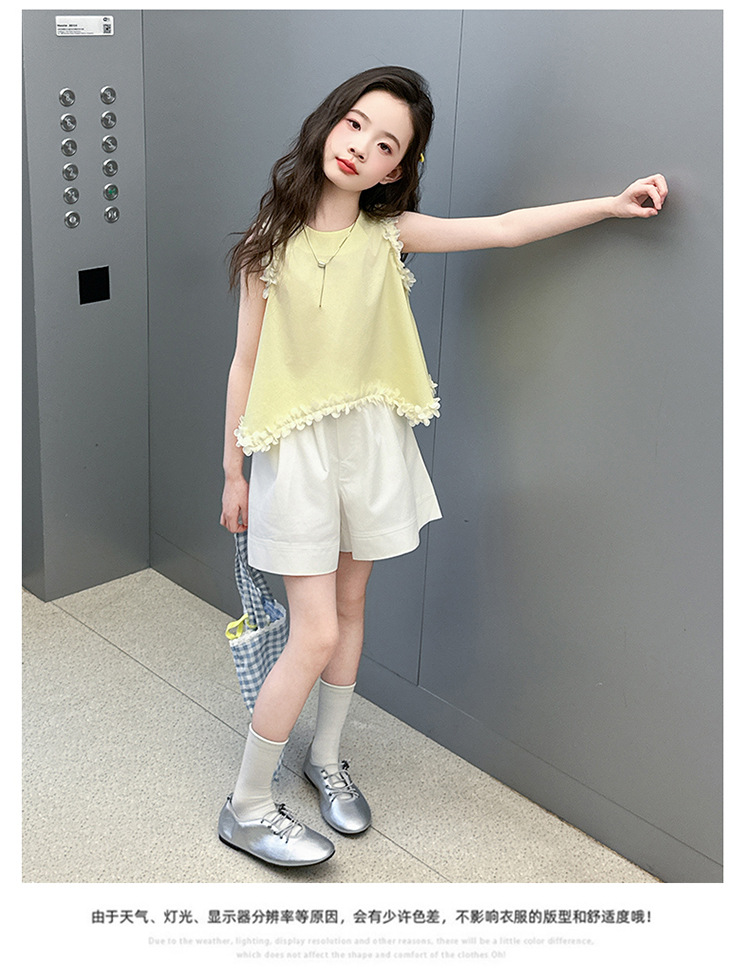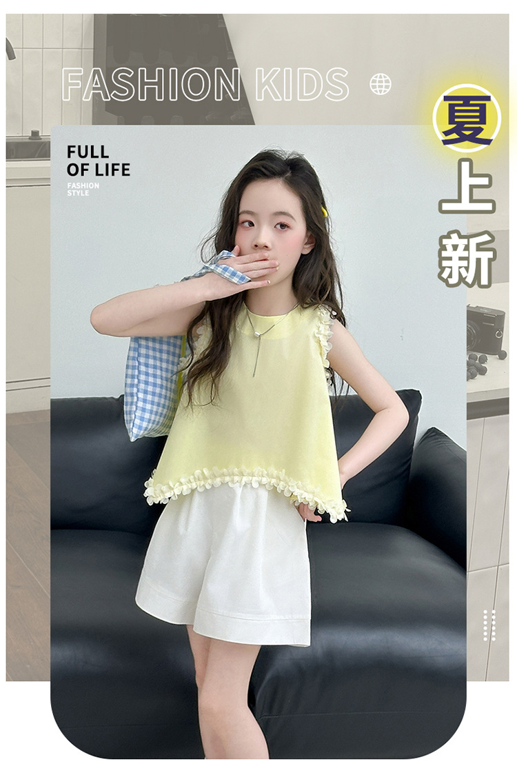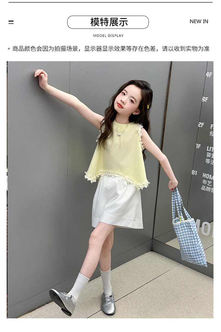 여자 여름 세트 2025 새로운 어린이 패션 우아한 불규칙한 레이스 민소매 인형 셔츠 반바지 세트스토어 가기