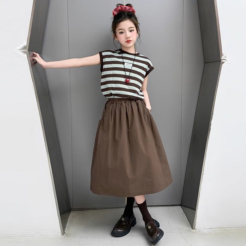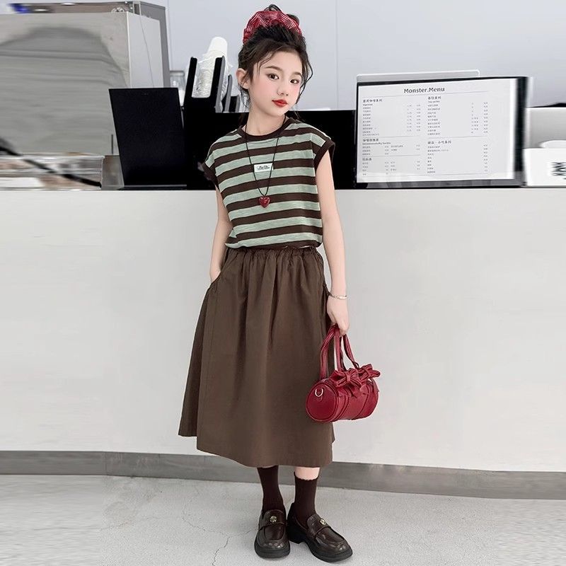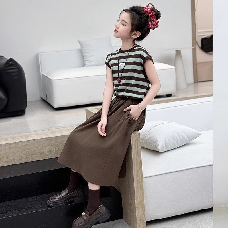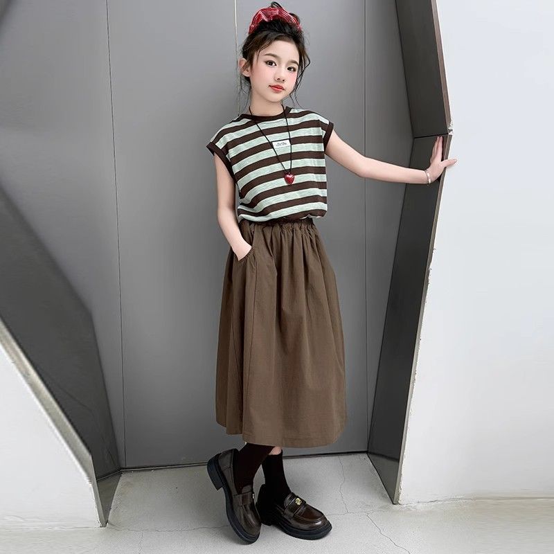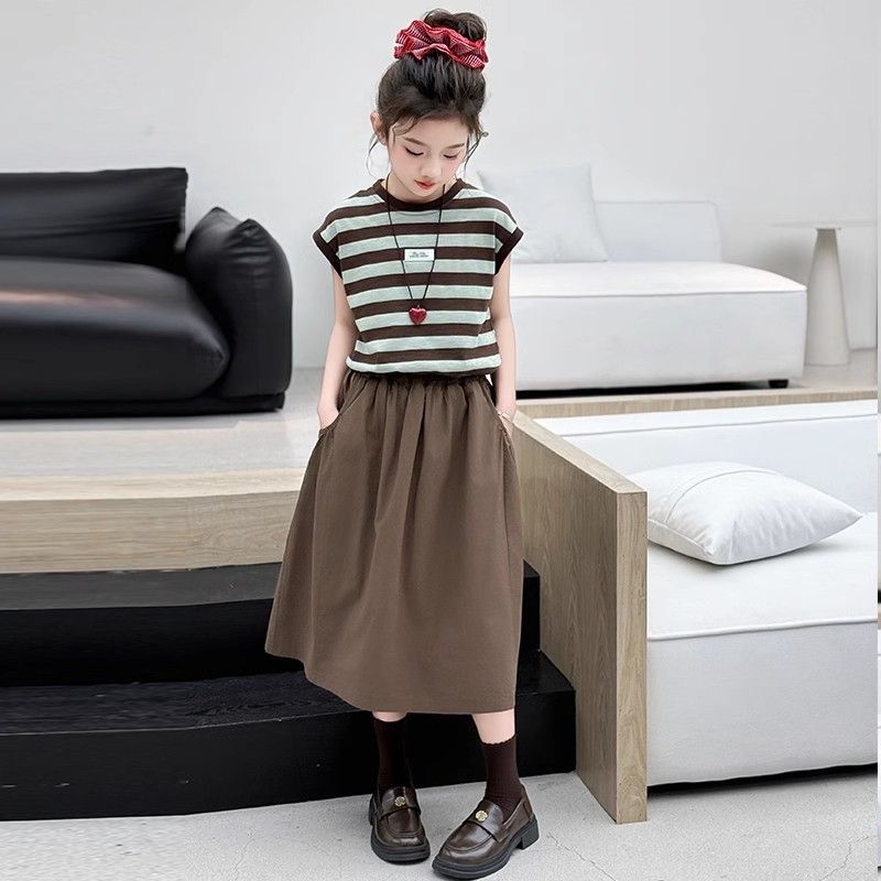여자 정장 여름 2025 새로운 여자 줄무늬 반팔 반팔 스커트 세련된 여름 투피스 세트