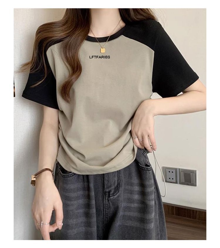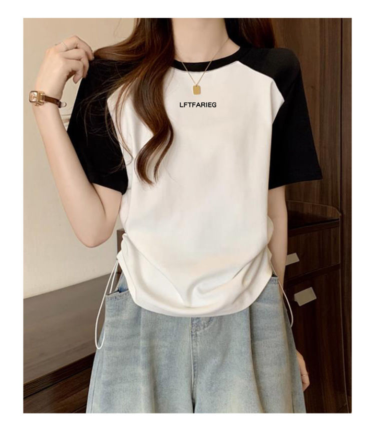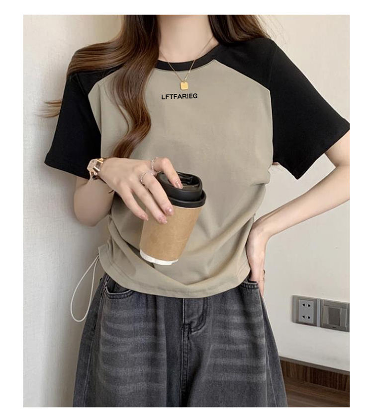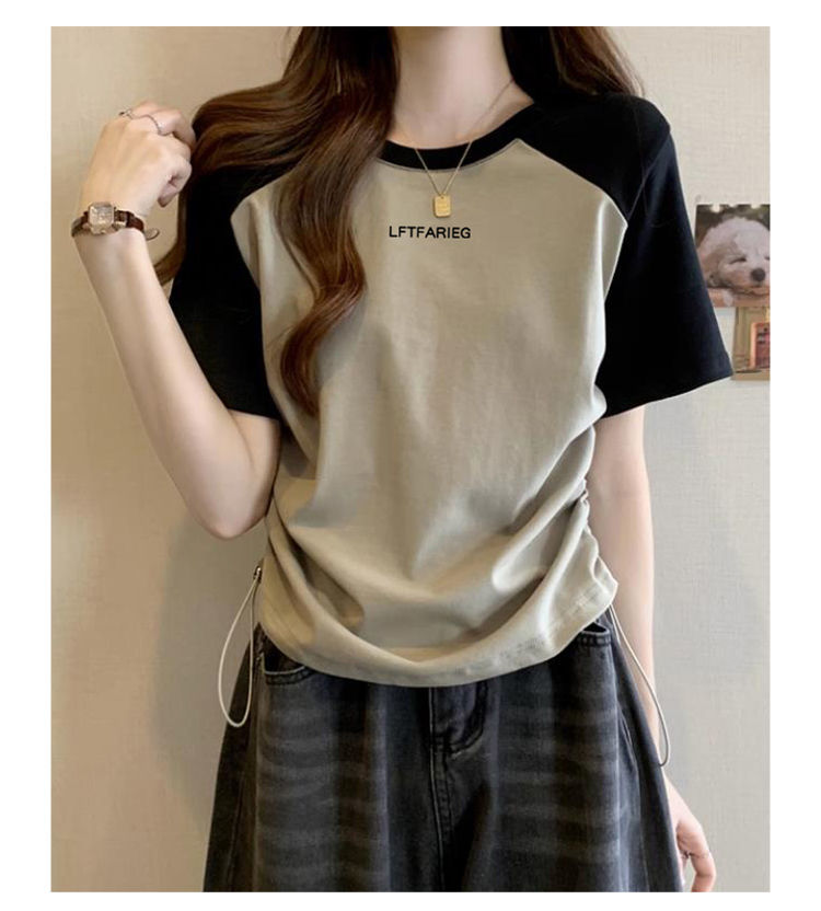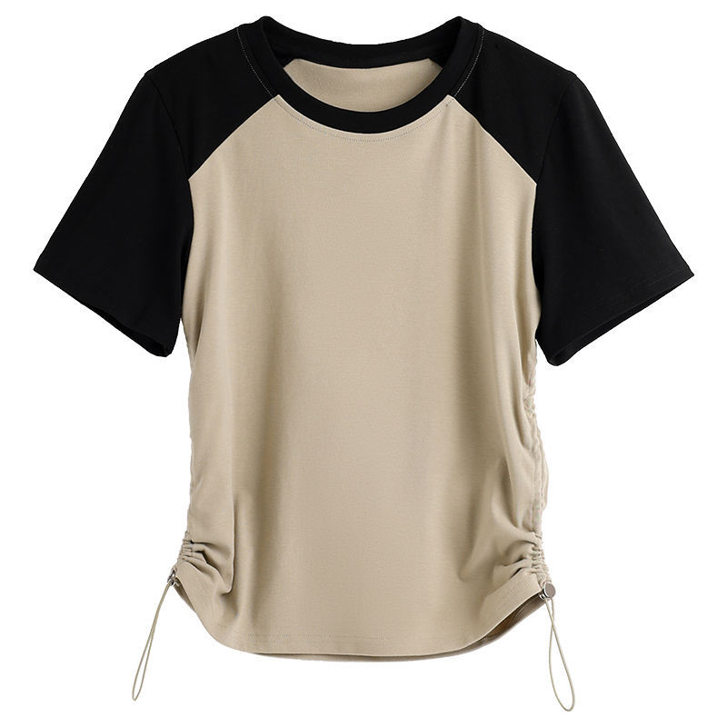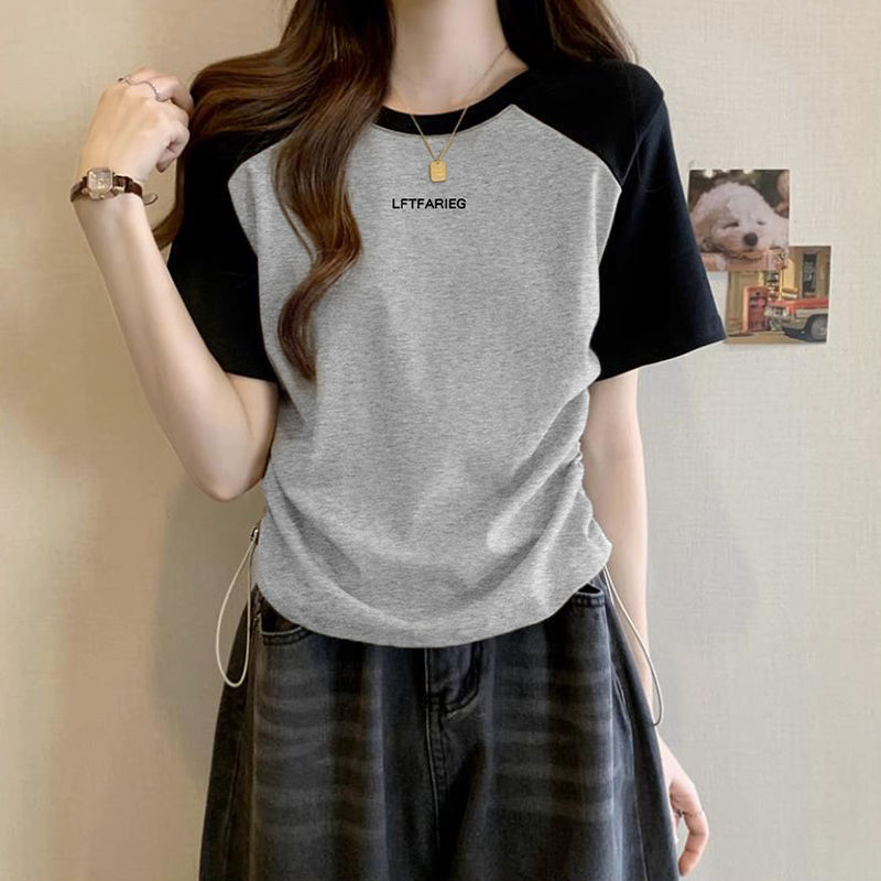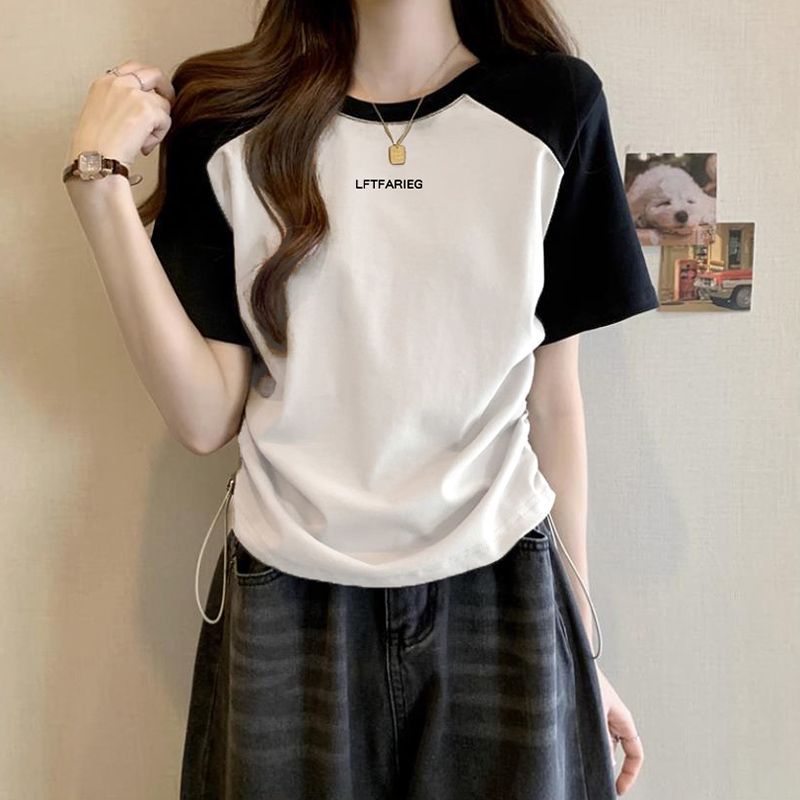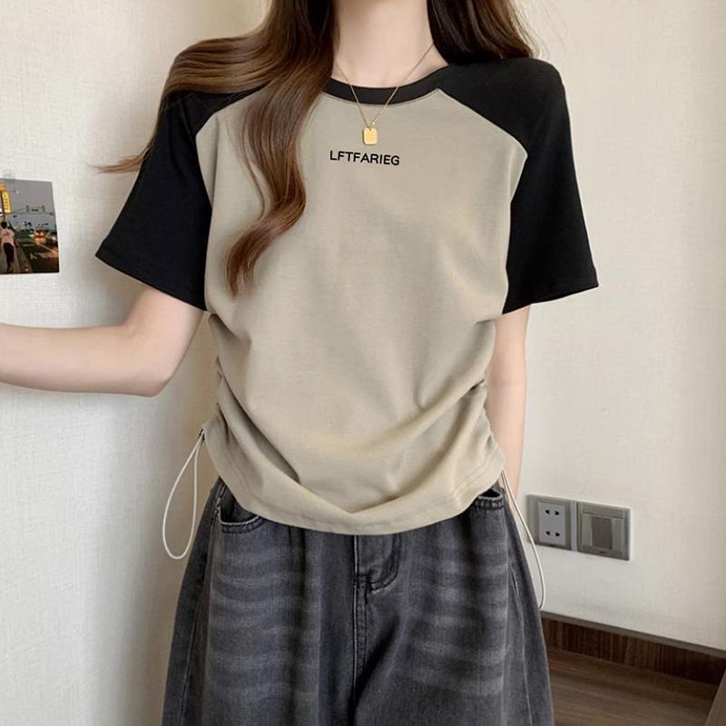 여성용 오른쪽 어깨 반팔 티셔츠 2025 새로운 여름 디자인 틈새 허리 조임 끈 슬리밍 라글란 쇼트 탑