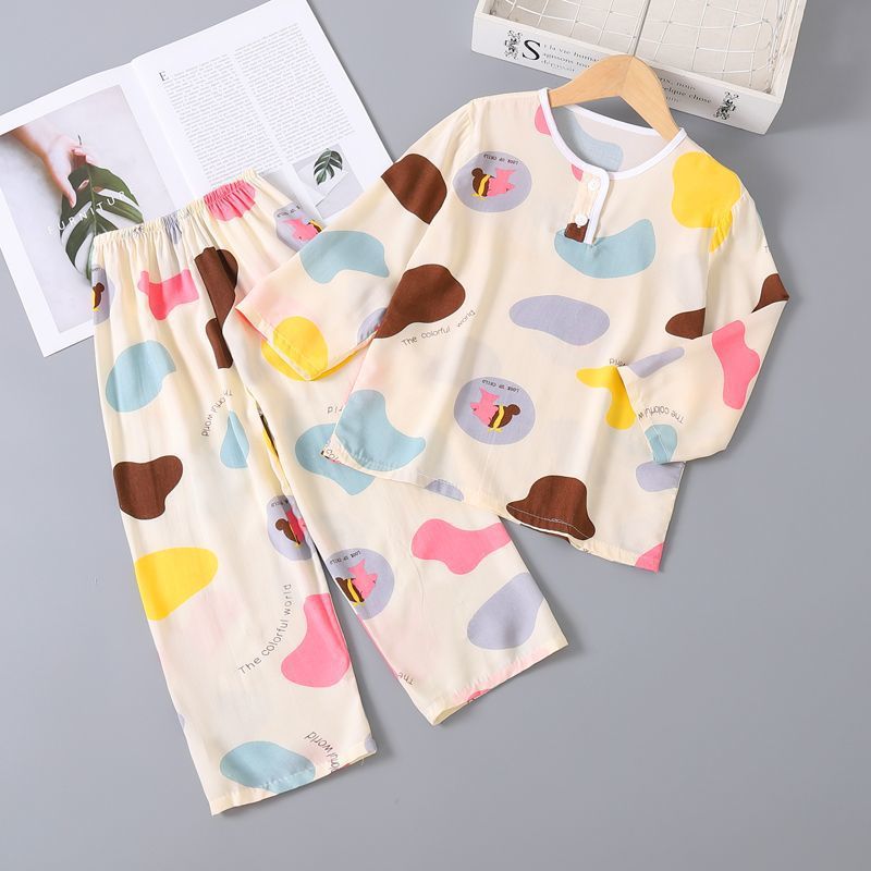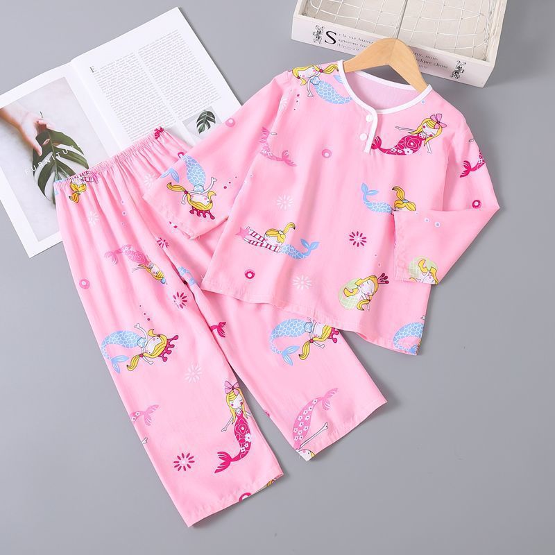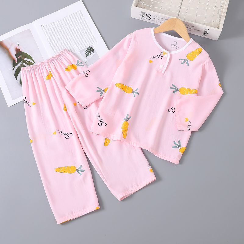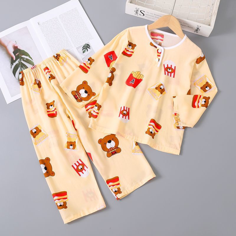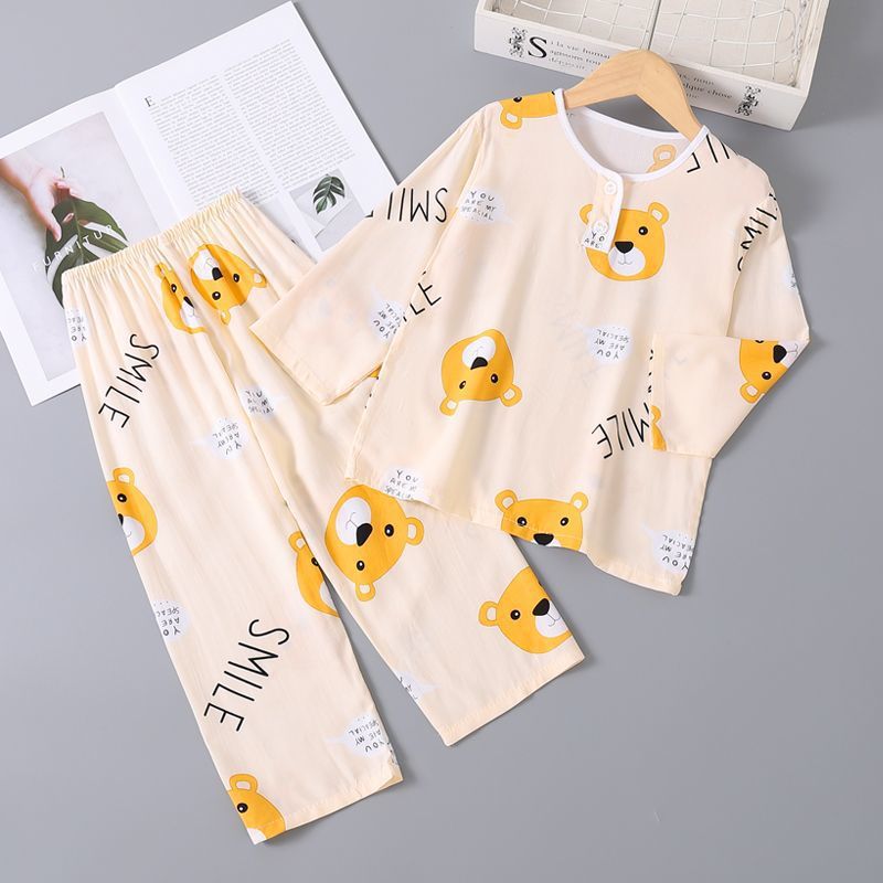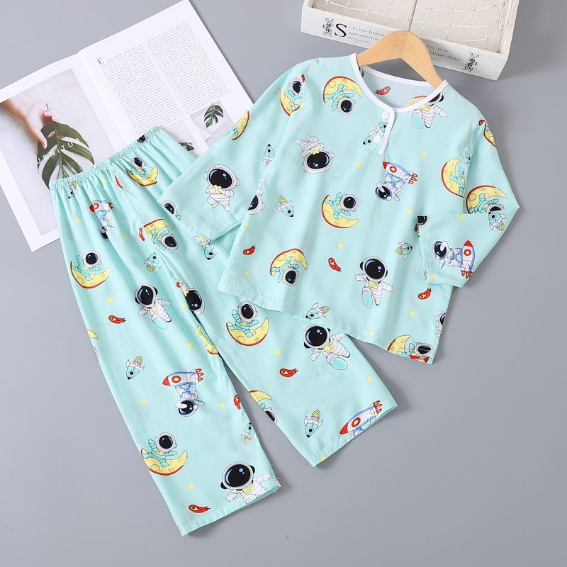 여름 어린이 베이비 코튼 실크 소년 잠옷 긴팔 소년과 소녀 에어컨 얇은 코튼 실크 가정 의류 세트