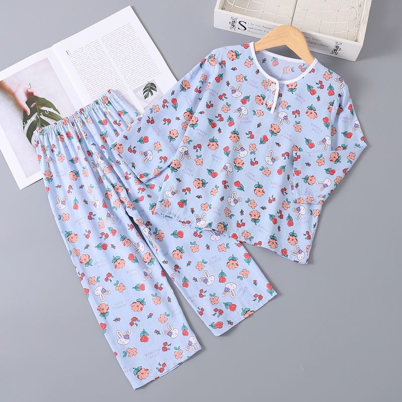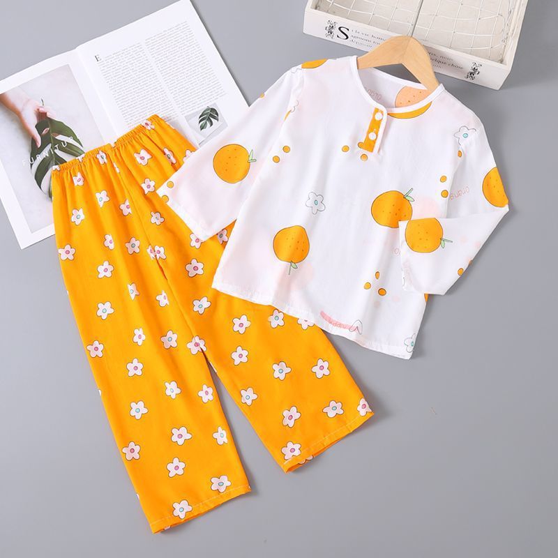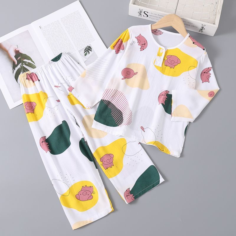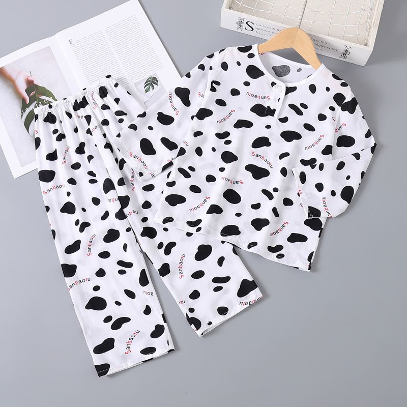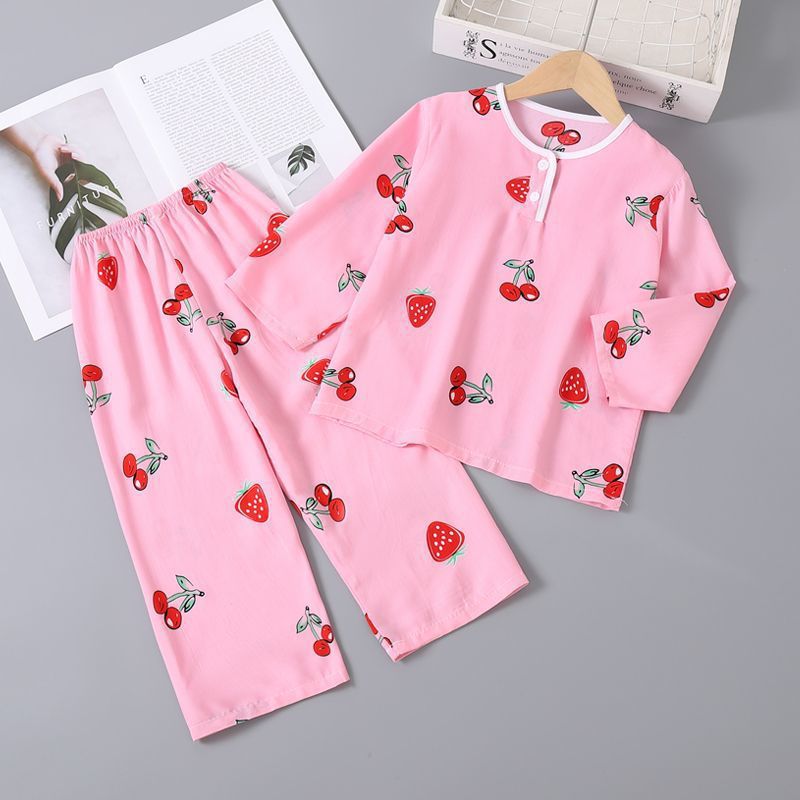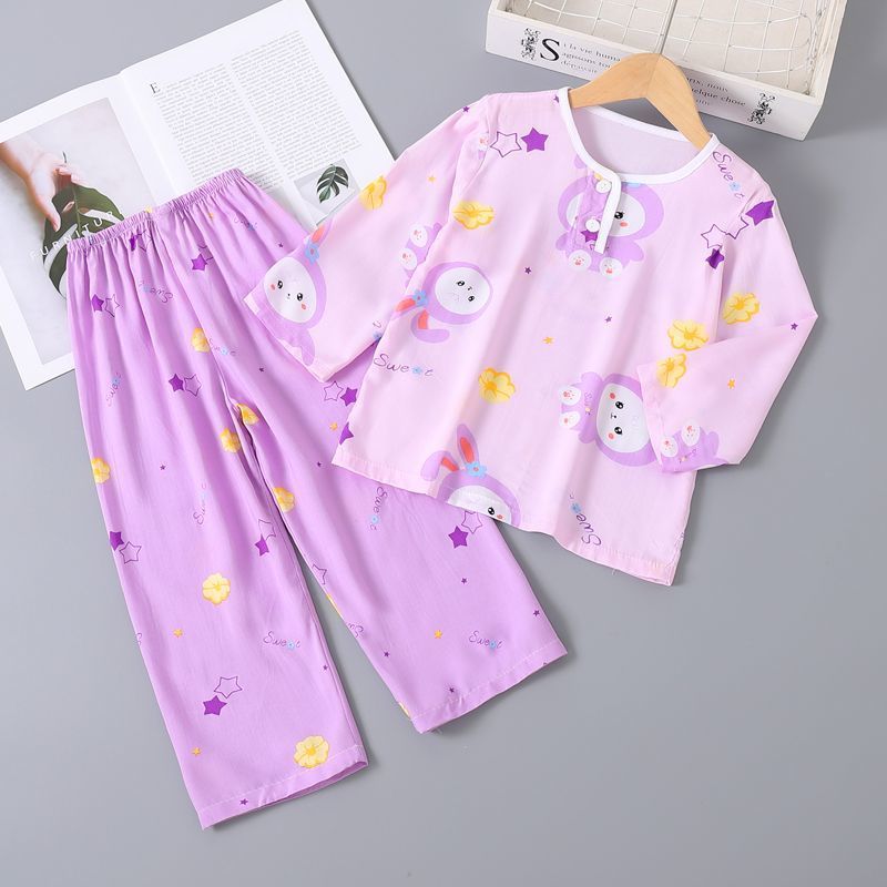여름 어린이 베이비 코튼 실크 소년 잠옷 긴팔 소년과 소녀 에어컨 얇은 코튼 실크 가정 의류 세트