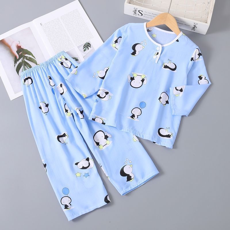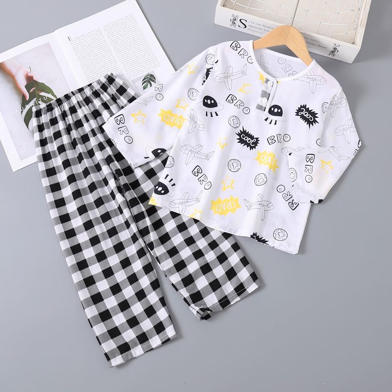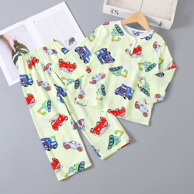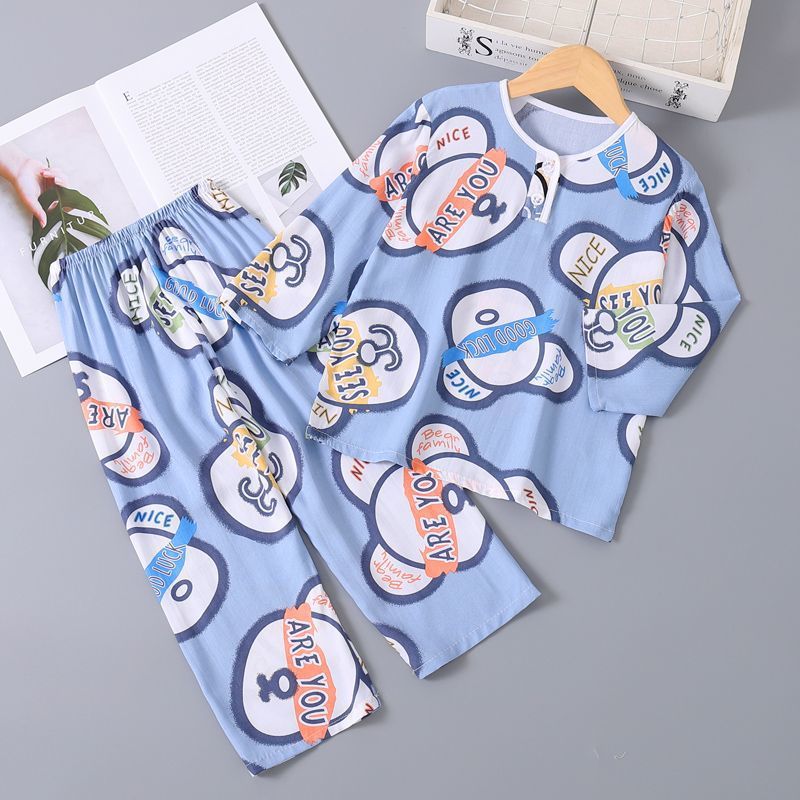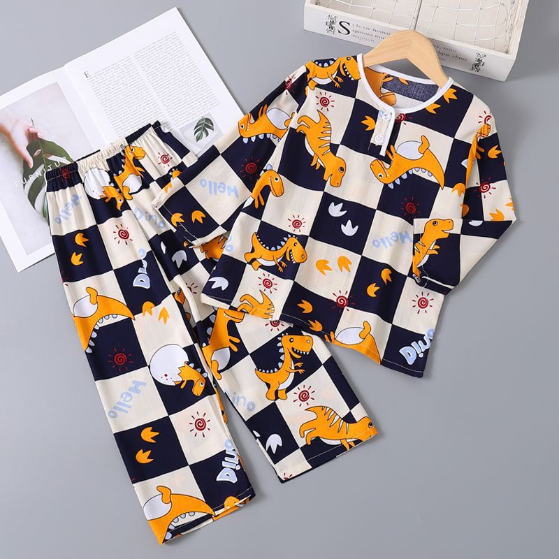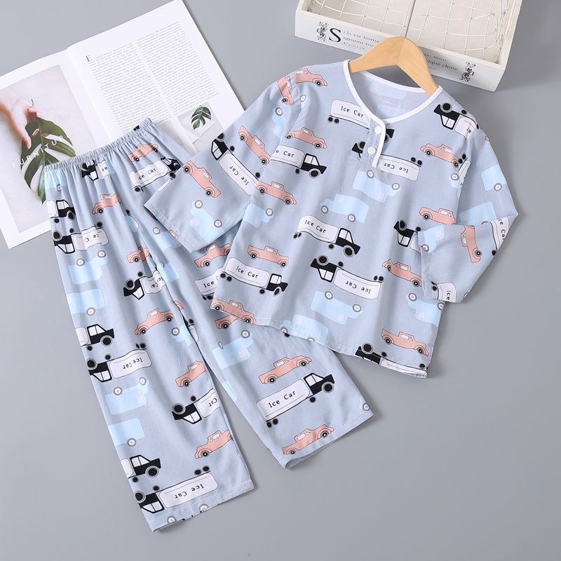 여름 어린이 베이비 코튼 실크 소년 잠옷 긴팔 소년과 소녀 에어컨 얇은 코튼 실크 가정 의류 세트스토어 가기