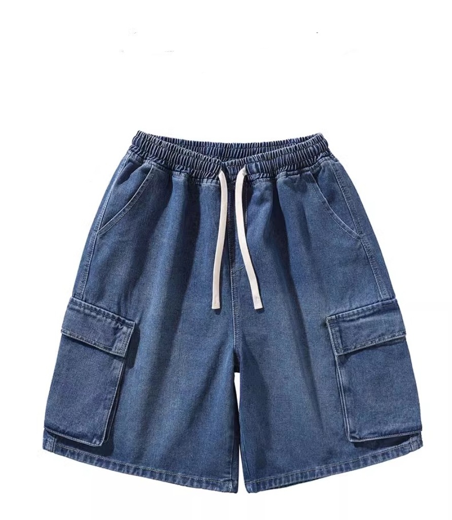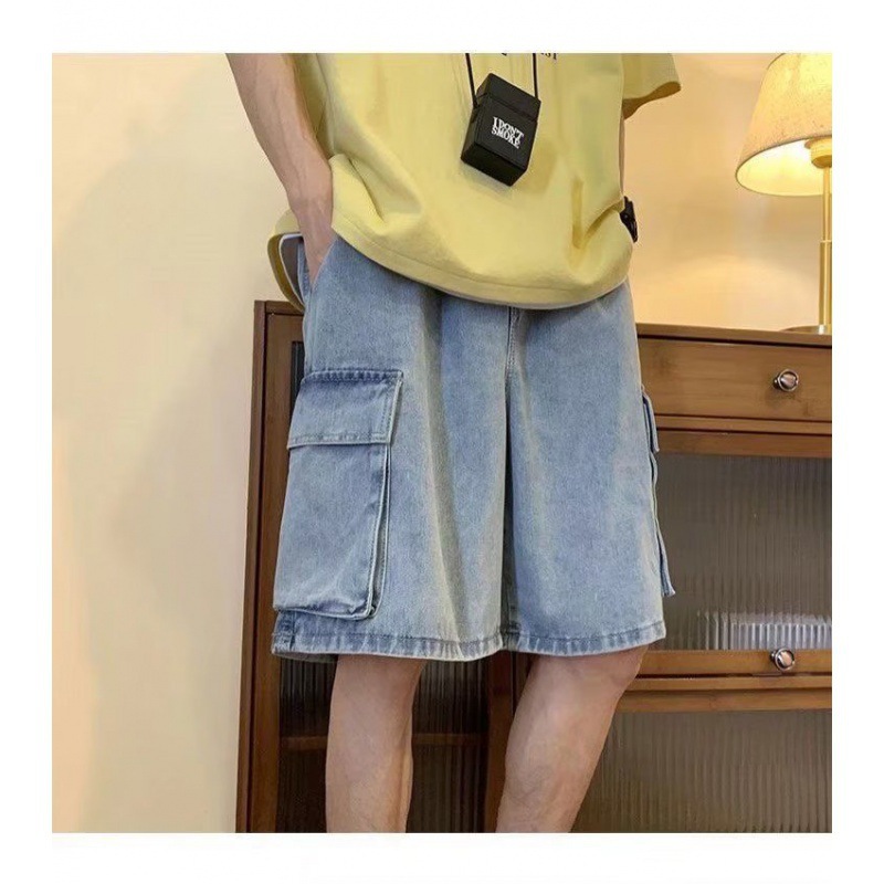 블루 툴링 홍콩 스타일 느슨한 대형 포켓 데님 반바지 남성 여름 얇은 트렌디 브랜드 세척 5 점 캐주얼 바지