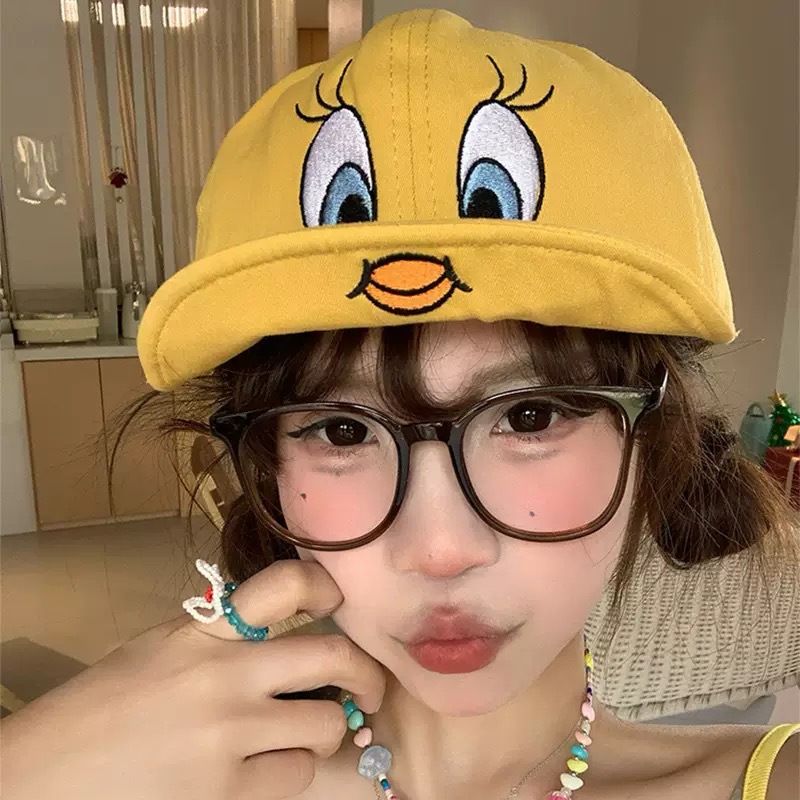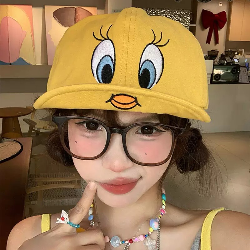 한국 스타일 턴 어라운드 모자 귀여운 만화 작은 노란 오리 자수 야구 모자 학생 올 매치 빅 헤드 캡
