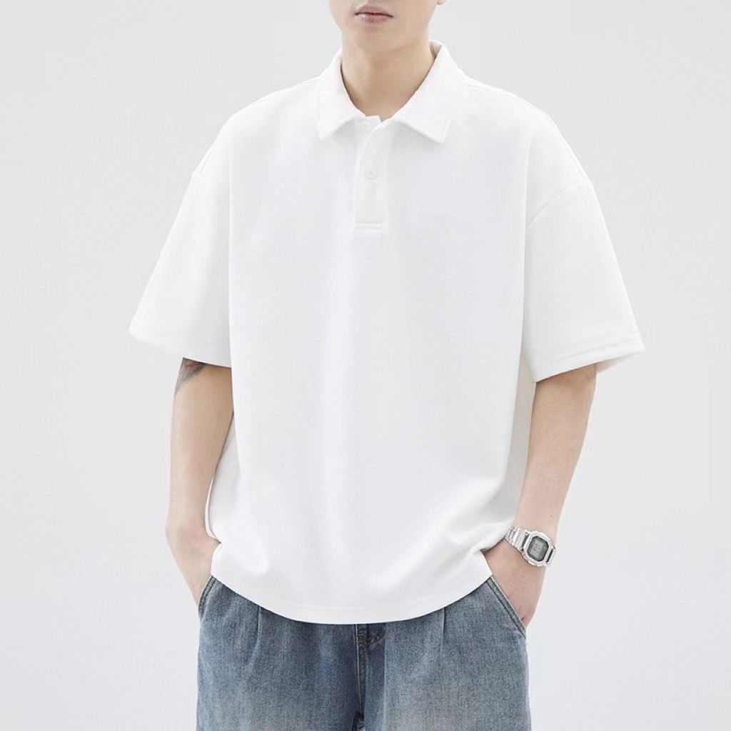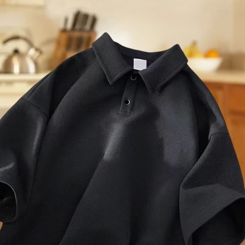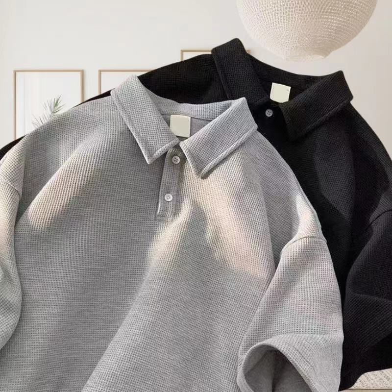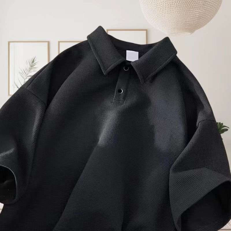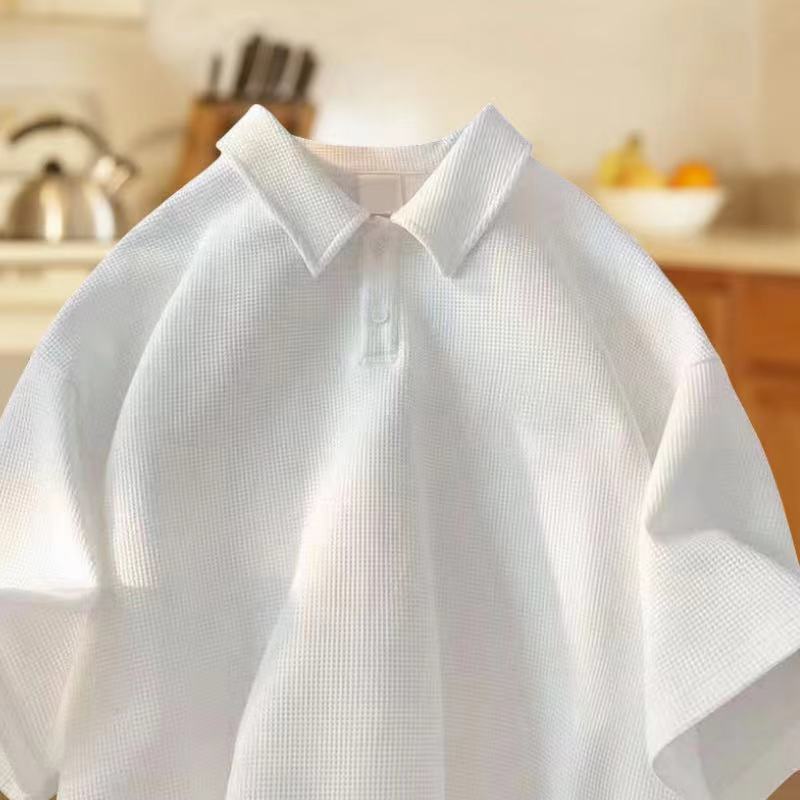 여름 아메리칸 와플 폴로 새로운 다재다능한 트렌디 라펠 루즈 캐주얼 솔리드 컬러 심플 반팔 남성 티셔츠