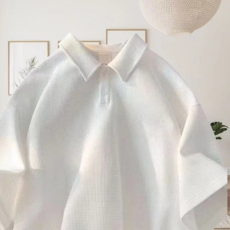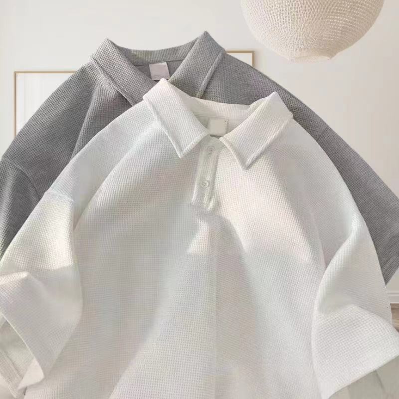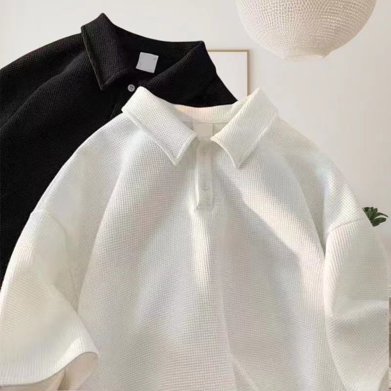 여름 아메리칸 와플 폴로 새로운 다재다능한 트렌디 라펠 루즈 캐주얼 솔리드 컬러 심플 반팔 남성 티셔츠스토어 가기