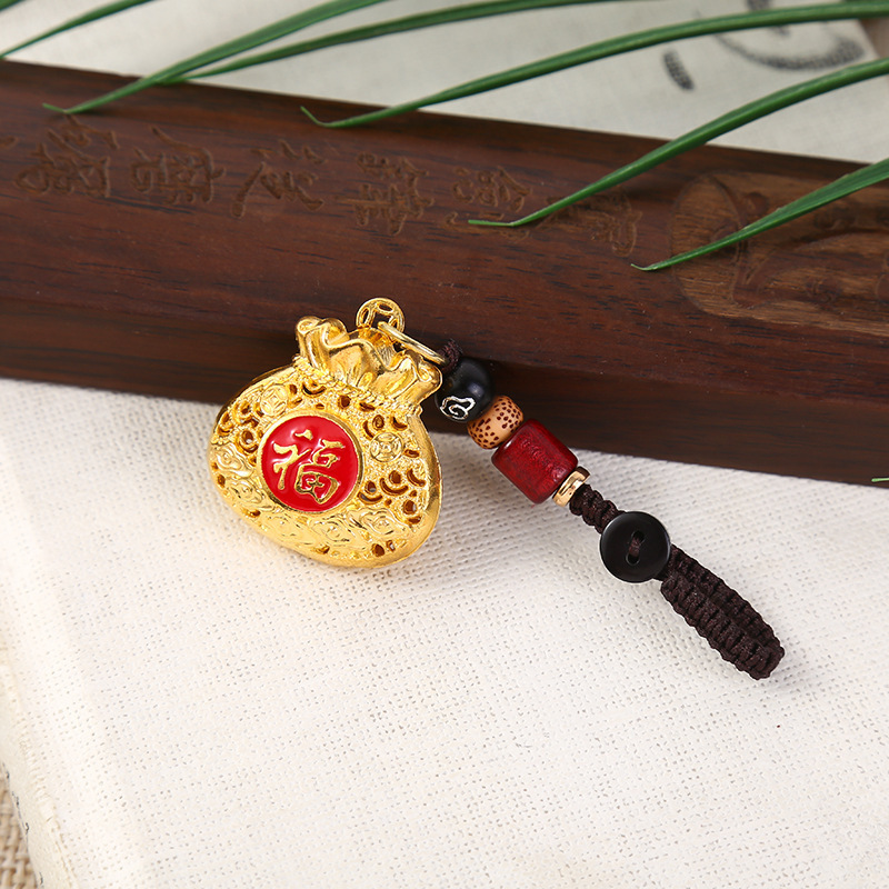 고대 샌드 골드 축복 작은 돈 가방 키 체인 펜던트 목걸이 액세서리 색상 보존 전기 도금 합금 중공 축복 가방