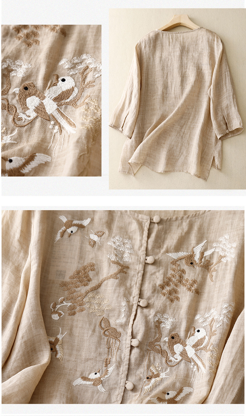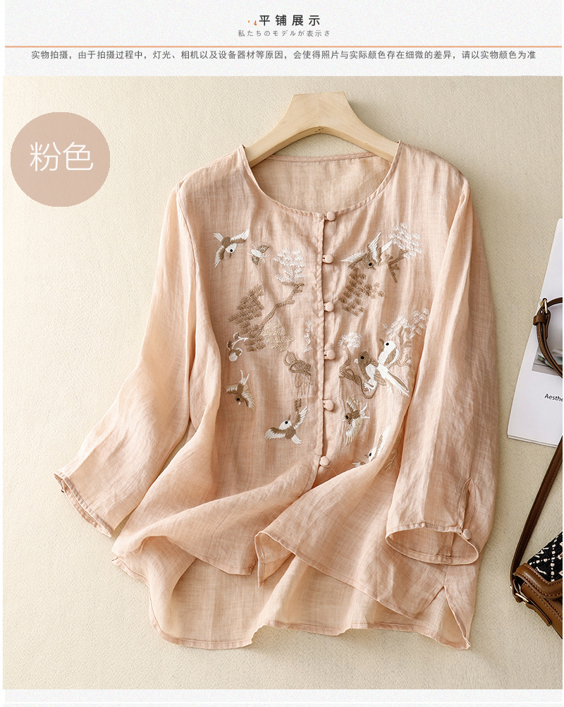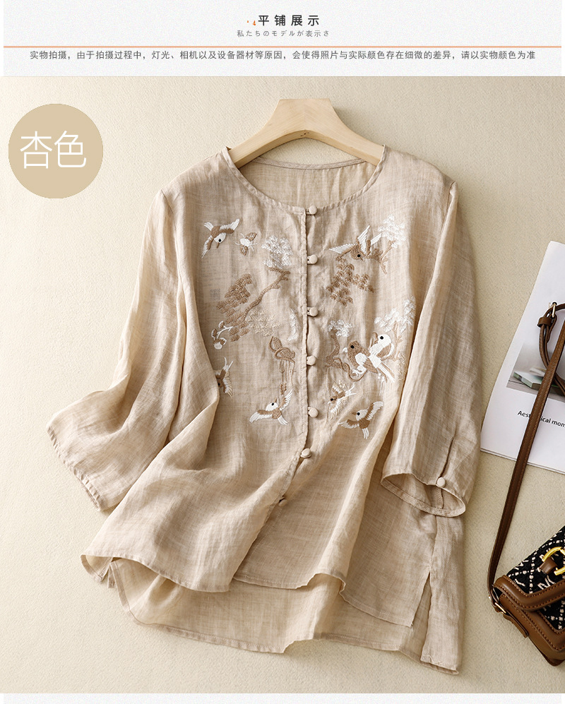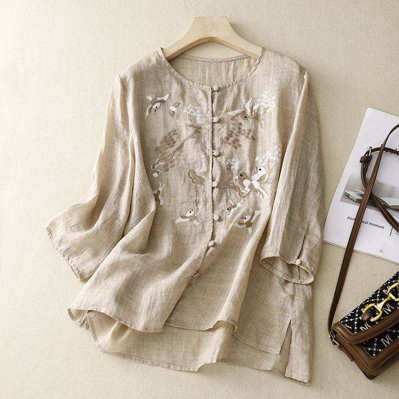 새로운 중국 스타일 여성을위한 2025 여름 새로운 스타일 중년 어머니 하이 엔드 코튼 린넨 캐주얼 자수 셔츠
